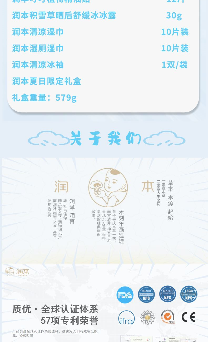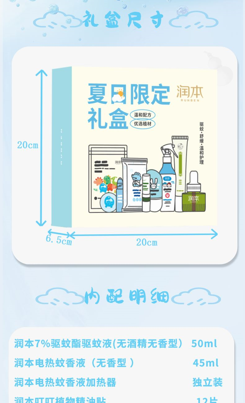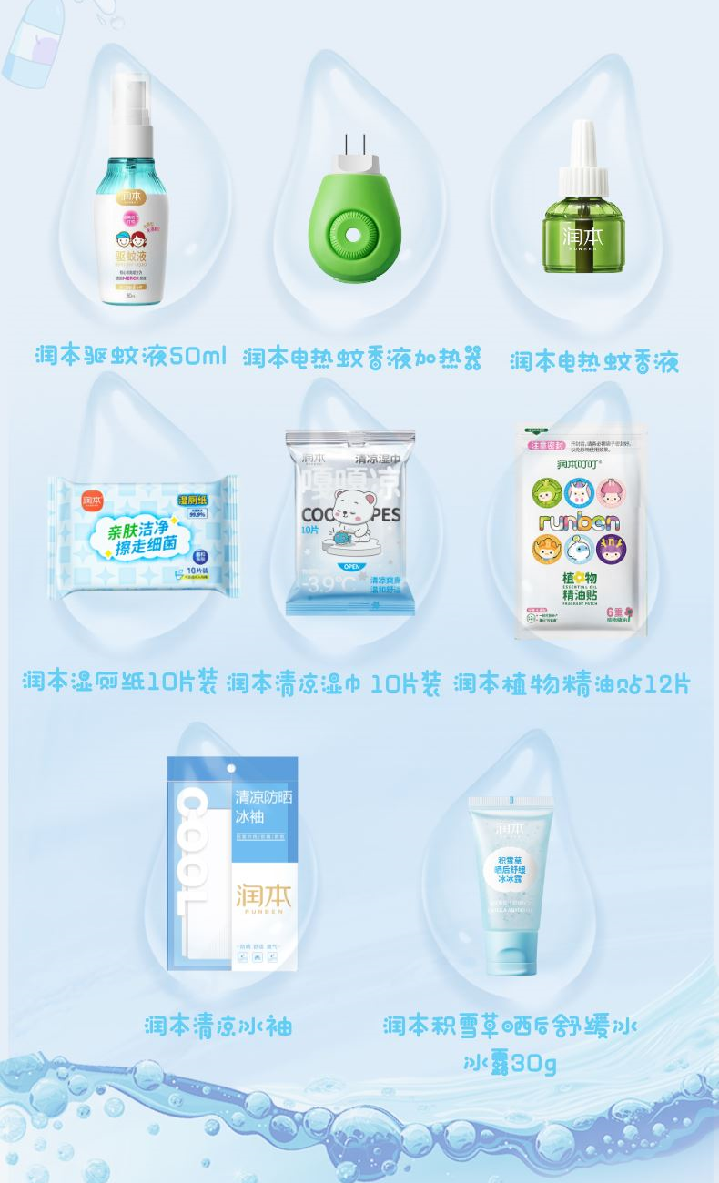 润本7%驱蚊酯驱蚊液(无酒精无香型)50ml 润本电热蚊香液(无香型 )45ml 润本电热蚊香液加热器独立装 润本叮叮植物精油贴12片 润本积雪草晒后舒缓冰冰露30g 润本清凉湿巾10片装 润本湿厕湿巾10片装 润本清凉冰袖1双/袋 润本夏日限定礼盒