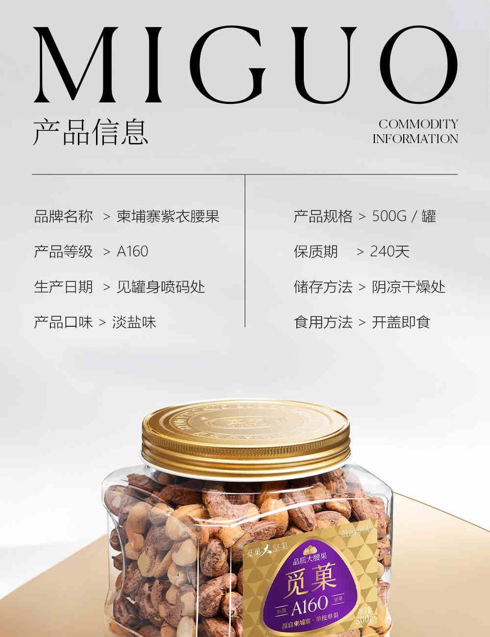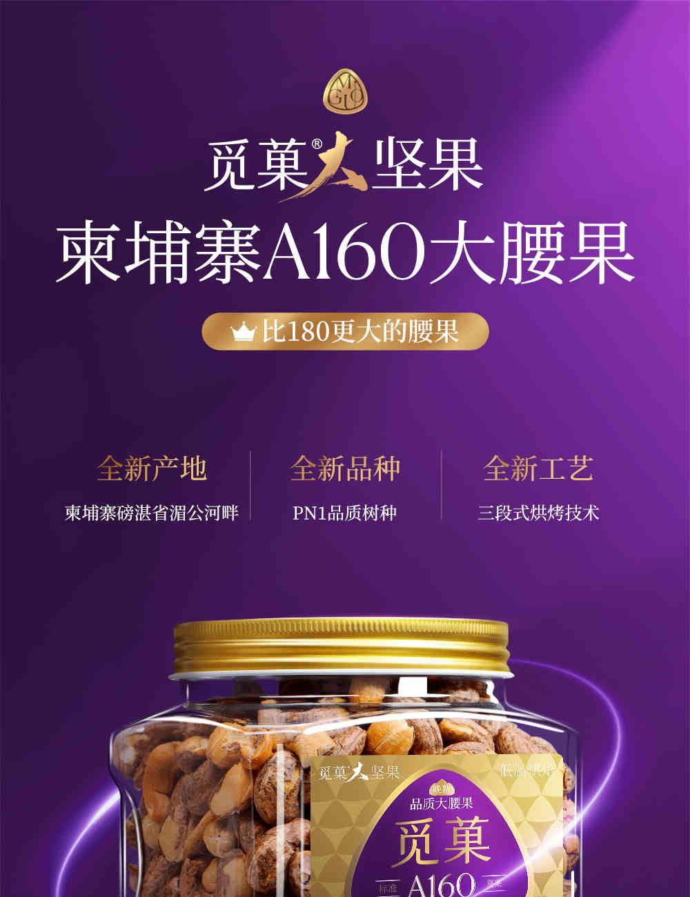 1、热带季风带 全年逾2000小时光合作用 富饶红砂土孕育丰盈大果 2、柬埔寨高产PN1腰果品种 技术更迭见证质量产量双增长 柬埔寨全新树种 果实约160颗/磅 刷新传统颗粒标准 3、低温烘焙锁住醇厚酯香 酥脆绵香 香甜酥脆