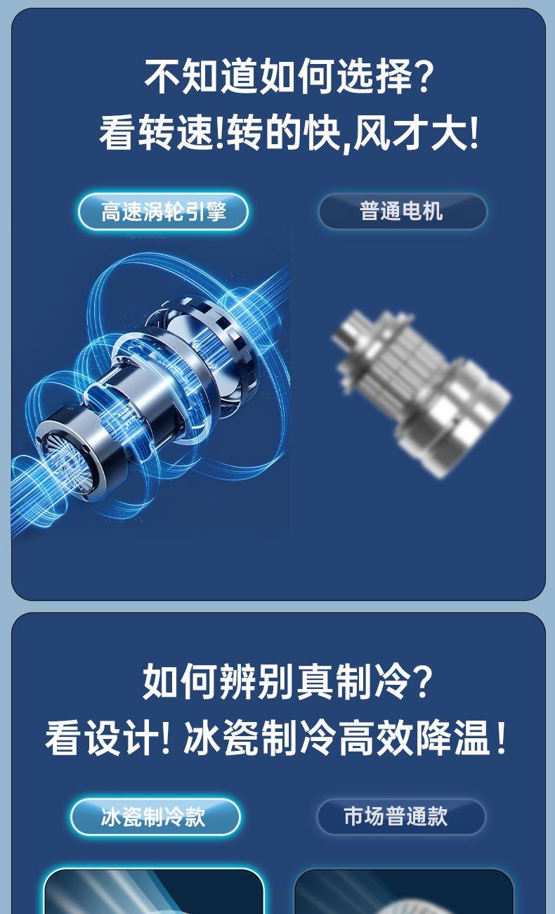 【额定电压】5V 【输出功率】10W 【额定电流】1A 【电池容量】1500mA 【产品材质】ABS+铝合金+电子元件 【单台包装】彩盒包装 【产品尺寸】5.7*6.0*15.7CM 【包装尺寸】6*6*15.8CM 小巧便捷,随身无负担:迷你机身设计,轻便易携带,揣在口袋、放进包包都不占地,出门在外随地都能享受清凉,告别笨重烦恼; 户外降温神器,双重清爽:不仅有强劲风力快速送风,更支持冷敷降温,户外暴晒、运动出汗后,既能吹走燥热,又能冷敷舒缓,双重降温更给力; 高转速无刷机芯,AI智能冰爽:搭载高转速无刷机芯,运转平稳、动力强劲,搭配AI智能控温技术,实现双重降温,冰爽体验更智能、更持久; 18650大容量电池,续航拉满:内置18650大容量电池,告别频繁充电的麻烦,超长时间续航加持,户外出行、全天办公都能轻松覆盖,摆脱电量焦虑。