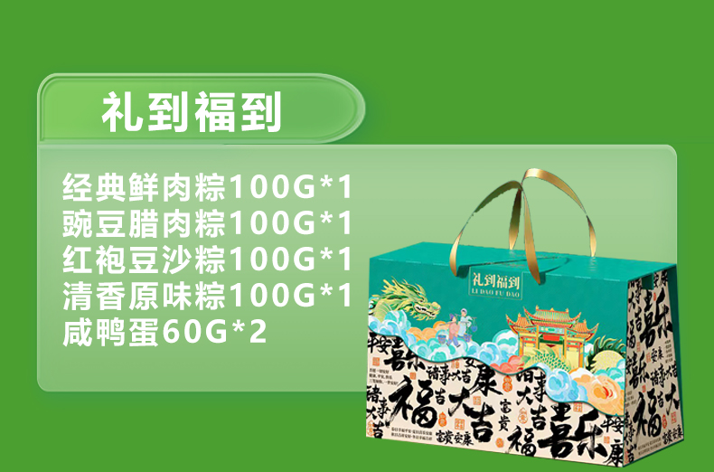 配置: 经典鲜肉粽100g*1 豌豆腊肉粽100g*1 红袍豆沙粽100g*1 清香原味粽100g*1 高邮咸鸭蛋60g*2 推荐理由: 玉粽袭香,咸甜兼备,一盒藏尽端午雅意。 经典鲜肉、豌豆腊肉,咸香醇厚,肉汁浸米;红袍豆沙、清香原味,软糯清甜,米香绵长。更配两枚高邮咸鸭蛋,松沙流油,咸鲜适口。 馈友赠亲,皆是雅致心意;佳节同享,共品传统风味。