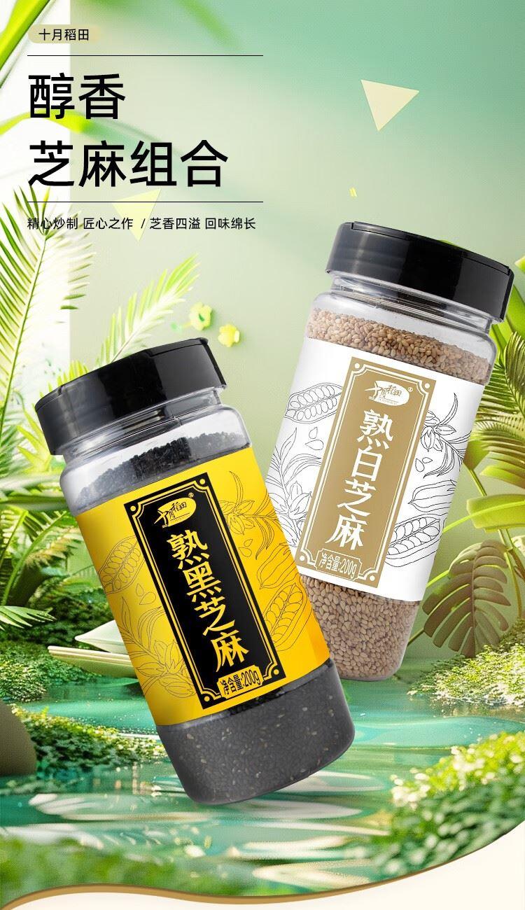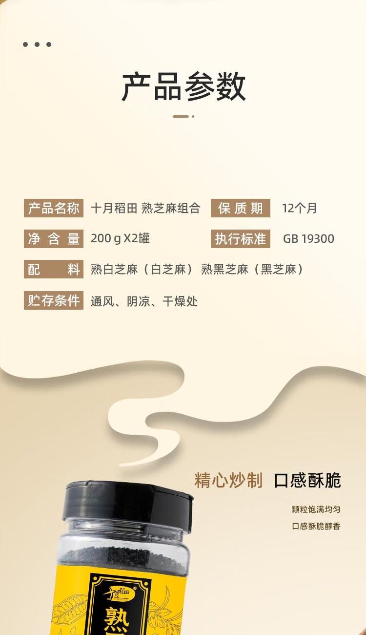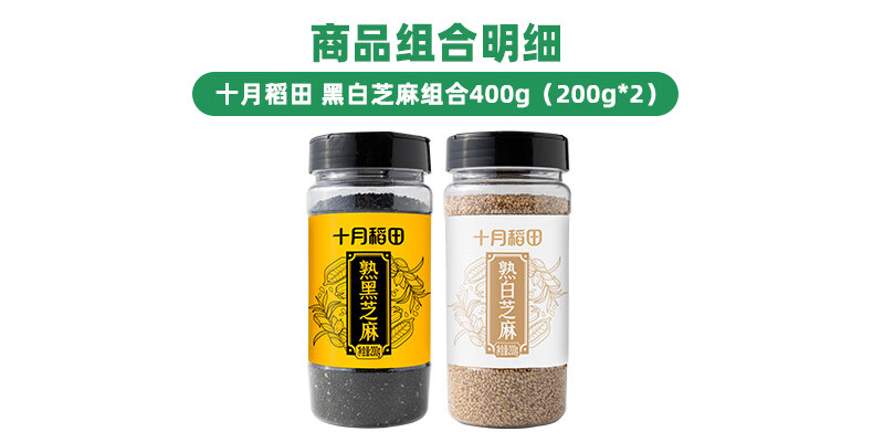 商品:十月稻田 黑白芝麻组合 规格:400g(200g2) 保质期:12个月 特点:醇香芝麻组合,精心炒制,口感酥脆。芝香四溢,回味绵长。