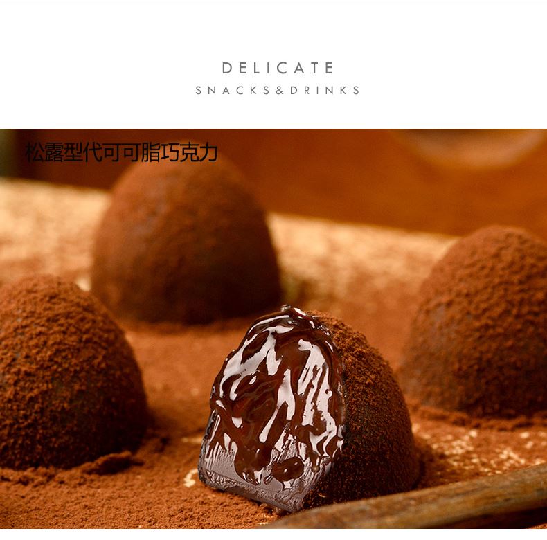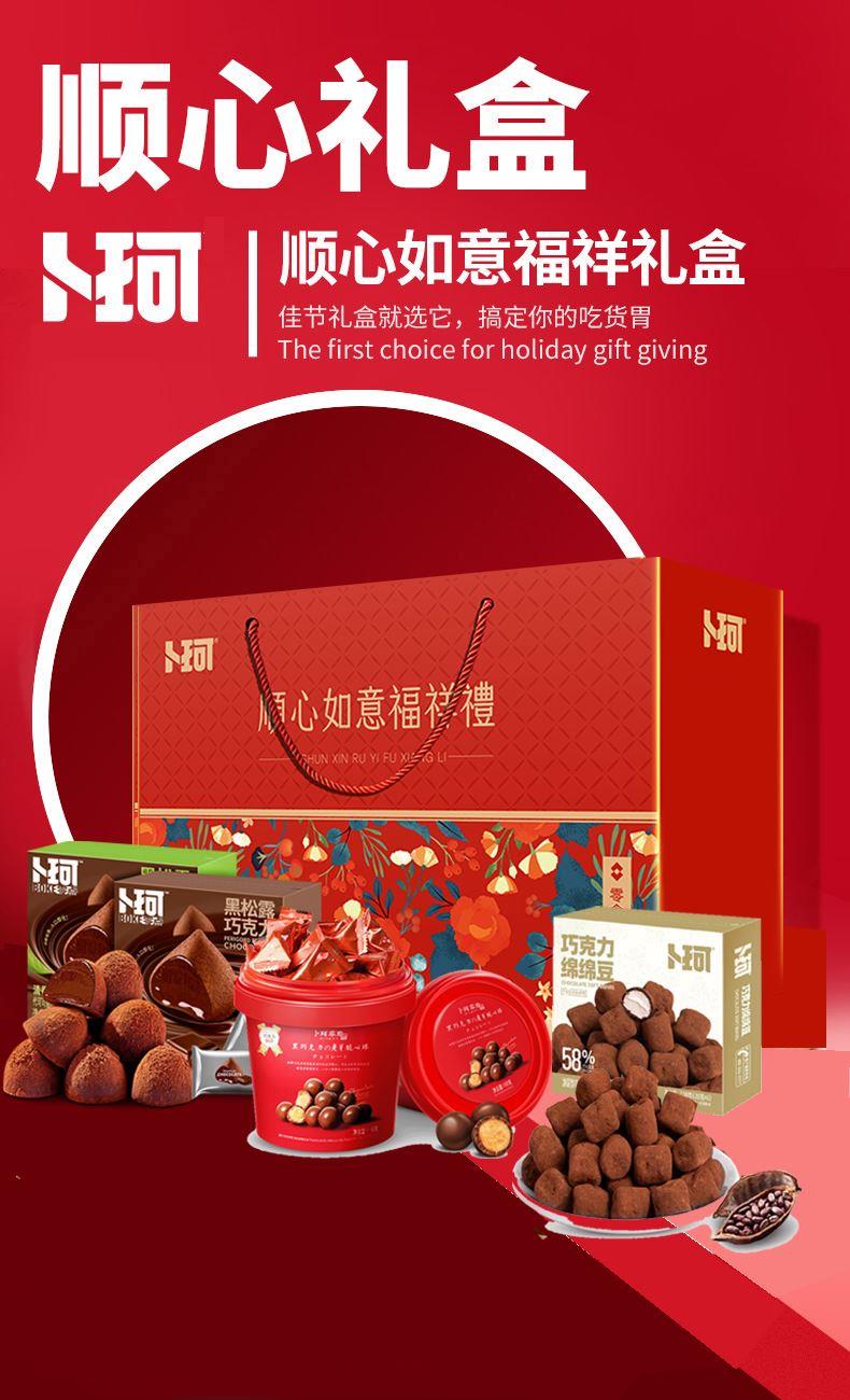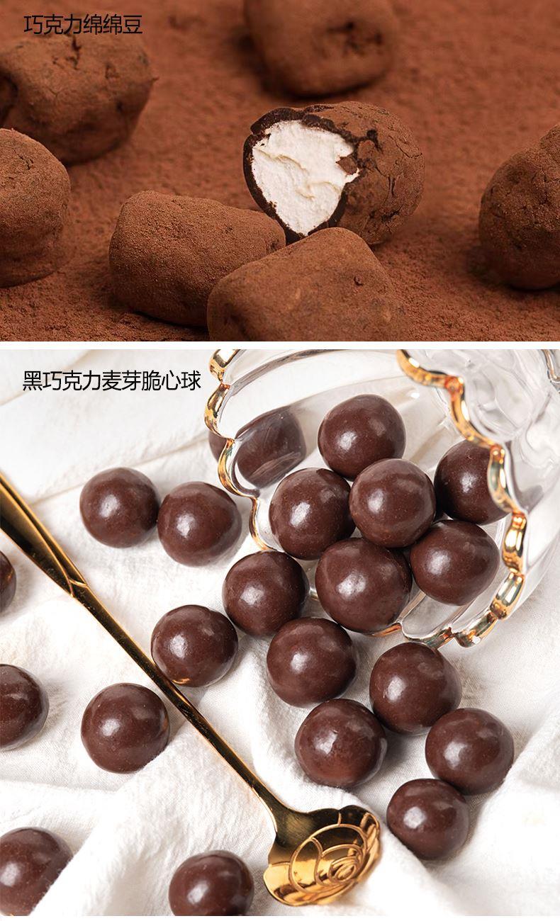 克重:726克 内配: 1、松露型代可可脂巧克力268克×1盒(清香抹茶味、可可原味两口味随机) 2、卜珂巧克力绵绵豆120g×1盒 3、卜珂黑巧克力麦芽脆心球138g×1桶 4、卜珂零點速融代可可脂巧克力100g×2袋(清香抹茶味、可可原味、酱香榛子味三口味随机) 礼盒规格:38*27*13.5cm 保质期:12月