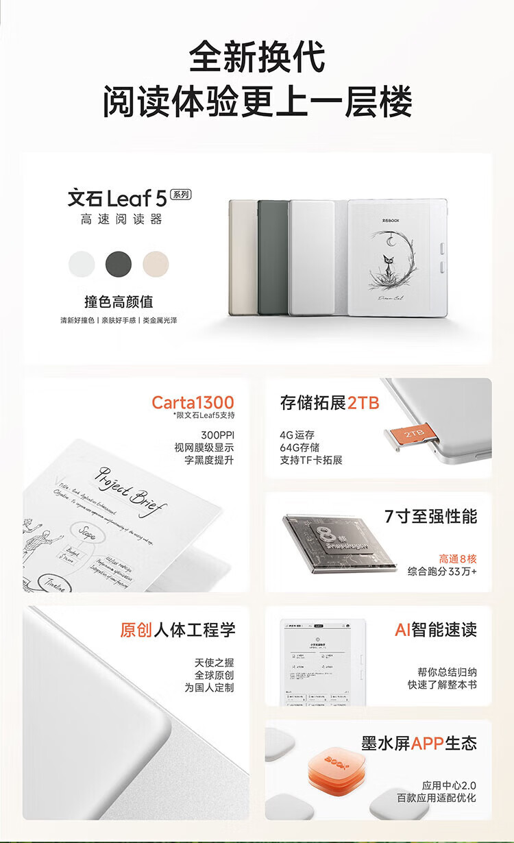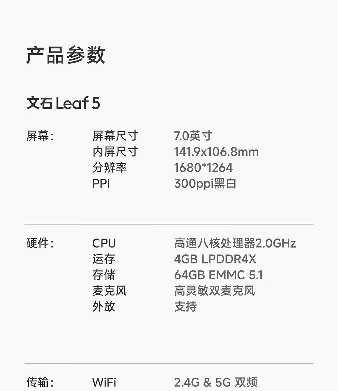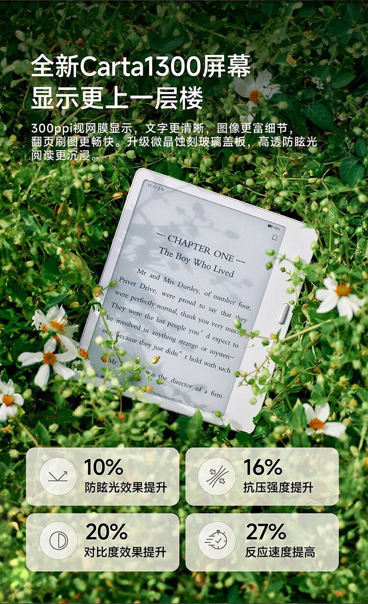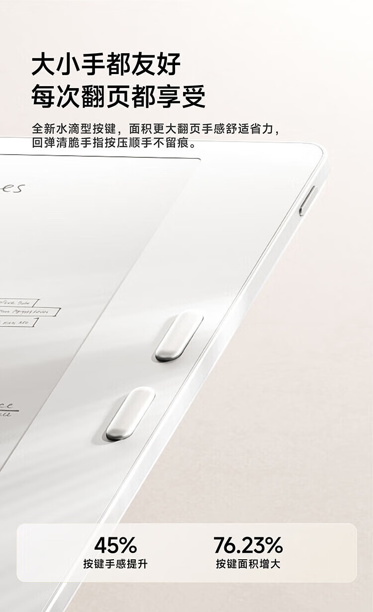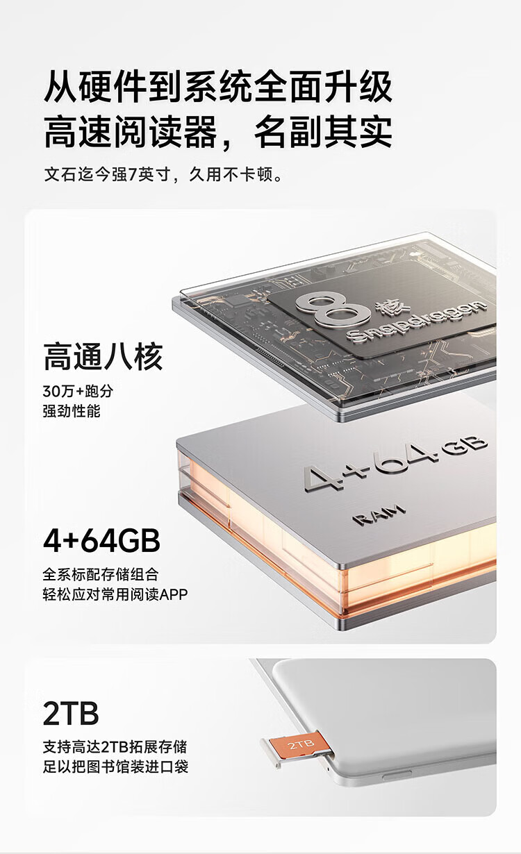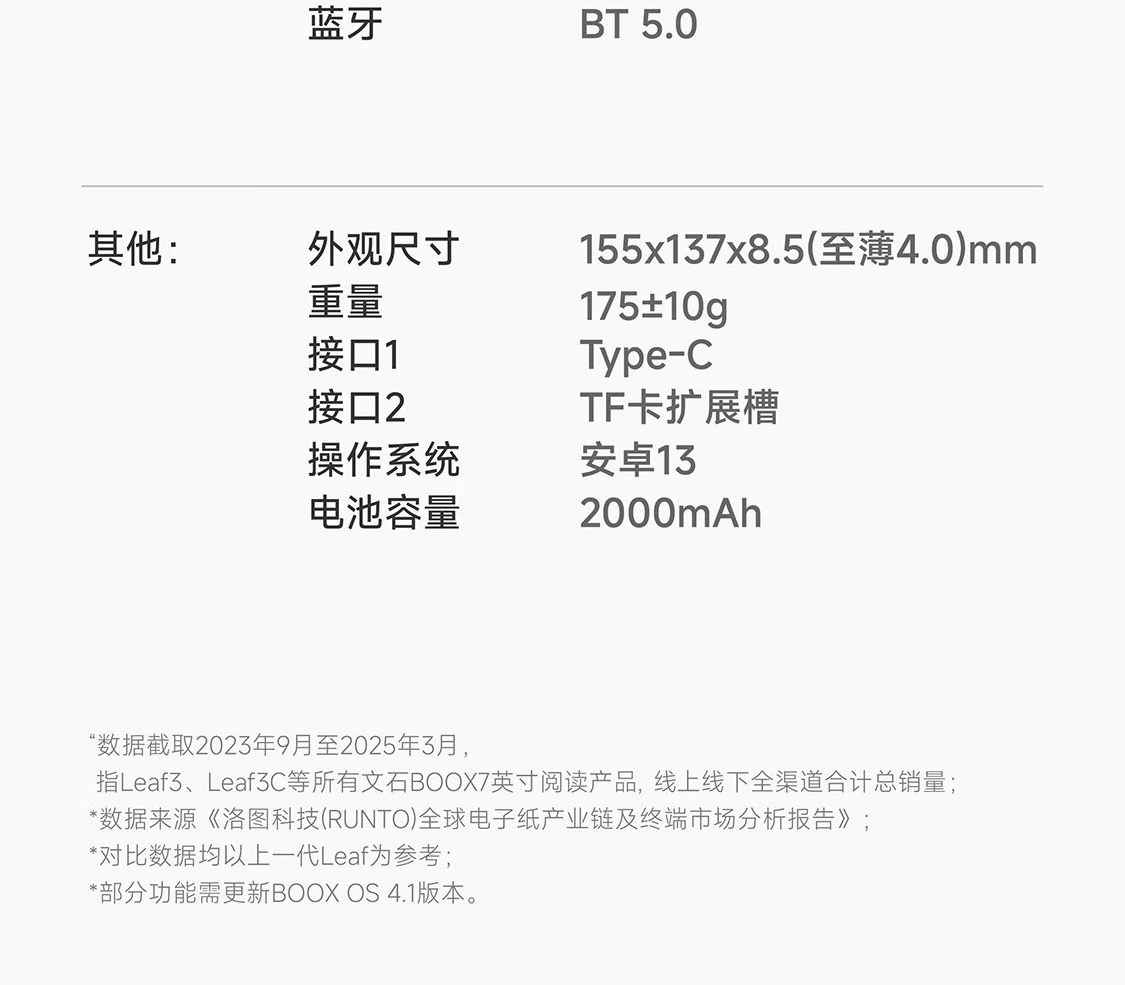 屏幕尺寸:7 分辨率:1680x1264;300ppi CPU:八核2.0GHz 配置:4GB+64GB WIFI:2.4G&5G双频 蓝牙:BT5.0 操作系统:安卓13 电池容量:2000mAh 重量:175g 1.7英寸至强性能,高通8核综合跑分30万+ 2.原创人体工学设计,天使之握 更适合国人的设计 3.鹅卵石般舒适的抓握感,全面贴合手掌对手指的支撑也更好,久握不累手 4.全新水滴型按键,面积更大翻页手感舒适省力,回弹清脆手指按压顺手不留痕 5.300ppi视网膜级显示,文字更清晰,图像更富细节,翻页刷图更畅快。升级微晶蚀刻玻璃盖板,高透防眩光阅读更沉浸