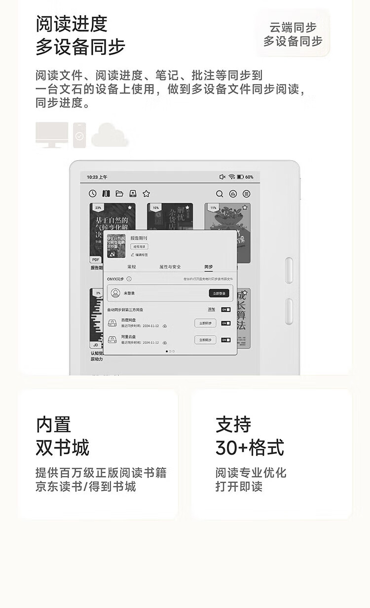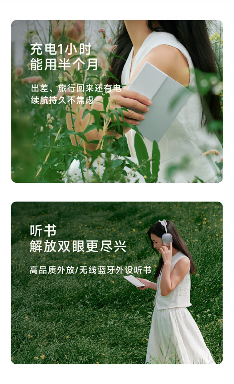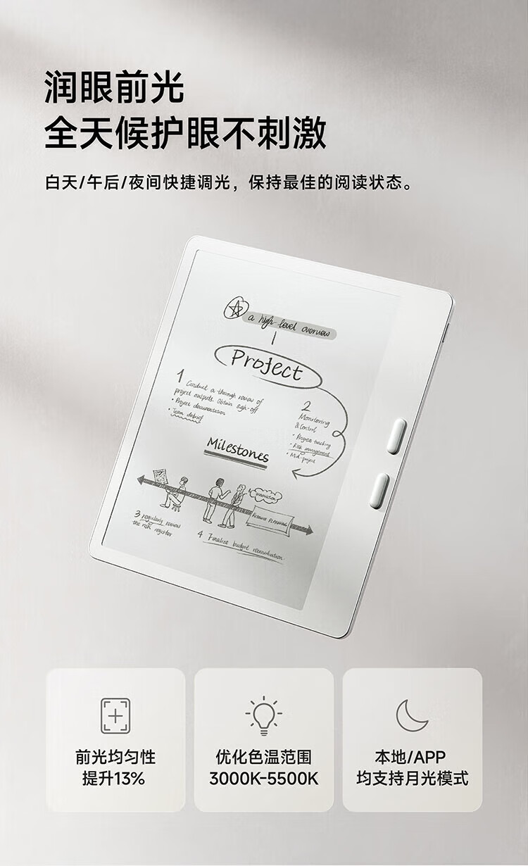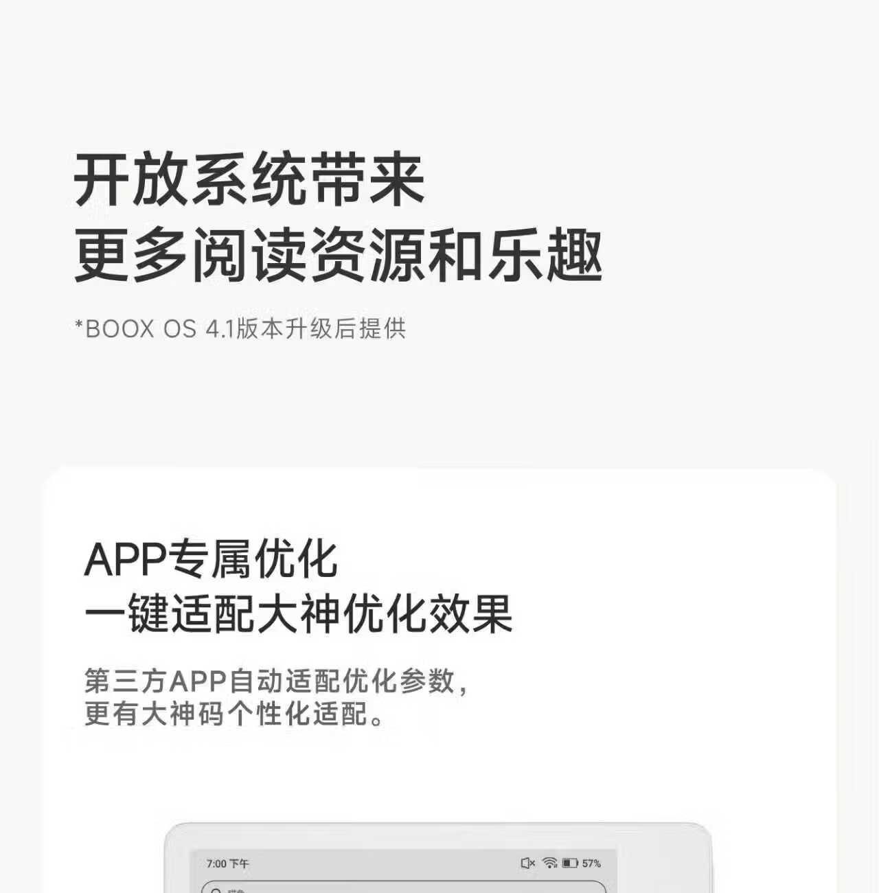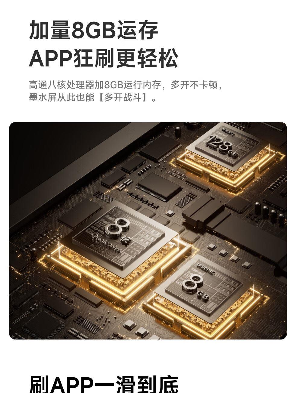 屏幕尺寸:7 分辨率:1680x1264;300ppi CPU:八核2.0GHz 配置:4GB+64GB WIFI:2.4G&5G双频 蓝牙:BT5.0 操作系统:安卓13 电池容量:2000mAh 重量:175g 1.7英寸至强性能,高通8核综合跑分30万+ 2.原创人体工学设计,天使之握 更适合国人的设计 3.鹅卵石般舒适的抓握感,全面贴合手掌对手指的支撑也更好,久握不累手 4.全新水滴型按键,面积更大翻页手感舒适省力,回弹清脆手指按压顺手不留痕 5.300ppi视网膜级显示,文字更清晰,图像更富细节,翻页刷图更畅快。升级微晶蚀刻玻璃盖板,高透防眩光阅读更沉浸