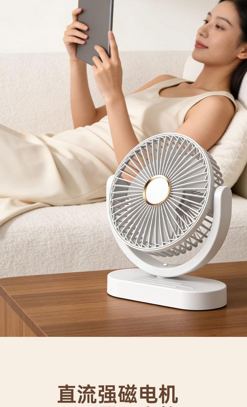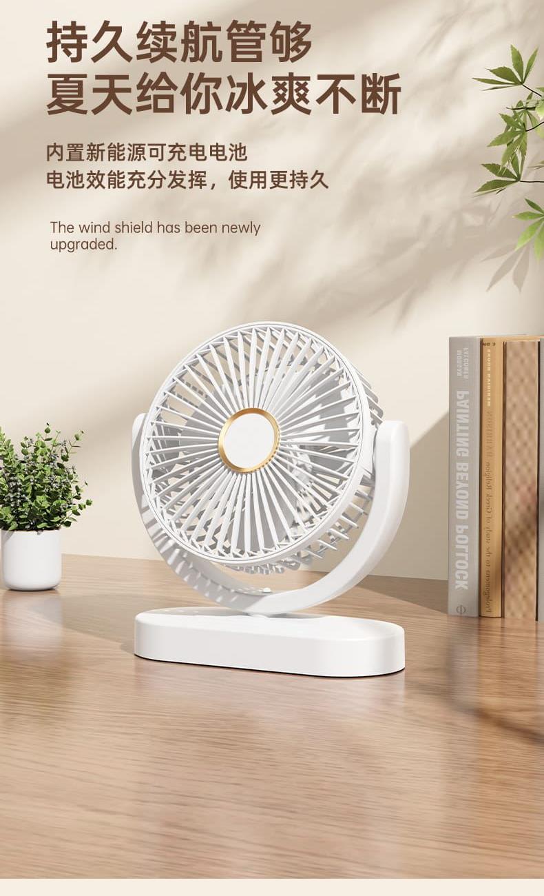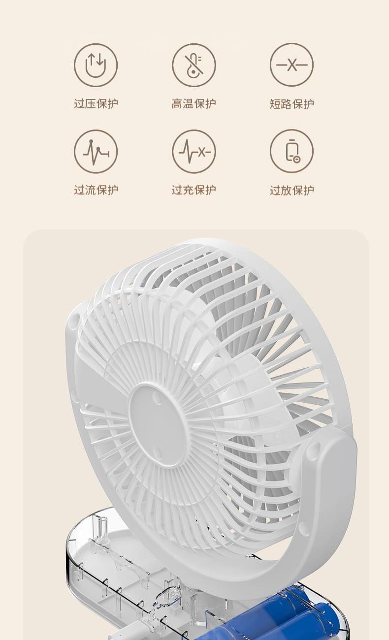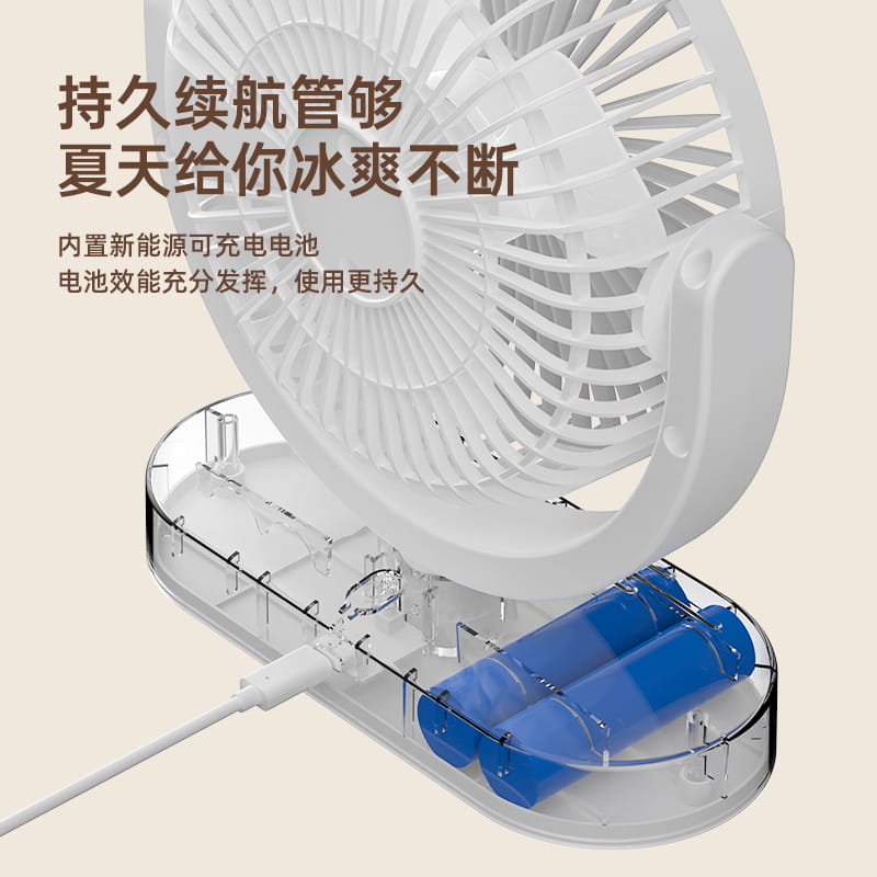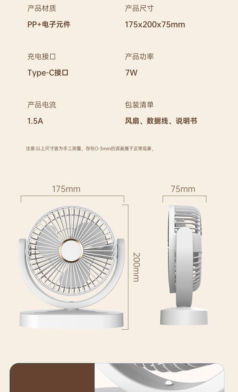 电池容量:1800mAh 产品重量:260g/344g 产品尺寸:20*7.5*17.5cm 包装尺寸:18*8.5*20.5cm 整箱数量:74*43.8*42.5cm/40个/15kg 产品颜色:白色、粉色、蓝色、卡其色 档风可调节,8英寸大网罩 内置电池,静音无刷电机,便携使用