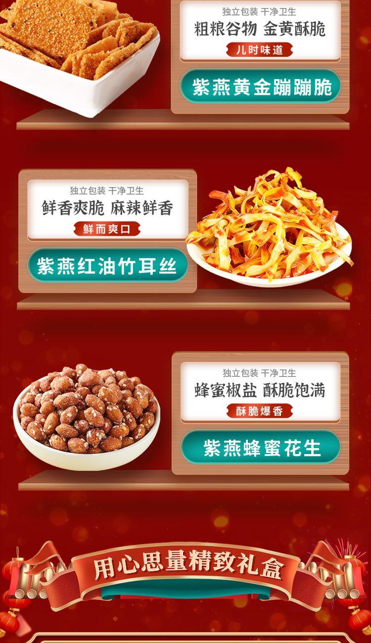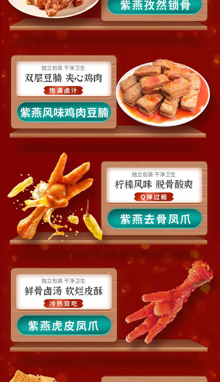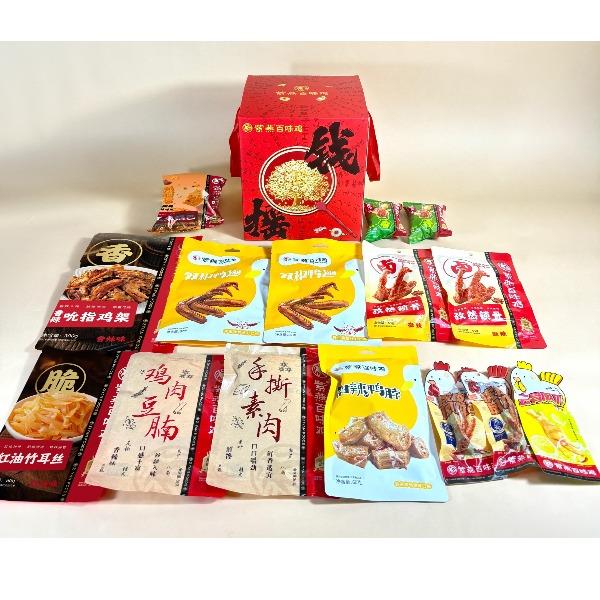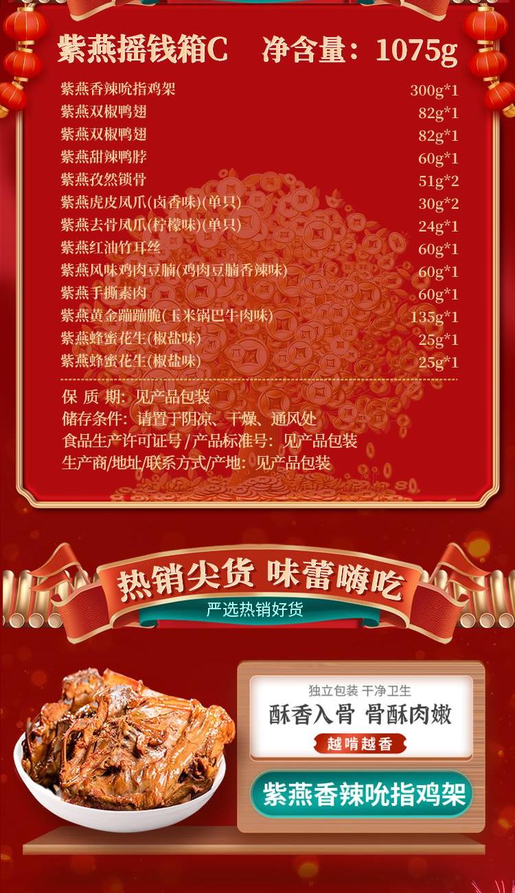 紫燕香辣吮指鸡架300g*1 紫燕双椒鸭翅82g*2 紫燕甜辣鸭脖60g*1 紫燕孜然锁骨51g*2 紫燕虎皮凤爪(卤香味)(单只)30g*2 紫燕去骨凤爪(柠檬味)(单只)24g*1 紫燕红油竹耳丝60g*1 紫燕风味鸡肉豆腩(鸡肉豆腩香辣味)60g*1 紫燕手撕素肉60g*1 紫燕黄金蹦蹦脆(玉米锅巴牛肉味)135g*1 紫燕蜂蜜花生(椒盐味)25g*2 礼盒+组装+外盒