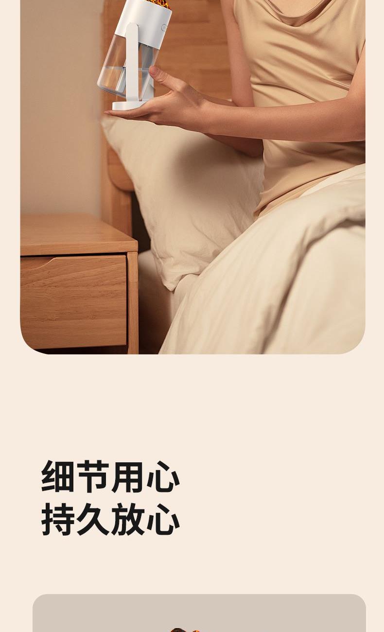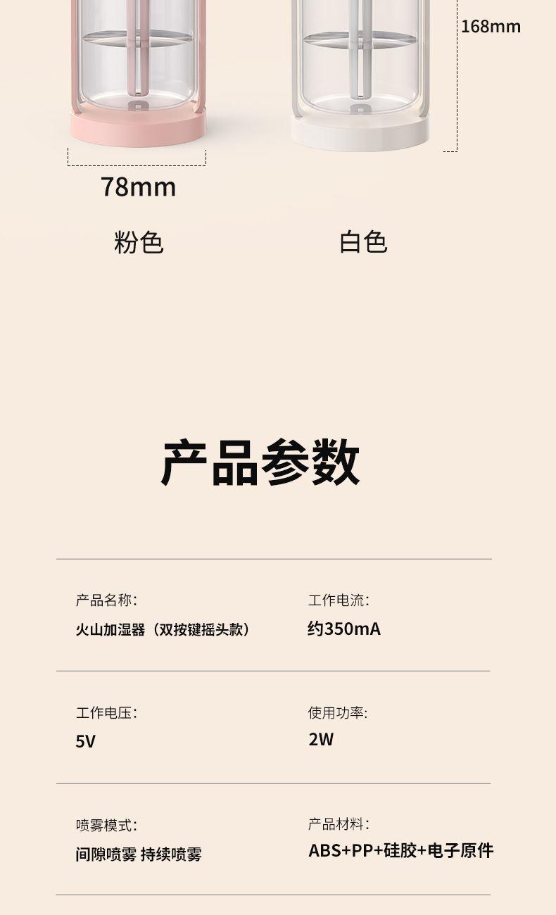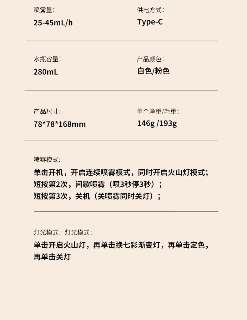 产品材质:ABS+PP+硅胶+电子元件 产品尺寸:7.8*7.8*16.8cm 产品颜色:白 粉 净 重:146g 工作电压:DC5V/1.0A 喷 雾 量:25-45ml/h 水箱容量:280ML 工作时间:4-8小时
