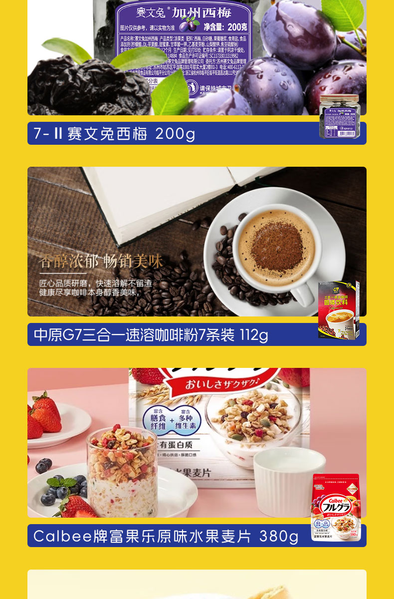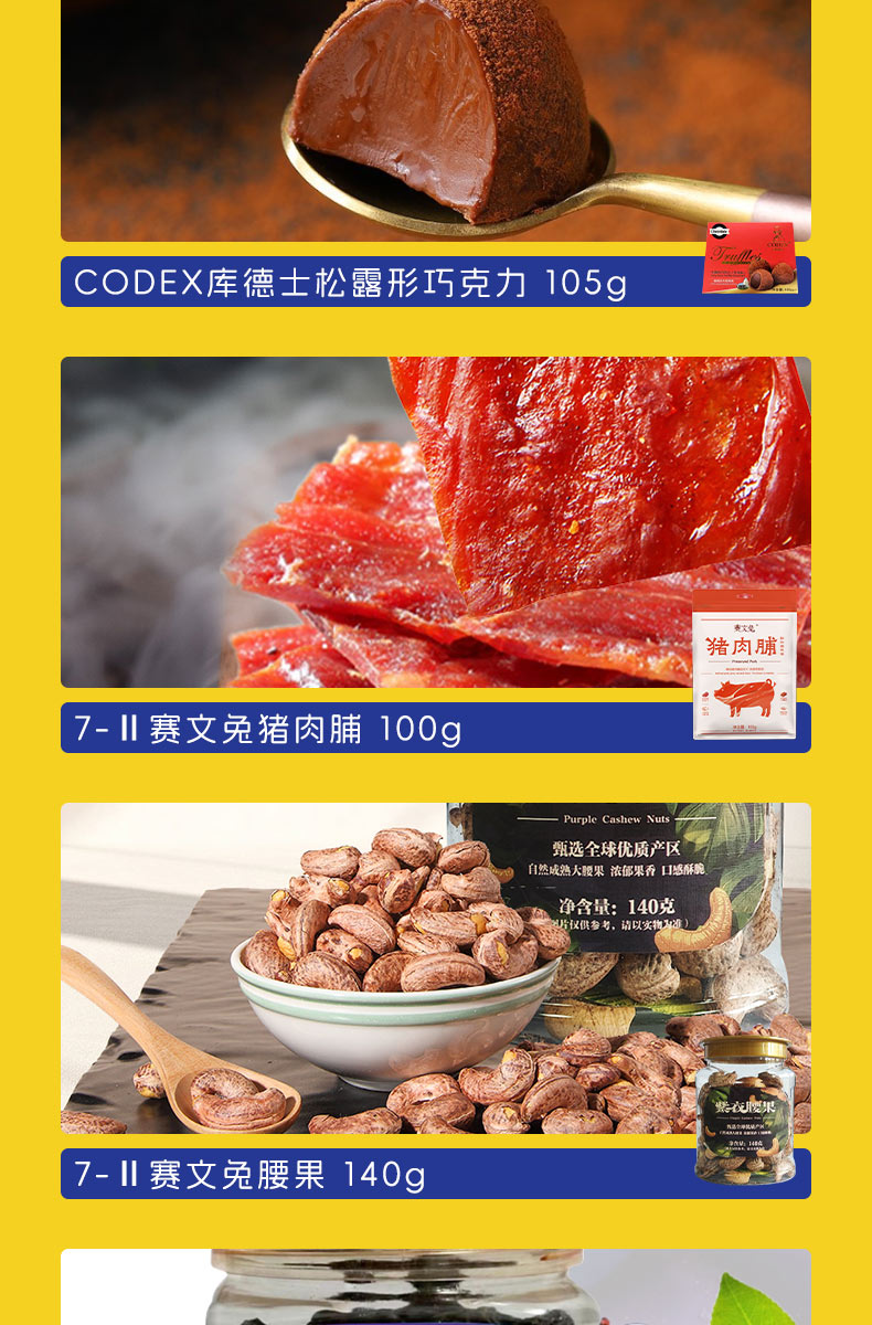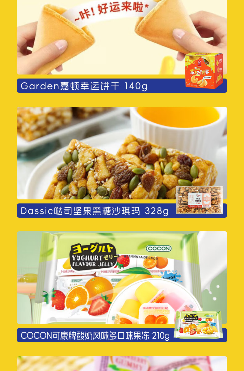 加勒比海盗混合味牛肉粒219g 田园猎手香脆猪肉松条90g CODEX库德士松露形巧克力105g 7-II赛文兔猪肉脯100g 7-II赛文兔腰果140g 7-II赛文兔西梅200g 中原G7三合一速溶咖啡粉7条(112g)装 Calbee牌富果乐原味水果麦片(即食谷物)-380g Garden 嘉顿幸运饼干140g Dassic 哒司坚果黑糖沙琪玛328g COCON 可康牌酸奶风味多口味果冻210g COCON 可康牌软糖100g MIE KREMEZZ 派对装炒面风味小鸡干脆面(18g*5) 超友味海苔米果378g FINUTE蒜味虾片 240g Danisa皇冠丹麦曲奇饼干罐装200g MAXICORN烧烤味玉米片140g MissXiGon 西贡小姐果蔬干100g 花生酱夹心薄饼干368g ZEK每日夹心海苔(芝麻味)60g