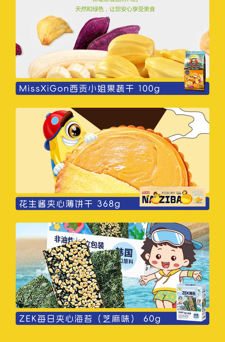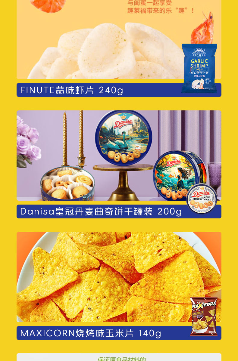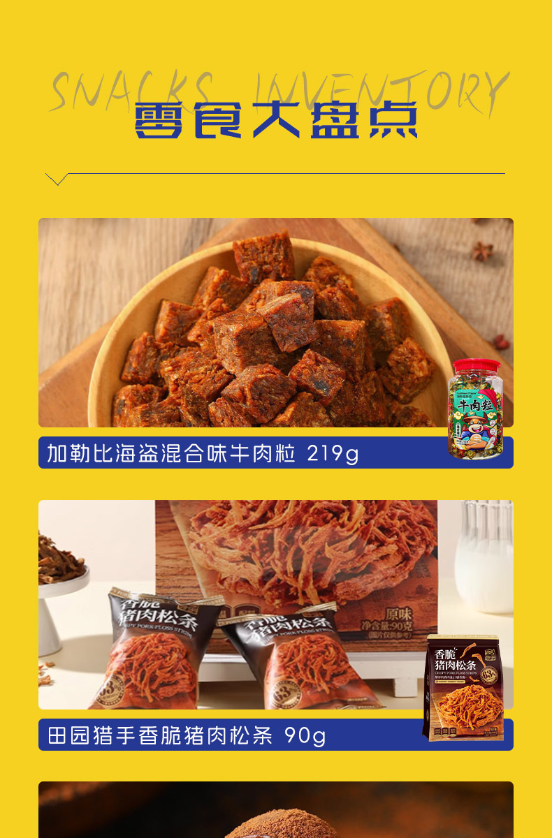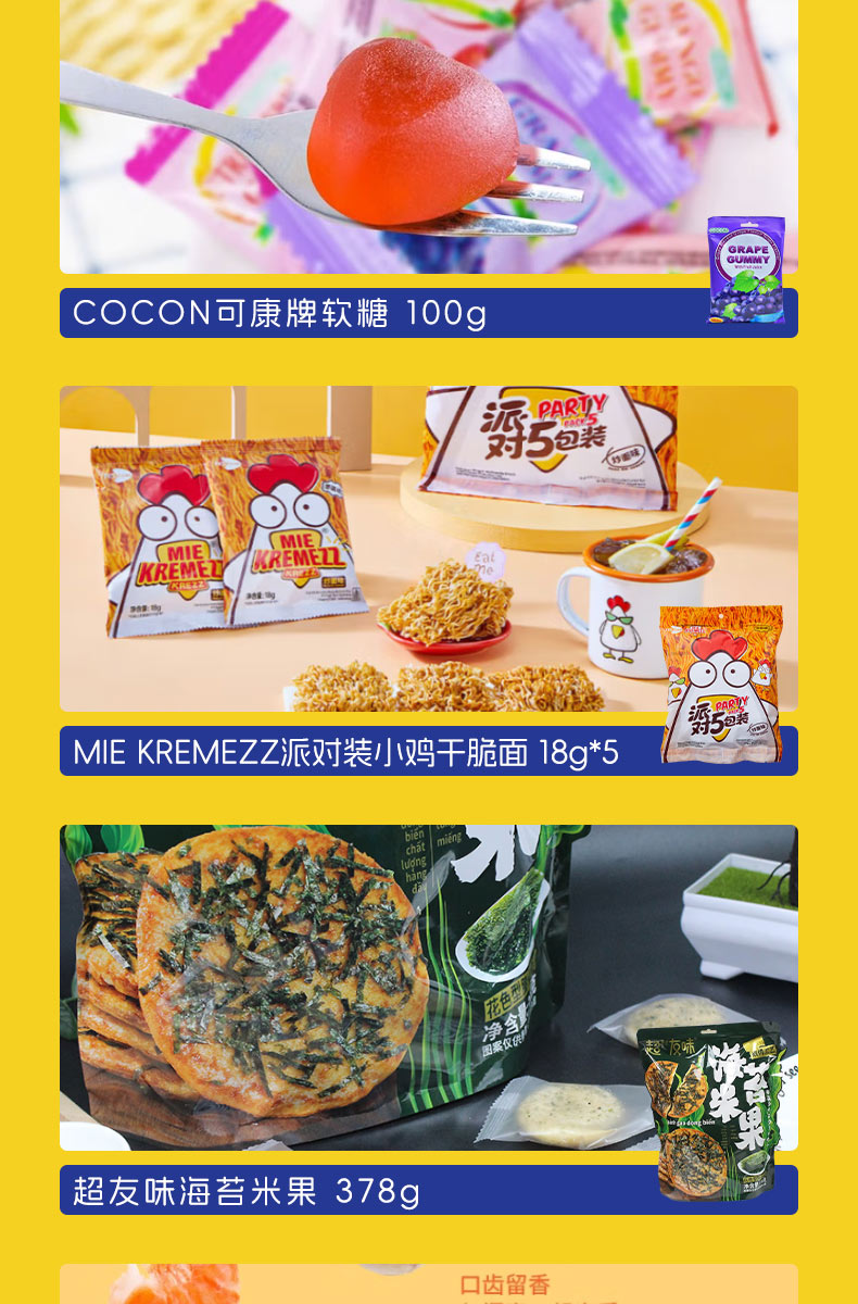 加勒比海盗混合味牛肉粒219g 田园猎手香脆猪肉松条90g CODEX库德士松露形巧克力105g 7-II赛文兔猪肉脯100g 7-II赛文兔腰果140g 7-II赛文兔西梅200g 中原G7三合一速溶咖啡粉7条(112g)装 Calbee牌富果乐原味水果麦片(即食谷物)-380g Garden 嘉顿幸运饼干140g Dassic 哒司坚果黑糖沙琪玛328g COCON 可康牌酸奶风味多口味果冻210g COCON 可康牌软糖100g MIE KREMEZZ 派对装炒面风味小鸡干脆面(18g*5) 超友味海苔米果378g FINUTE蒜味虾片 240g Danisa皇冠丹麦曲奇饼干罐装200g MAXICORN烧烤味玉米片140g MissXiGon 西贡小姐果蔬干100g 花生酱夹心薄饼干368g ZEK每日夹心海苔(芝麻味)60g