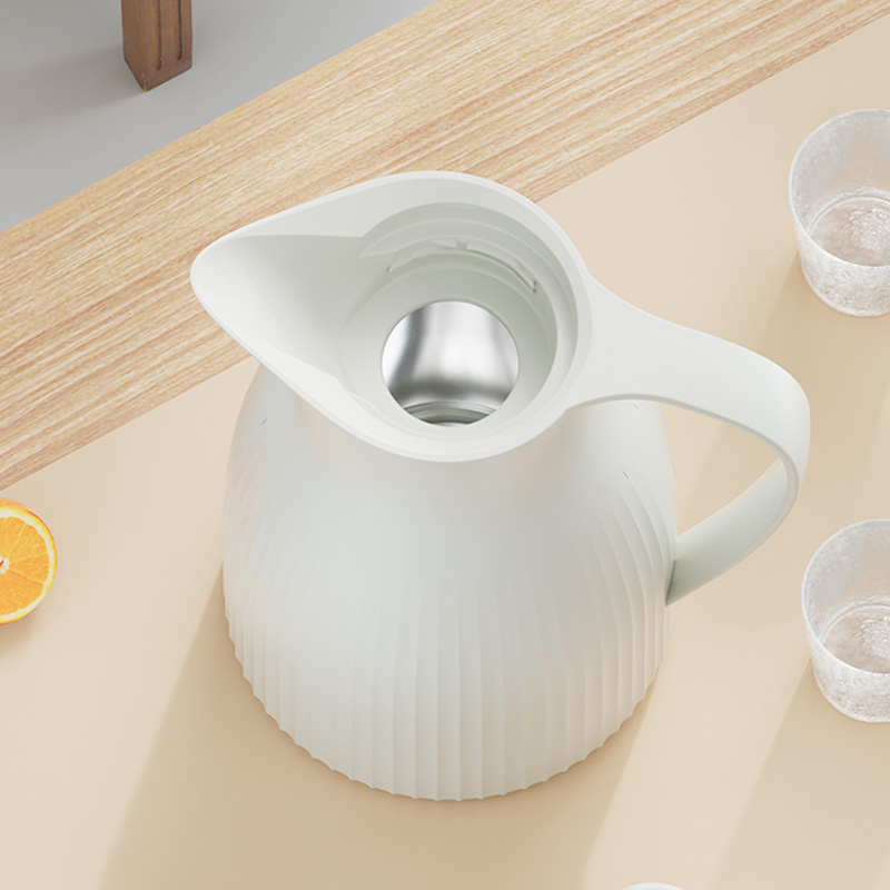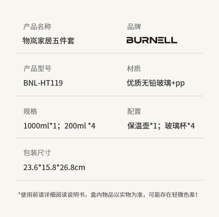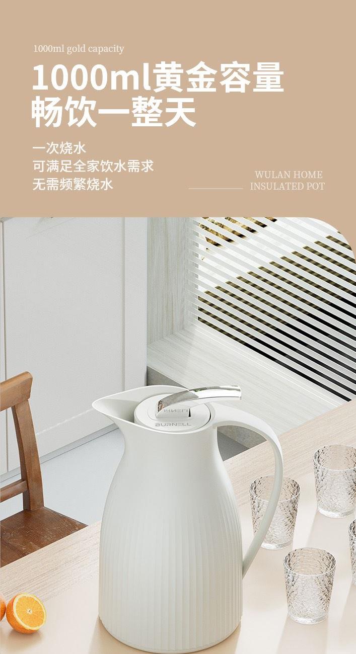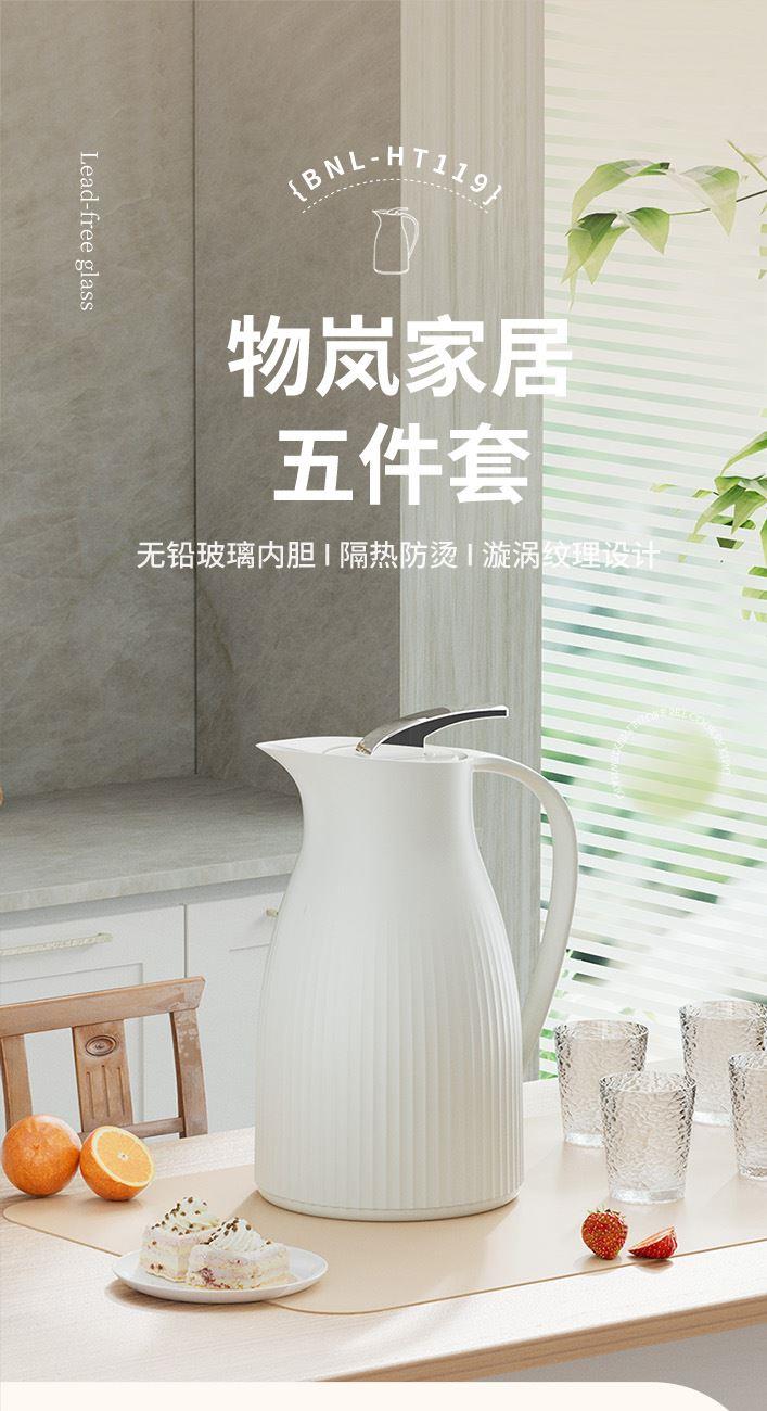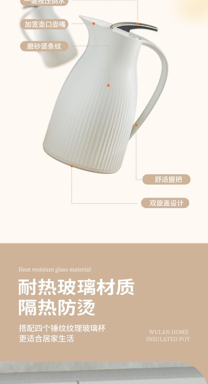 材 质:优质无铅玻璃+食品级pp 配 置:保温壶*1;玻璃杯*4 规 格:1000ml;200ml *4 颜 色:烟云白 装 箱 数:12pcs/箱