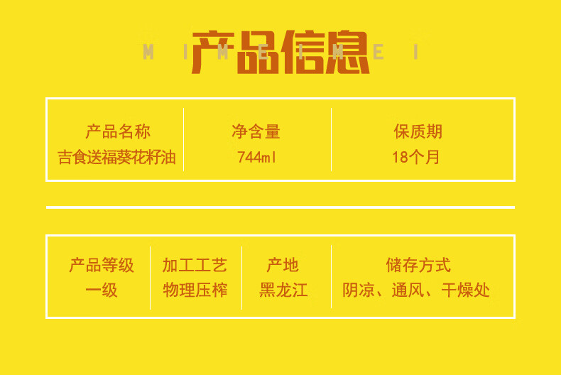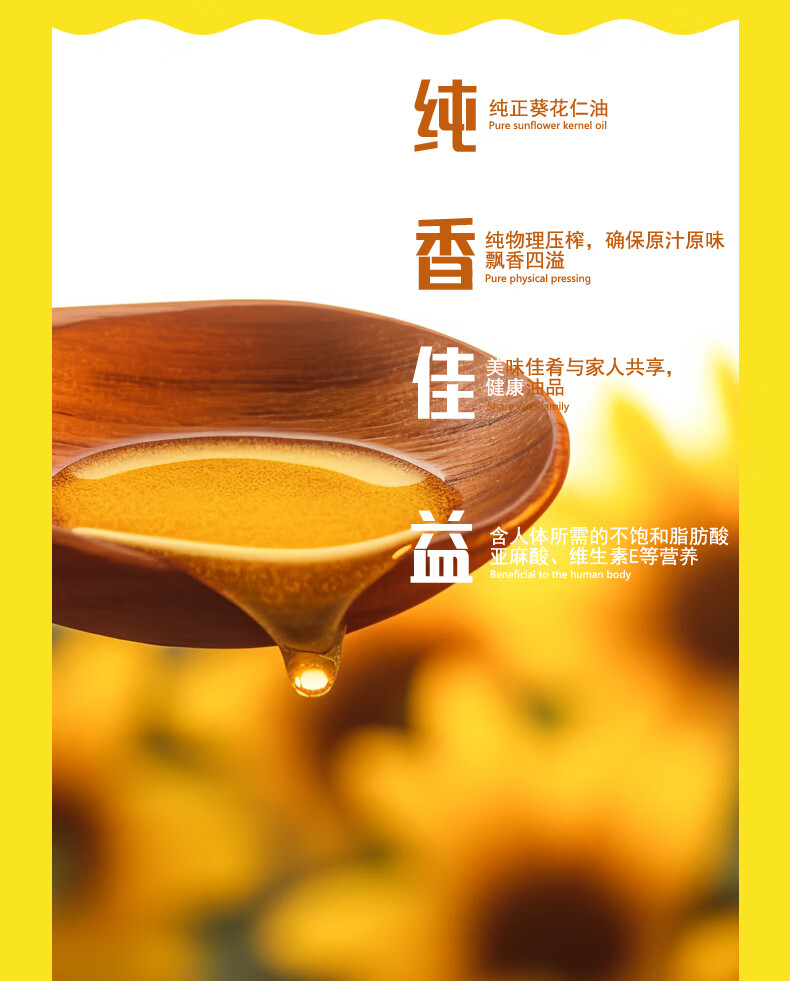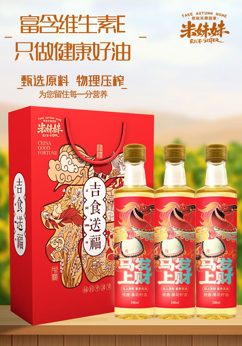 1.葵花籽油属于低脂油类,表面看色泽金黄、清明透亮、口感纯正。 2.葵花籽油中亚油酸含量高,其中不含芥酸、黄曲霉素等有害物质,食用安全健康。 3.精美手提盒包装 吉食送福,福到中国年。