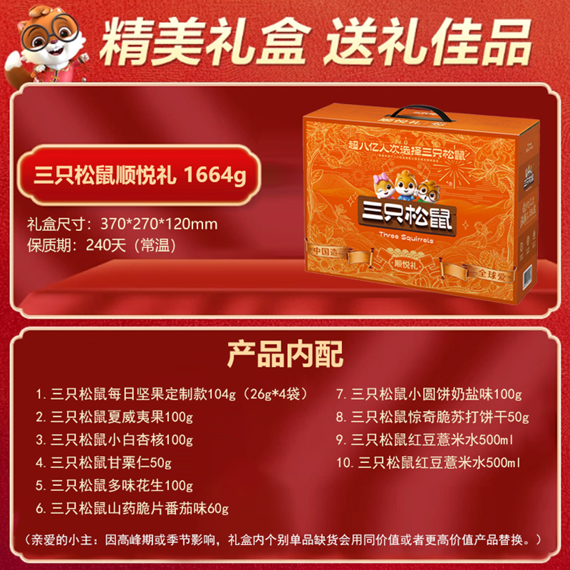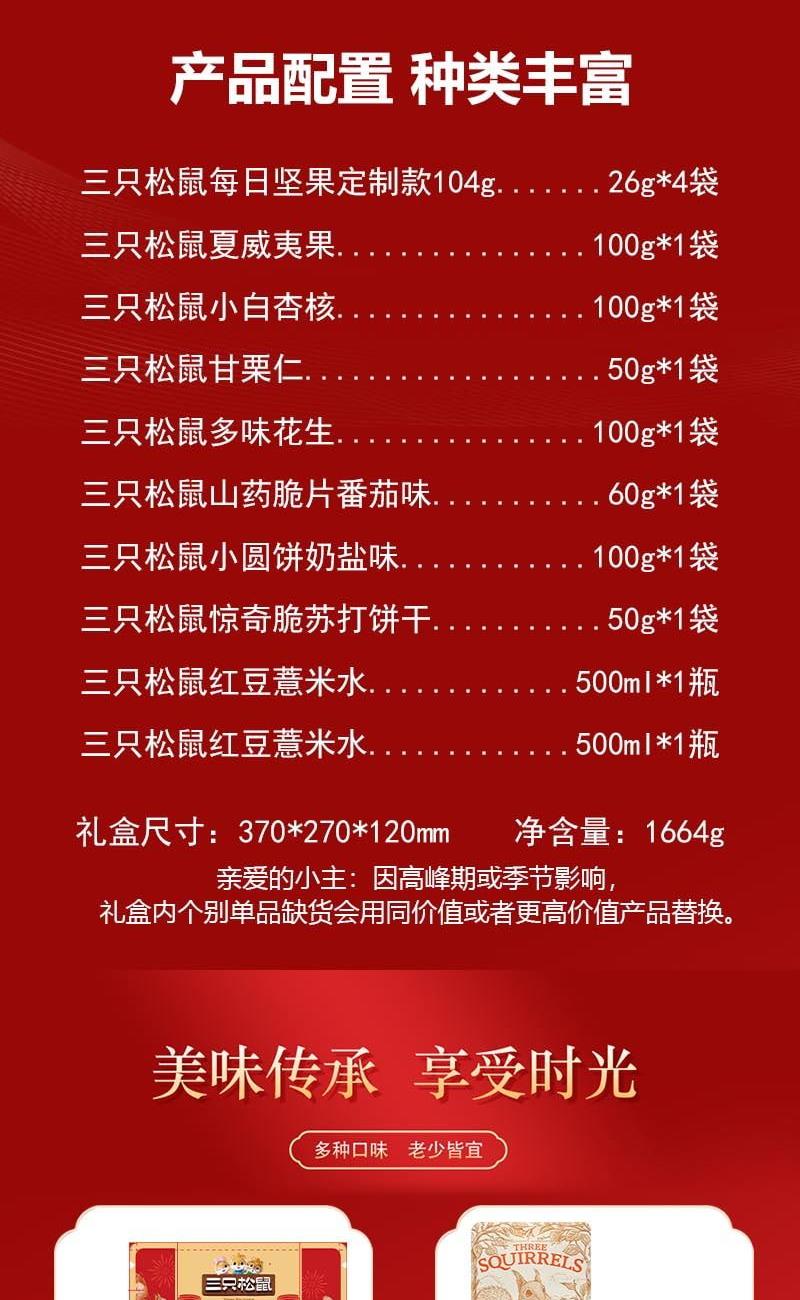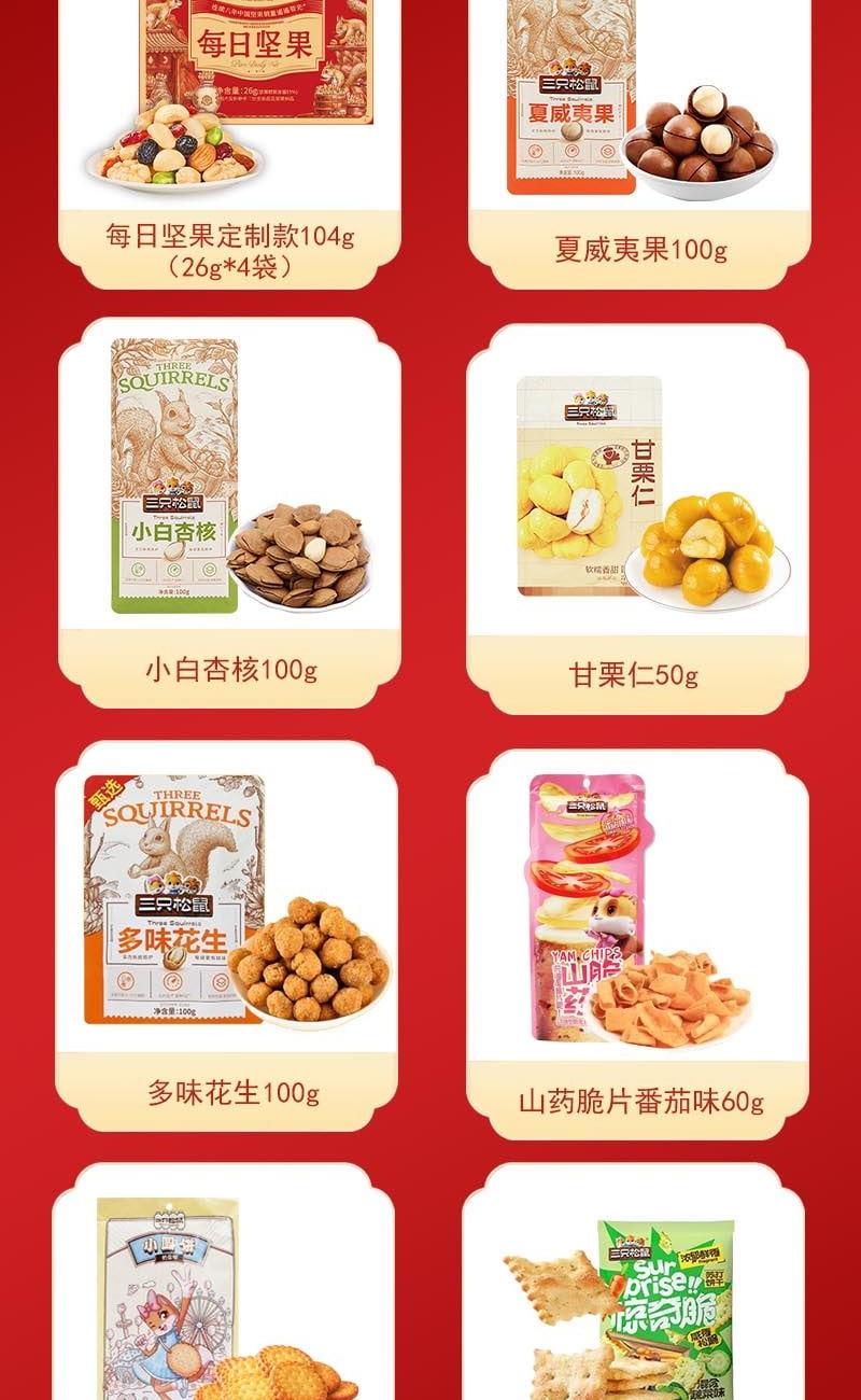 三只松鼠每日坚果定制款104g(26g*4袋) 三只松鼠夏威夷果100g 三只松鼠小白杏核100g 三只松鼠甘栗仁50g 三只松鼠多味花生100g 三只松鼠山药脆片番茄味60g 三只松鼠小圆饼奶盐味100g 三只松鼠惊奇脆苏打饼干50g 三只松鼠红豆薏米水500ml 三只松鼠红豆薏米水500ml