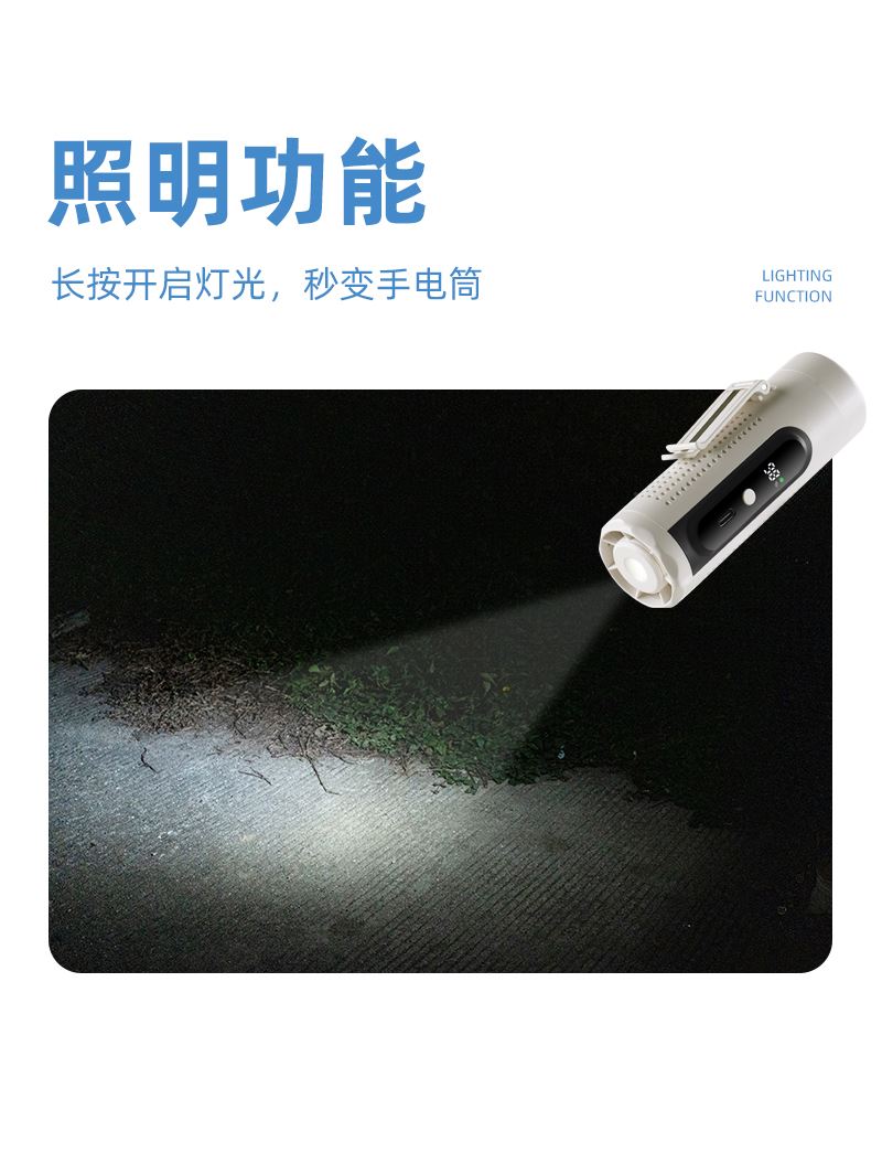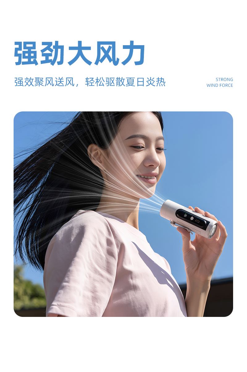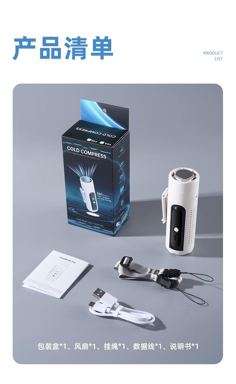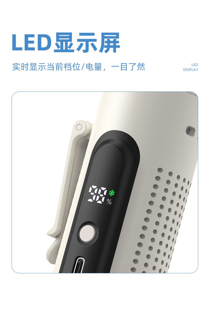 *多功能超轻制冷小风扇,仅140g *智能数显,20000转速真高速无刷电机 *高亮度LED手电筒,3000毫安 *5档大风力,可挂脖、可挂腰、可桌面、可手持 *360°进风口手心也降温
