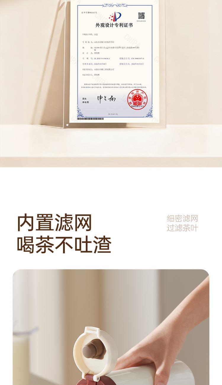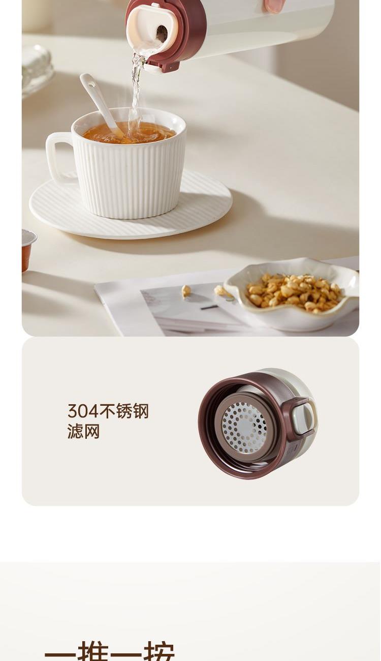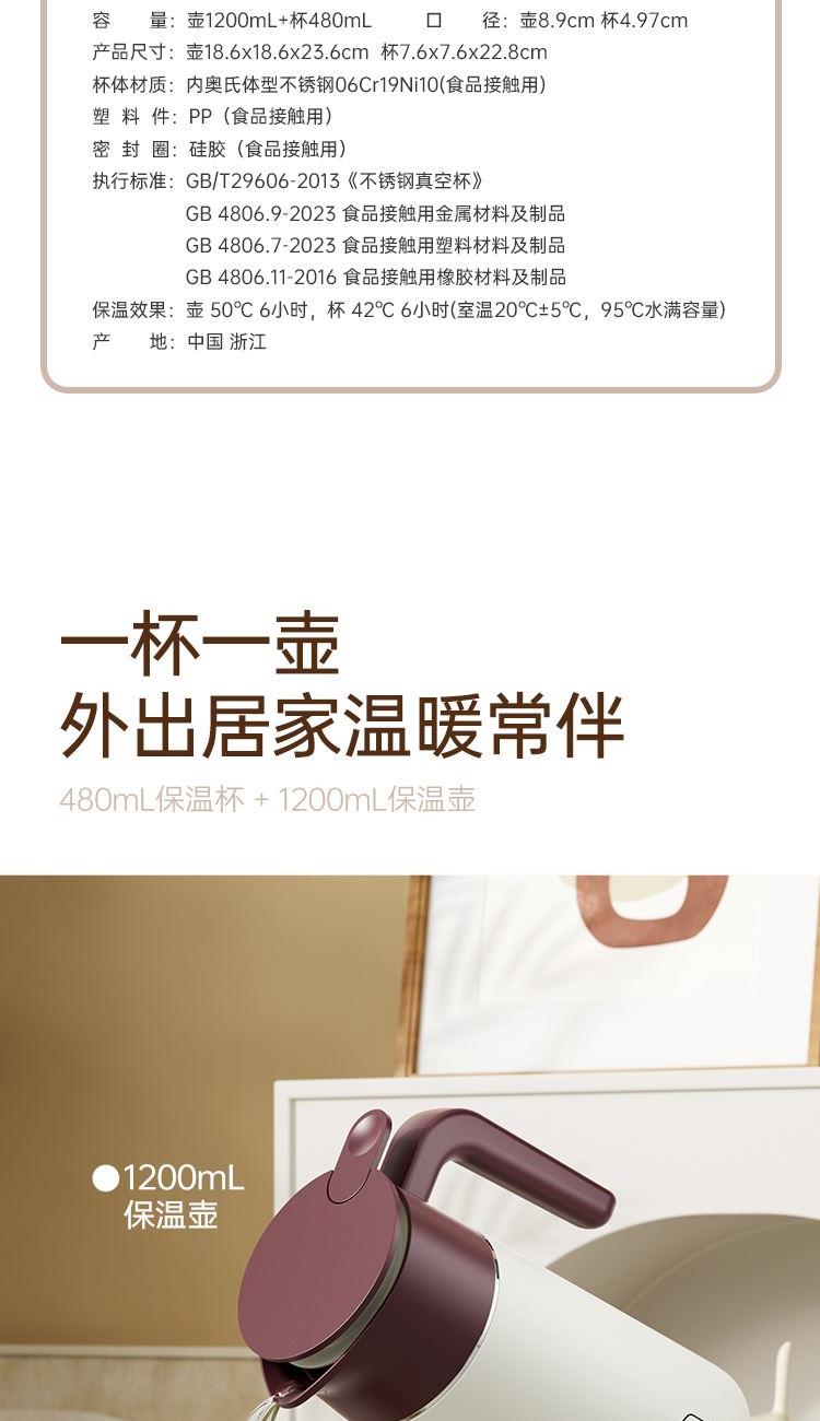 产品容量:壶:1200mL,杯:480mL 产品口径:壶:8.9cm,杯:4.97cm 杯体材质:奥氏体型不锈钢06Cr19Ni10(食品接触用) 塑 料 件:pp(食品接触用) 密 封 圈:硅胶(食品接触用) 保温效果:壶 50℃以上 6 小时(室温 20℃ ±5℃,95℃水满容量) 杯 42℃以上 6 小时(室温 20℃ ±5℃,95℃水满容量) 1、杯身采用304不锈钢,健康环保; 2、内壁表面采用电解研磨处理技术,不生锈,不氧化,防止污垢产生,易清洗; 3、杯底硅胶防滑设计,稳固放置不易倒; 4、杯身采用烤漆工艺,防刮,耐磨不掉漆,使用时间长; 5、PP材质塑料件,热工艺原理结构设计,保温时间长达6小时以上; 6、杯配有304不锈钢滤网,轻松过滤茶渣。