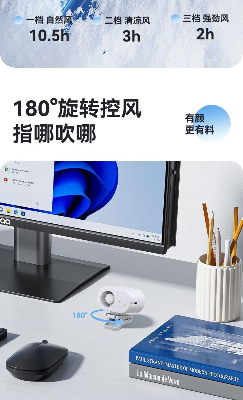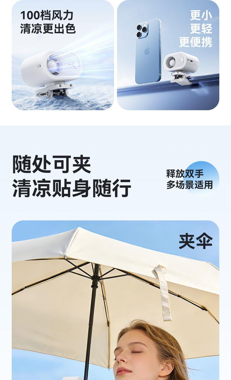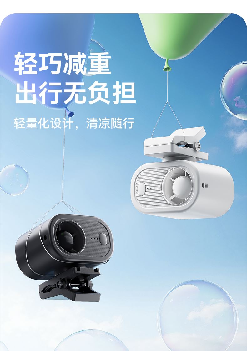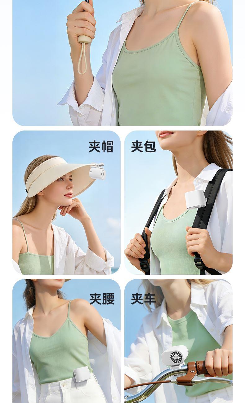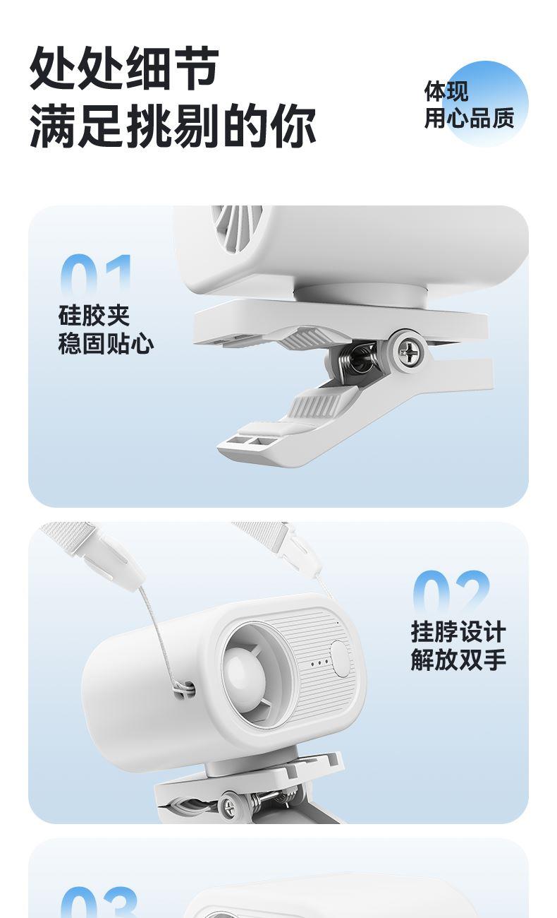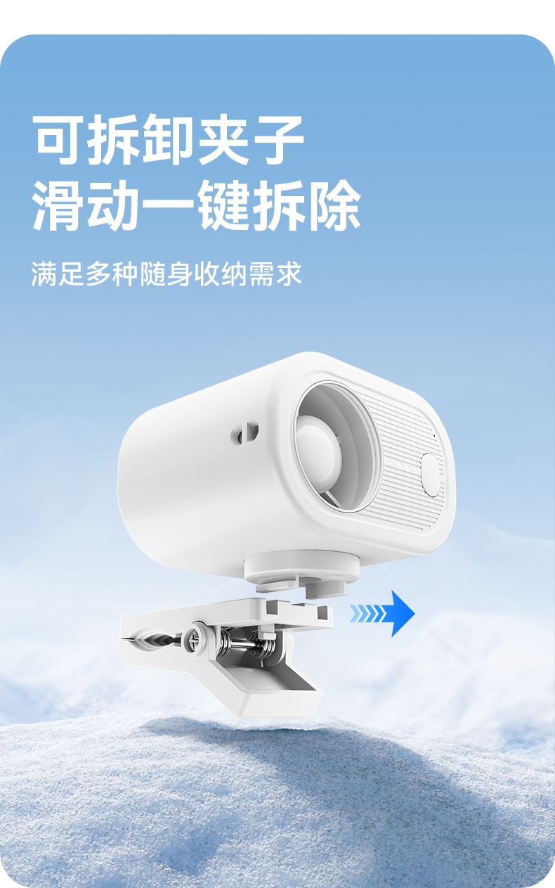 *小巧便携,大风力 *挂腰、夹领夹、背包带等使用场景 *1200毫安,时尚简约百搭外观
