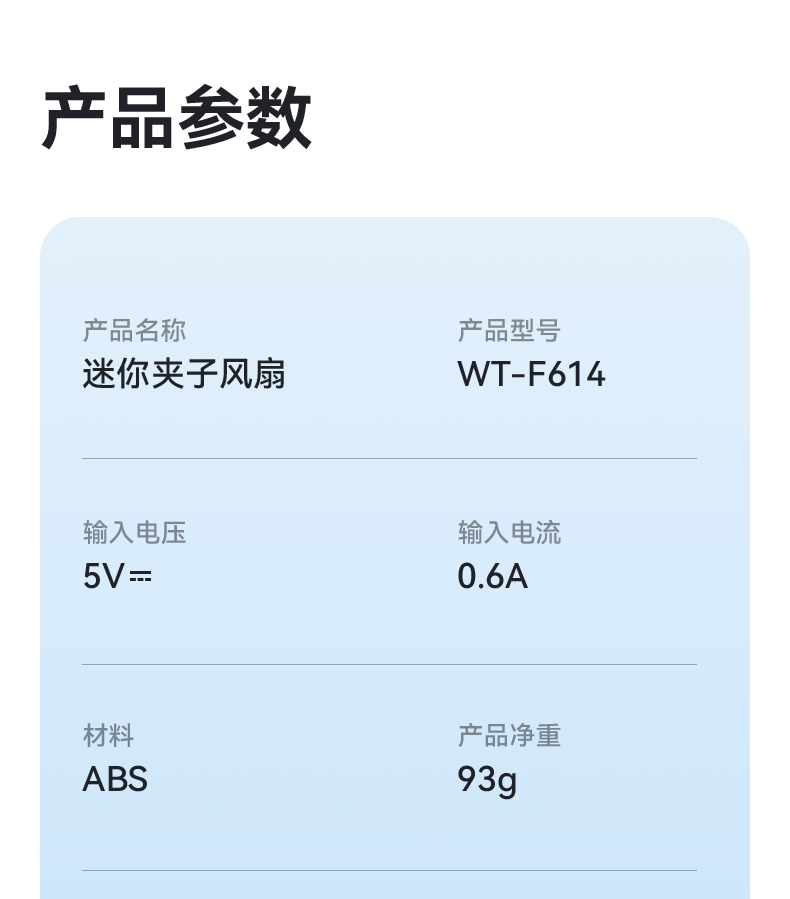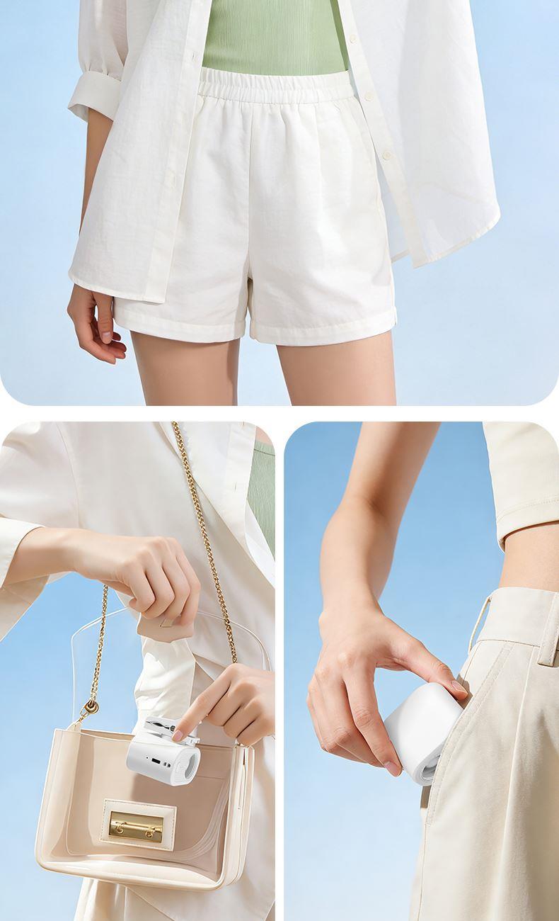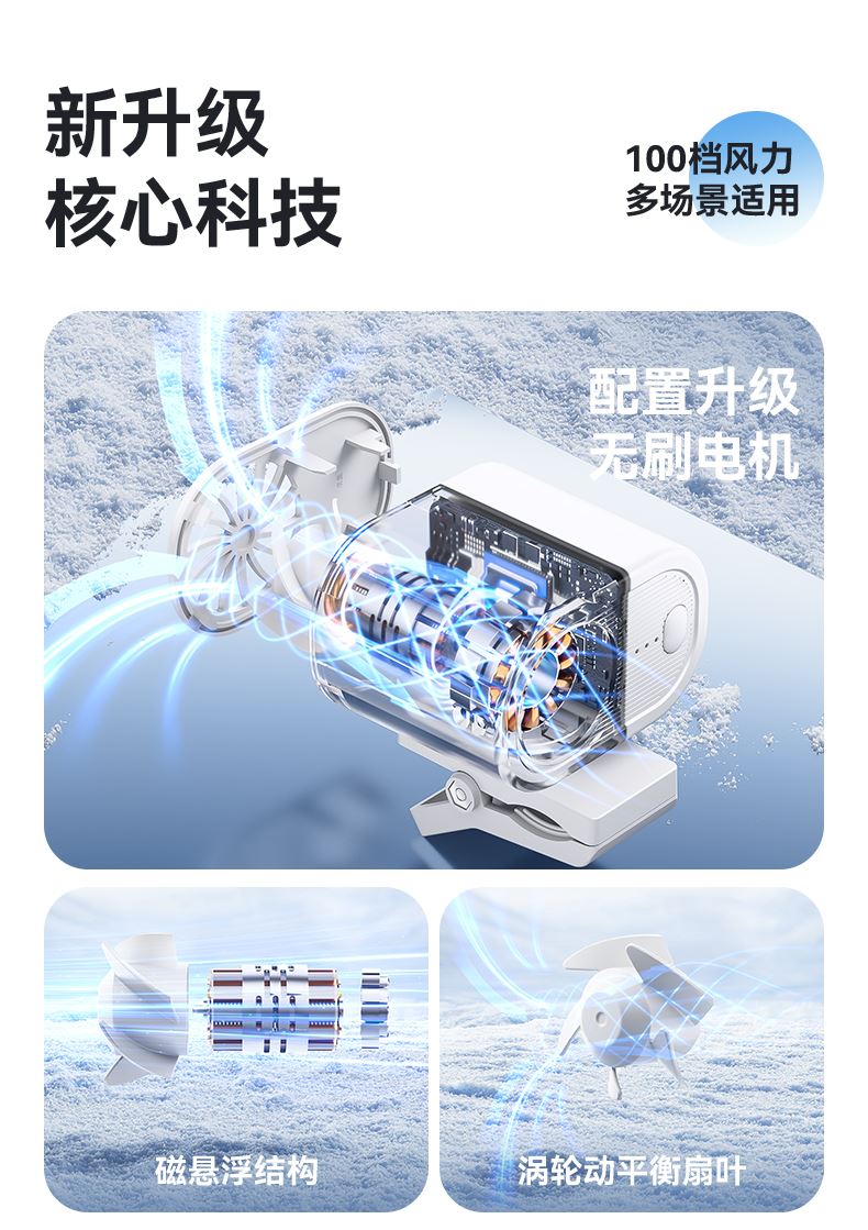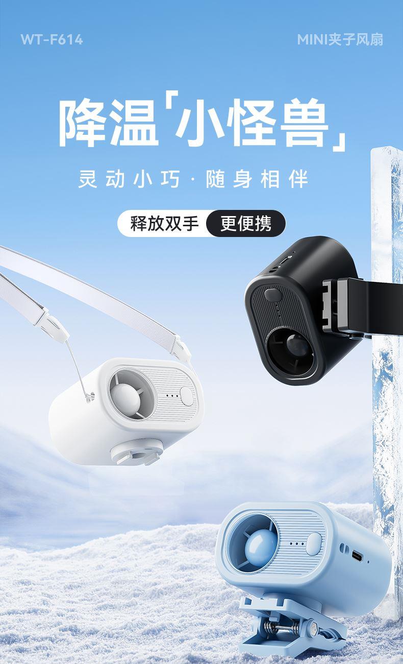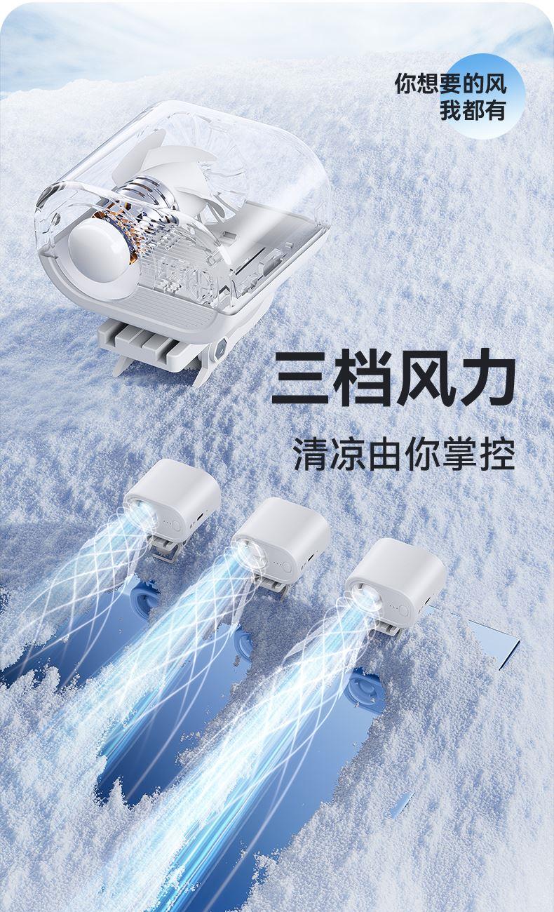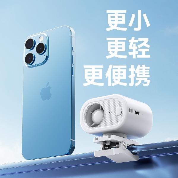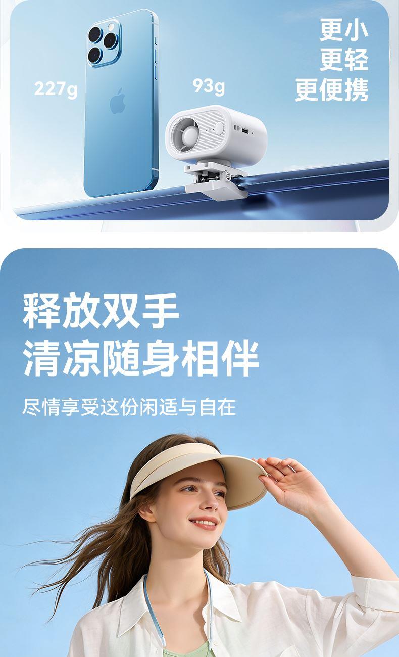 *小巧便携,大风力 *挂腰、夹领夹、背包带等使用场景 *1200毫安,时尚简约百搭外观