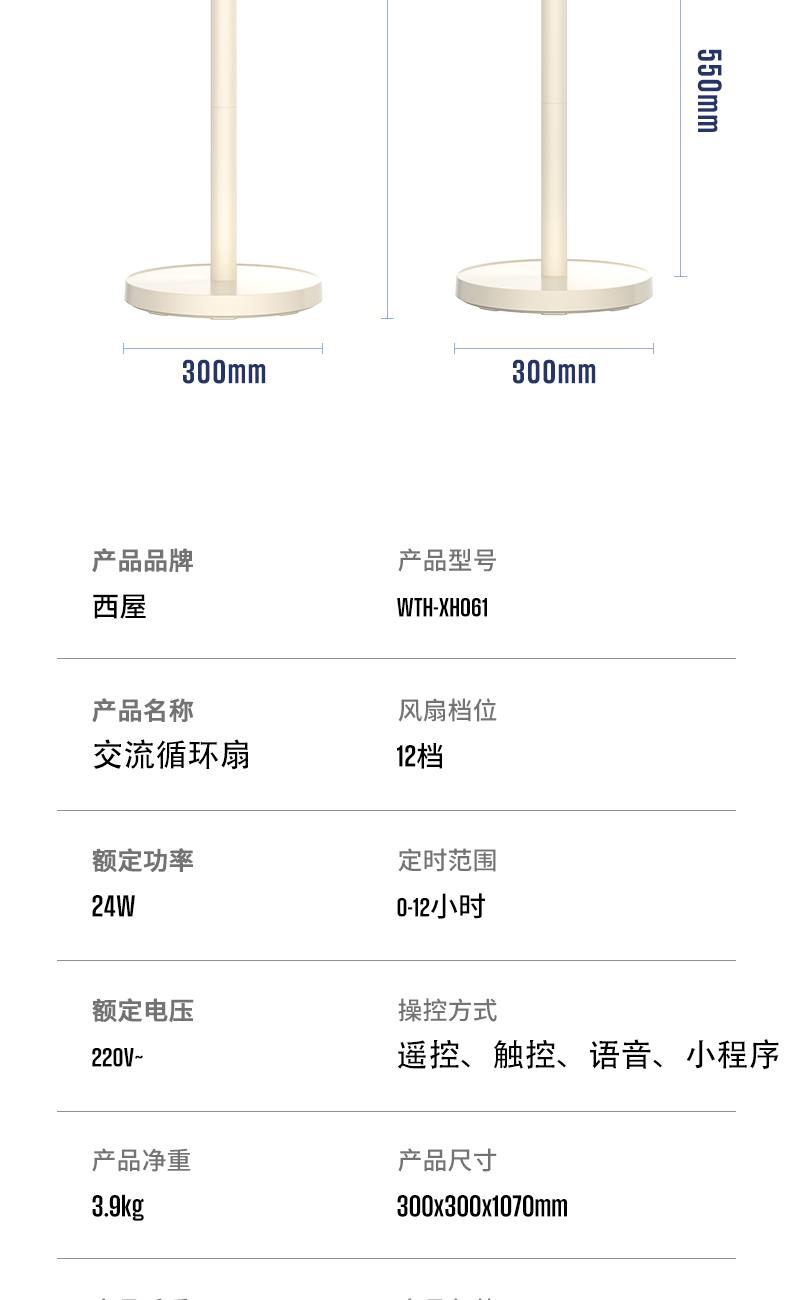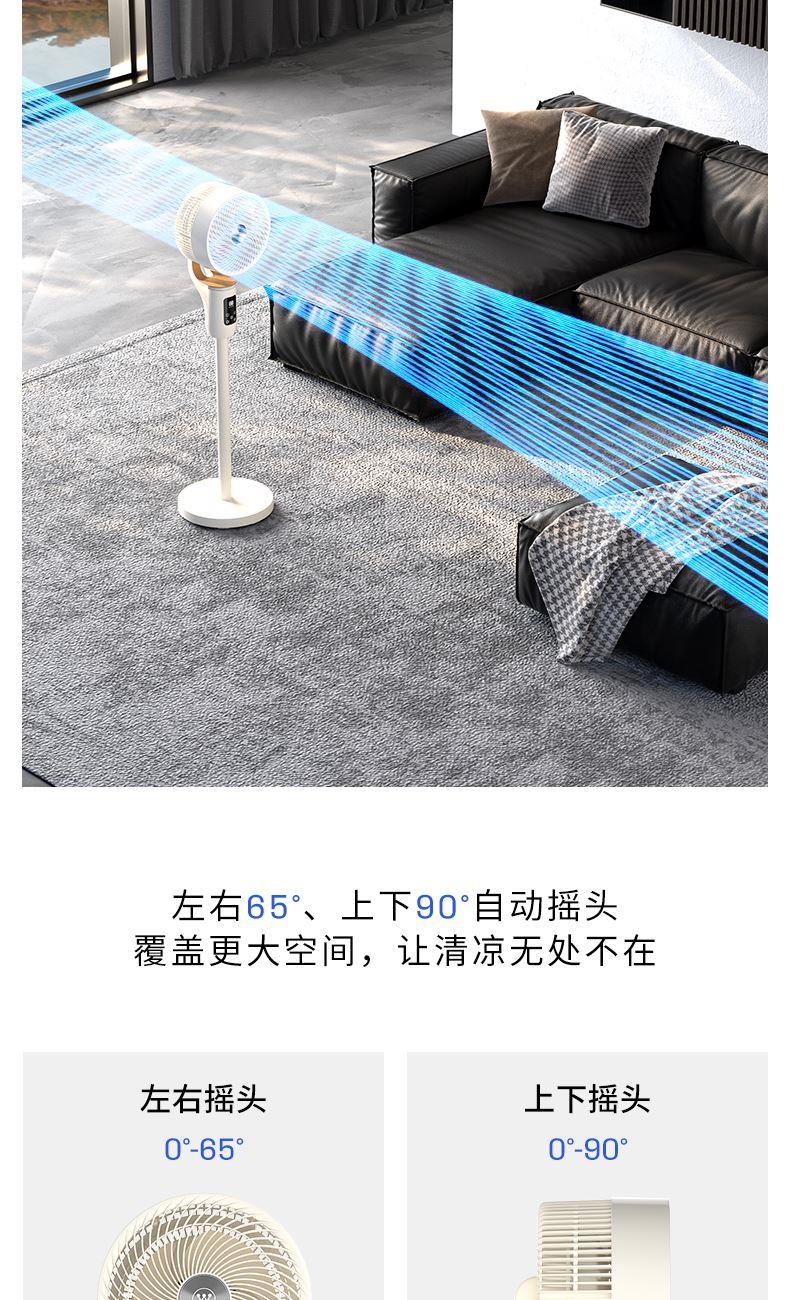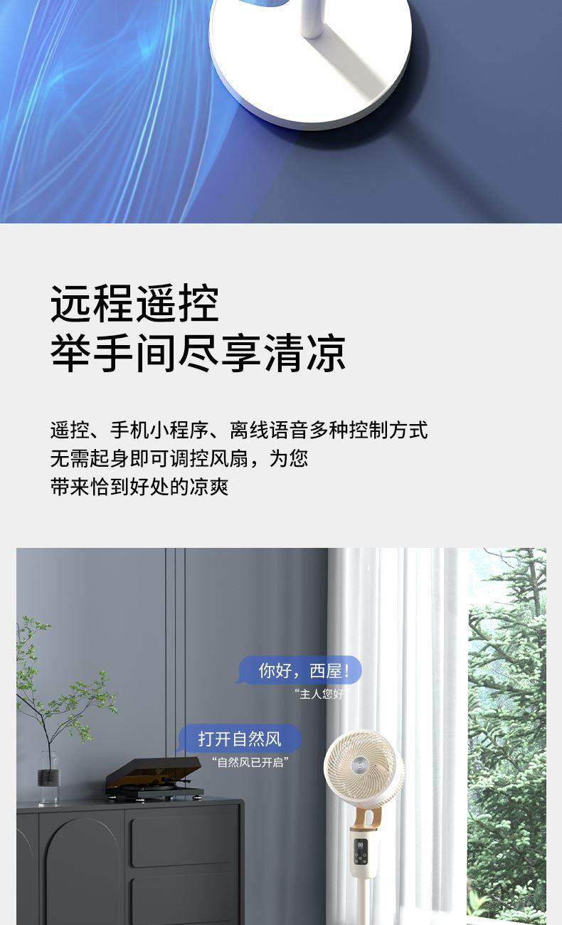 额定功率:35W 定时范围:12小时 档位:12档调节 控制方式:触控、遥控、语音、手机小程序 净重/毛重:4.4kg/5.4kg 产品尺寸:300*300*1070mm 1、首创超声波智能驱蚊,开机即开启; 2、12档风速调节,12小时预约定时,AI智能变频; 3、全自动3D遥头,上下90°,左右65°广域送风; 4、多种控制方式:触摸、遥控、小程序、AI智能语音交互; 5、自带记忆功能,隐藏式香熏盒,香随风远; 6、AI智能风,生态负离子净化,循环微气候; 7、高度可伸缩,台、立两用,满足不同摆放需求。 8、自带暖光小夜灯,静柔不刺眼