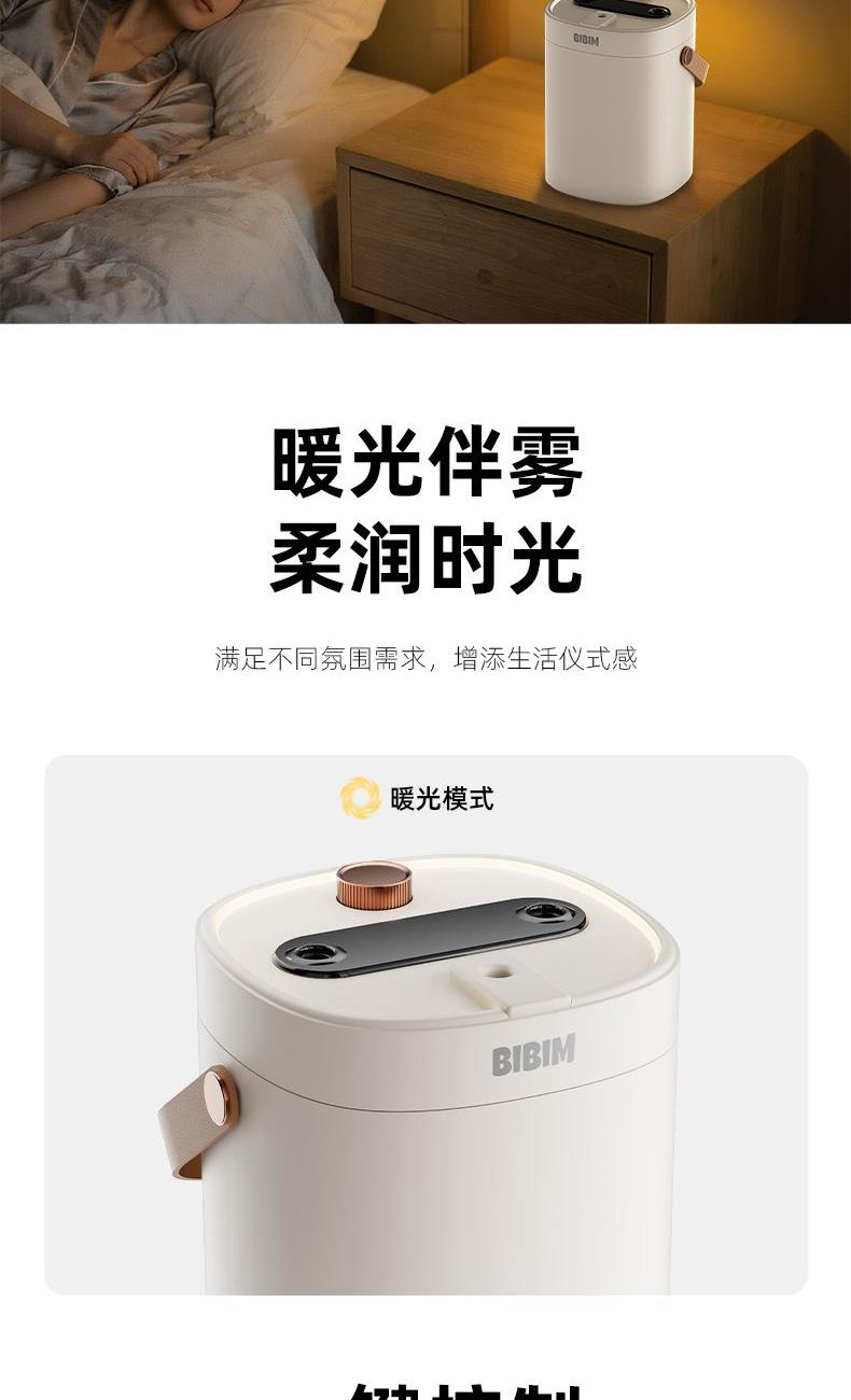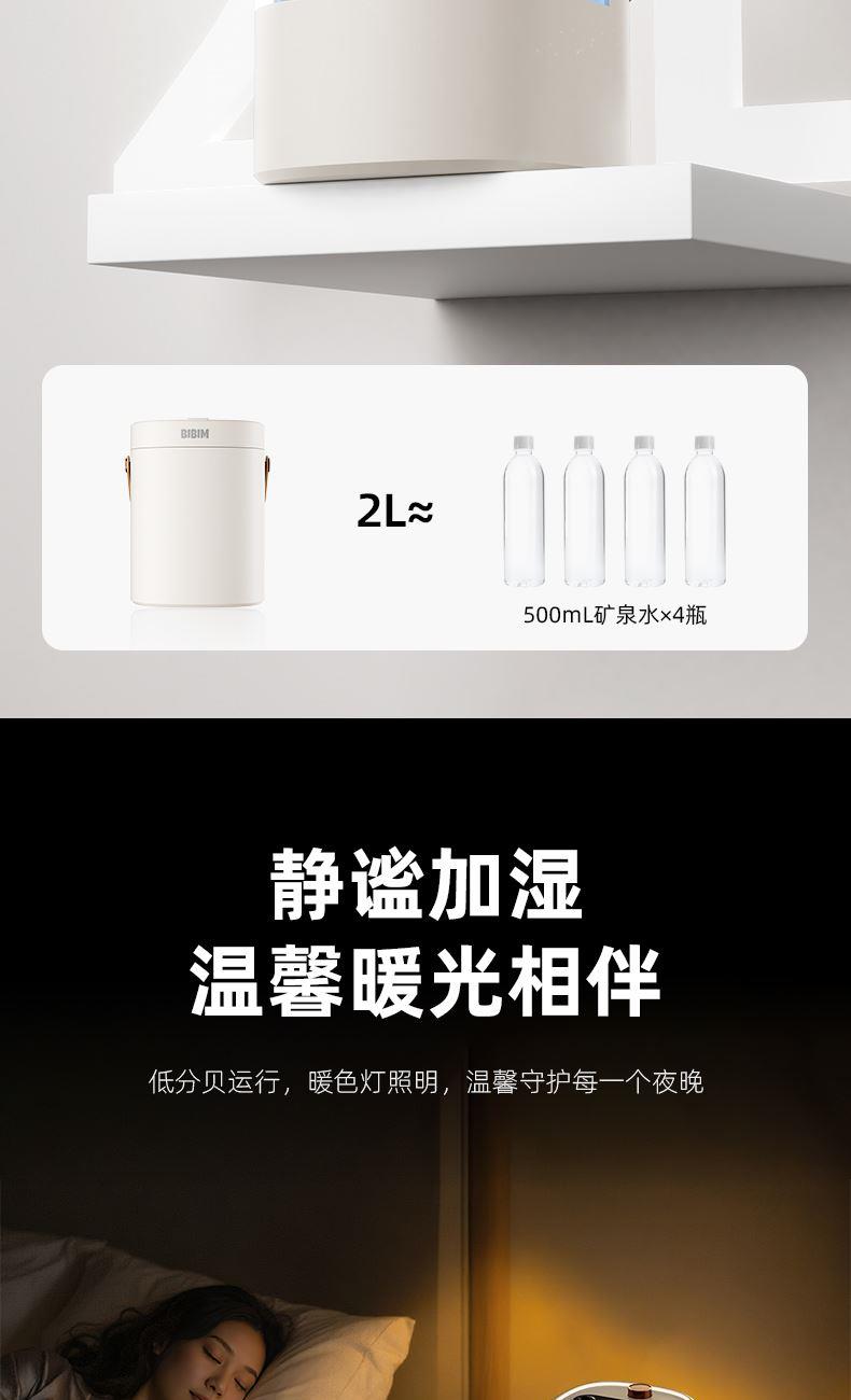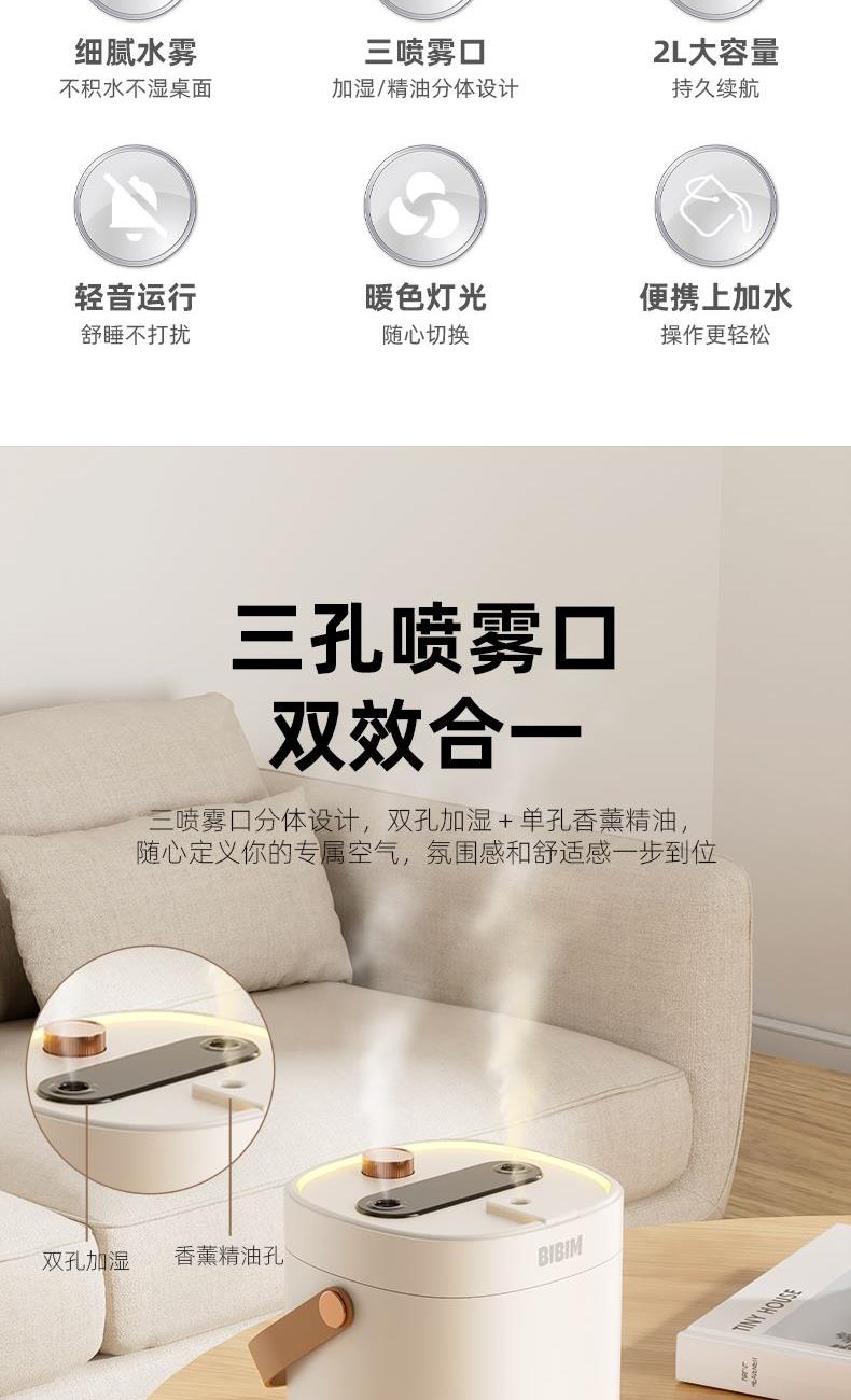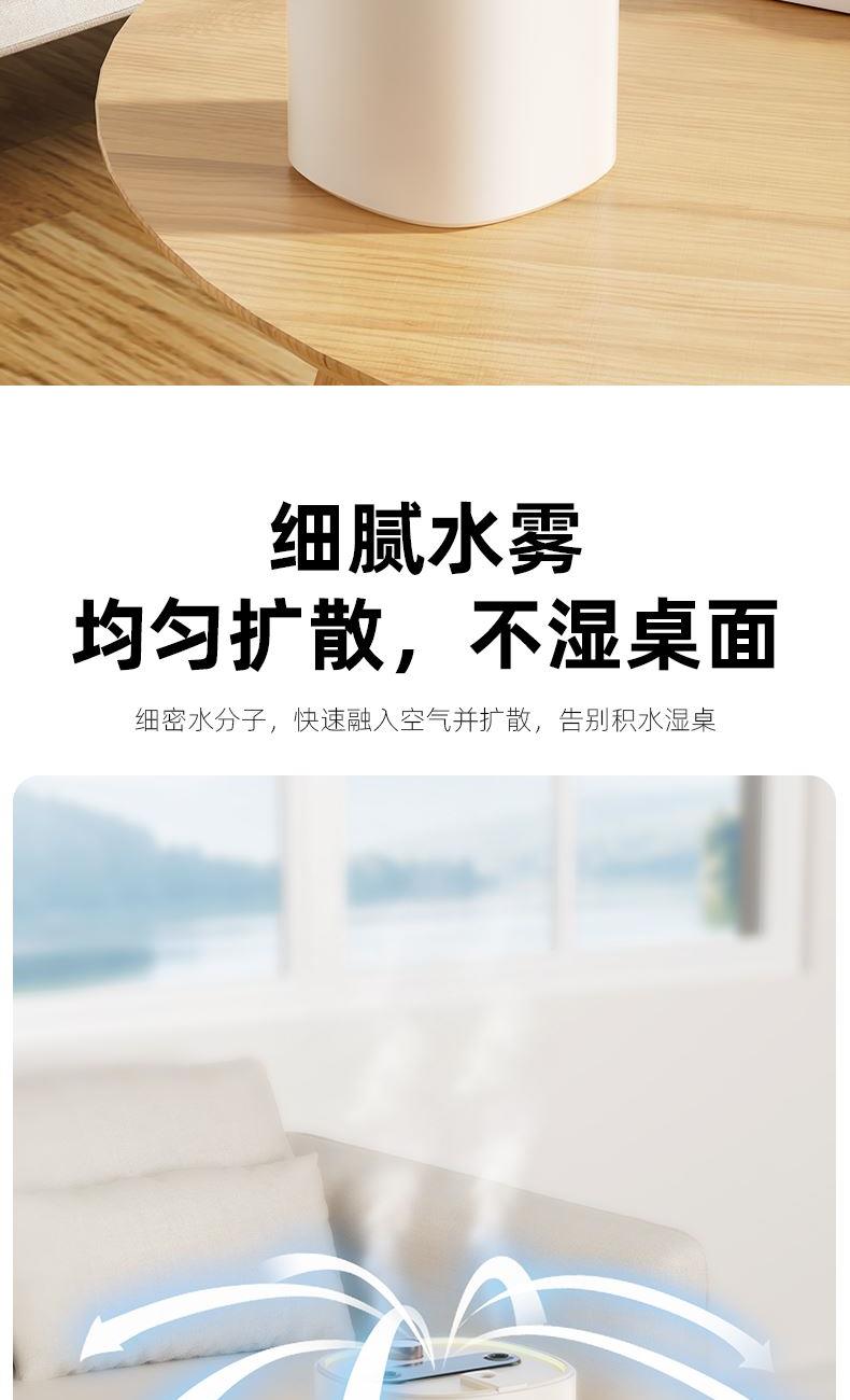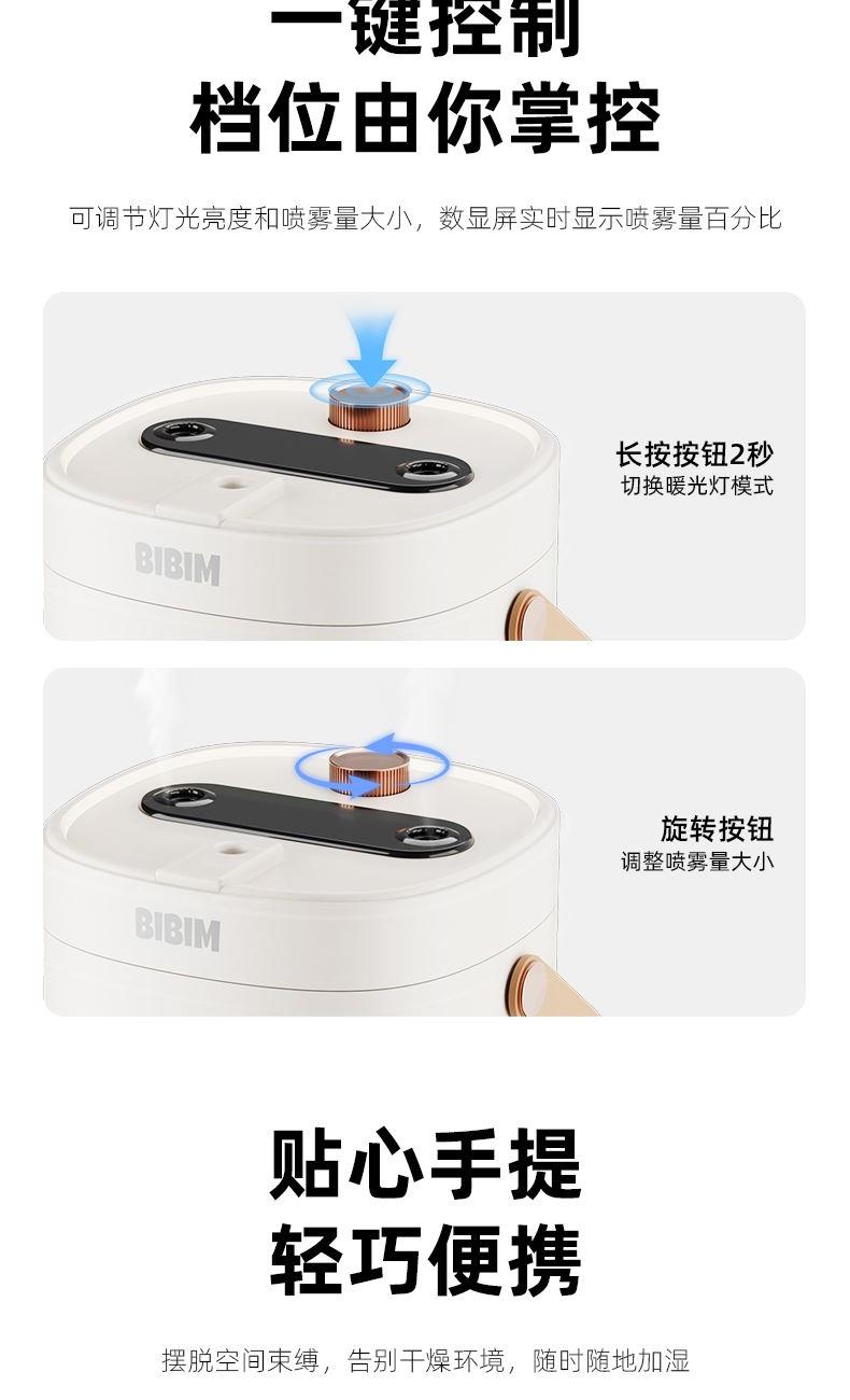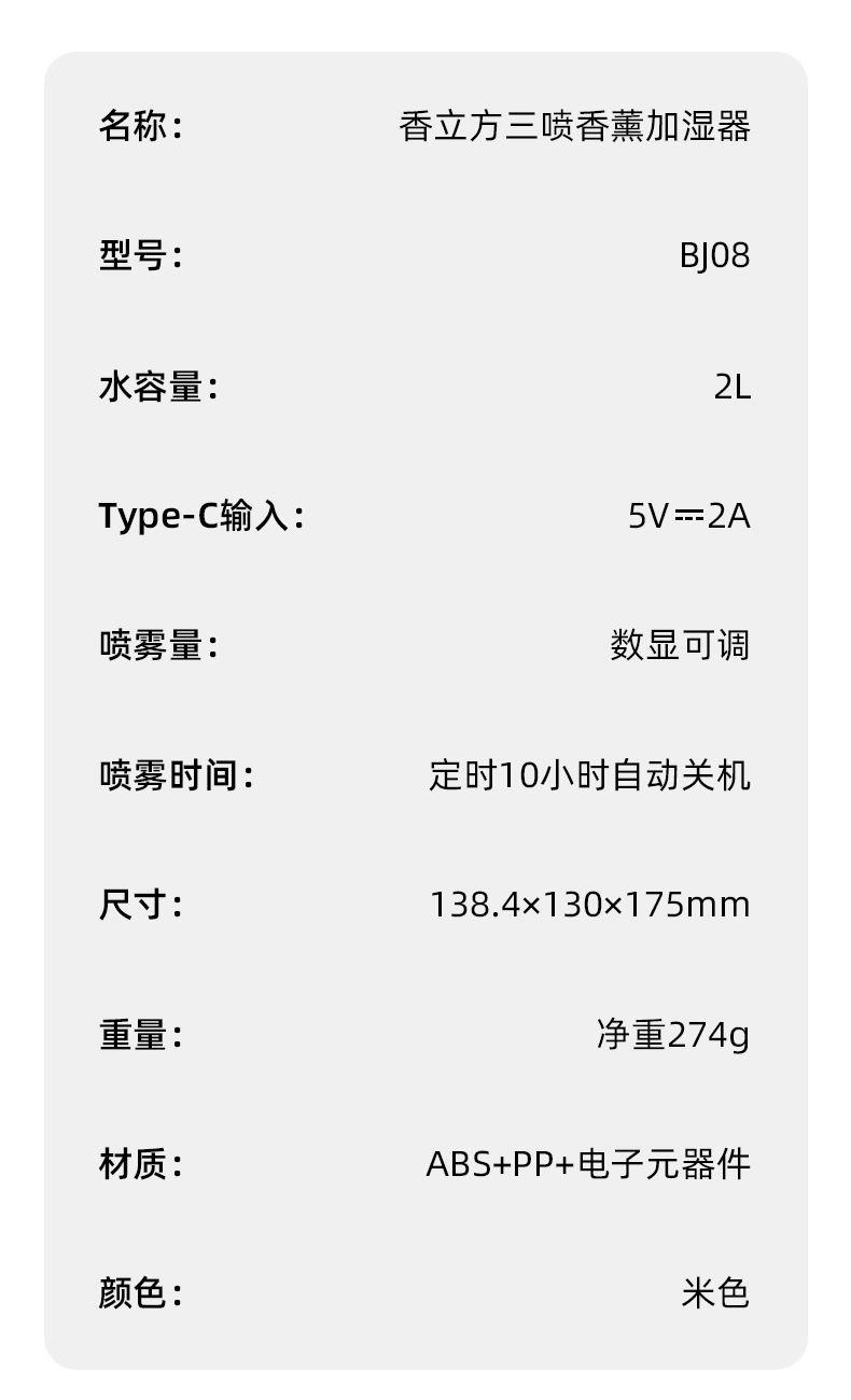 水容量:2L 产品尺寸:138.4x130x175mm净重:274g 喷雾时间:10小时定时关机 喷雾量:数显可调 暖光氛围灯光 输入TYPE-C,5V2A颜色:米色材质:ABS+PP+电子元器件 三喷加湿,精油和水分体设计 暖光灯效,细腻水雾 大雾加湿,轻音运行 2L大容量水箱,灯光和雾量大小可调 TYPE-C接口,贴心手提