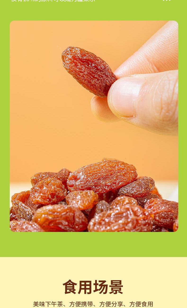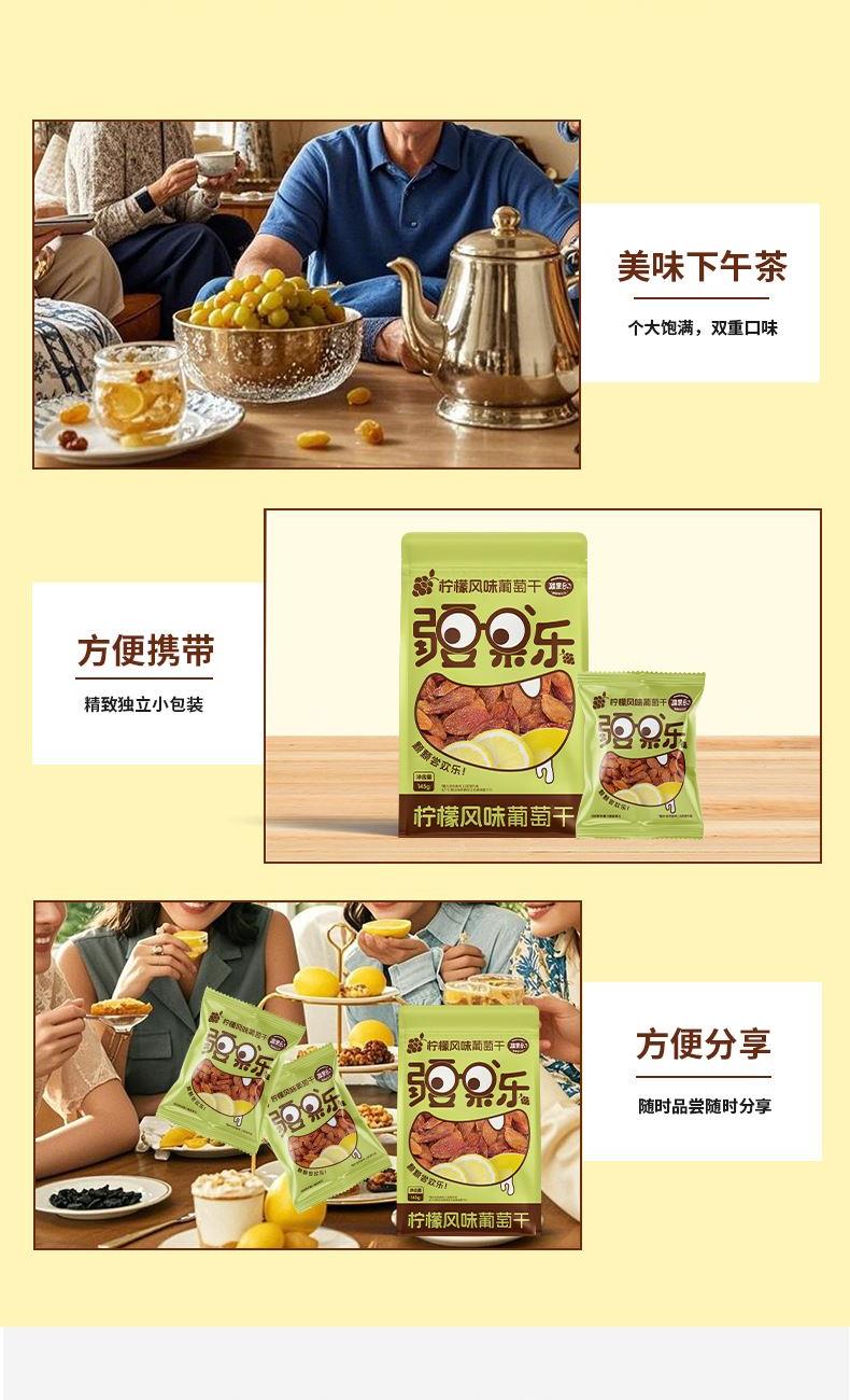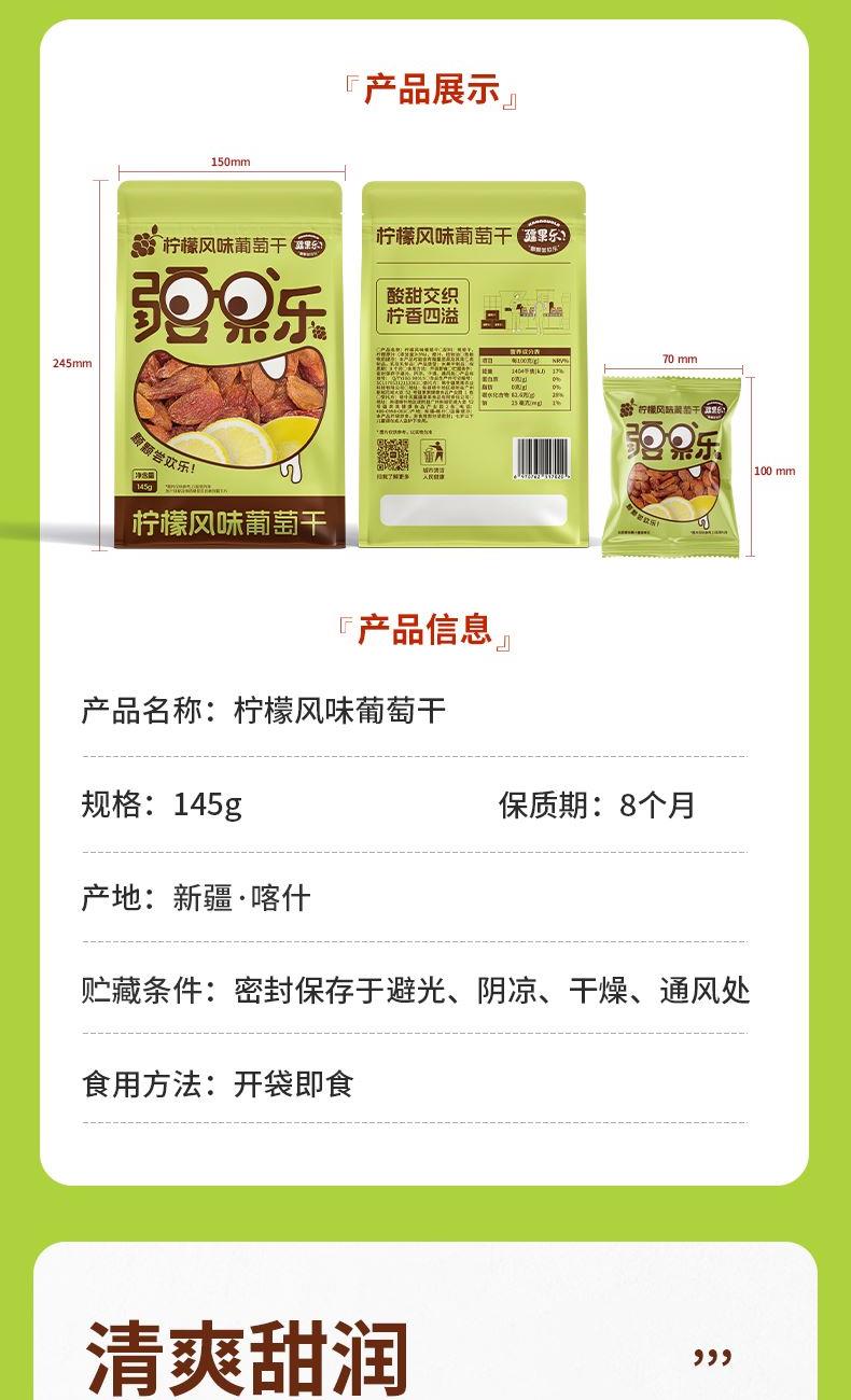 精选新疆玫瑰香葡萄干搭配清新柠檬香气,一口咬下——先是柠檬的清新酸爽在舌尖绽放,接着葡萄干的蜜甜温柔回甘!酸与甜在口腔平衡,像在味蕾上跳起了恰恰舞,好吃到忍不住摇头晃脑~办公室困倦时的"提神精灵"——酸爽滋味瞬间赶走瞌睡虫;追剧时的"快乐加速器",一颗接一颗根本停不下来;野餐篮里的"氛围担当",和微风阳光共享酸甜好时光!独立小包装设计,快乐像糖果一样随身携带~