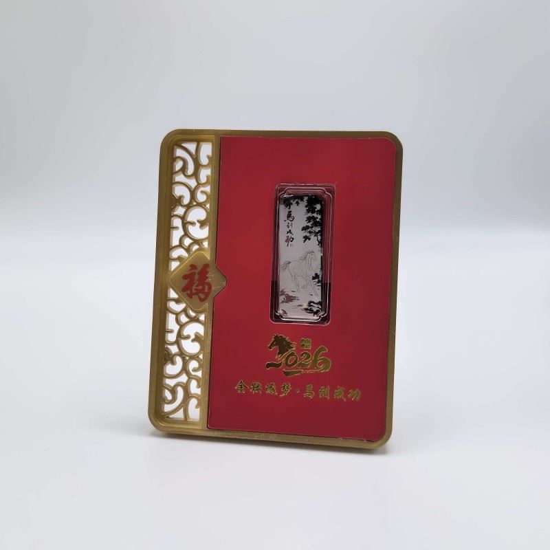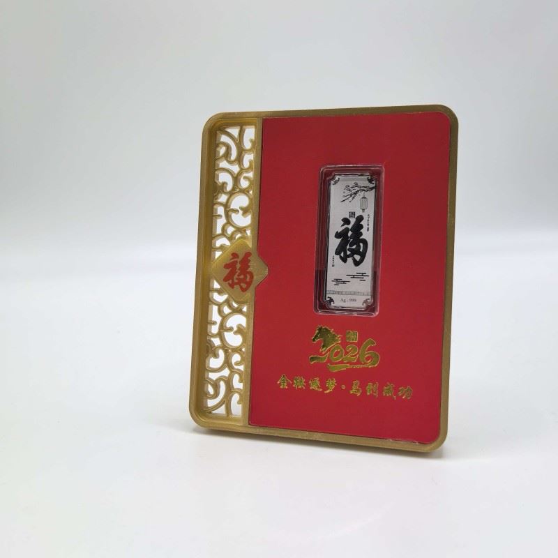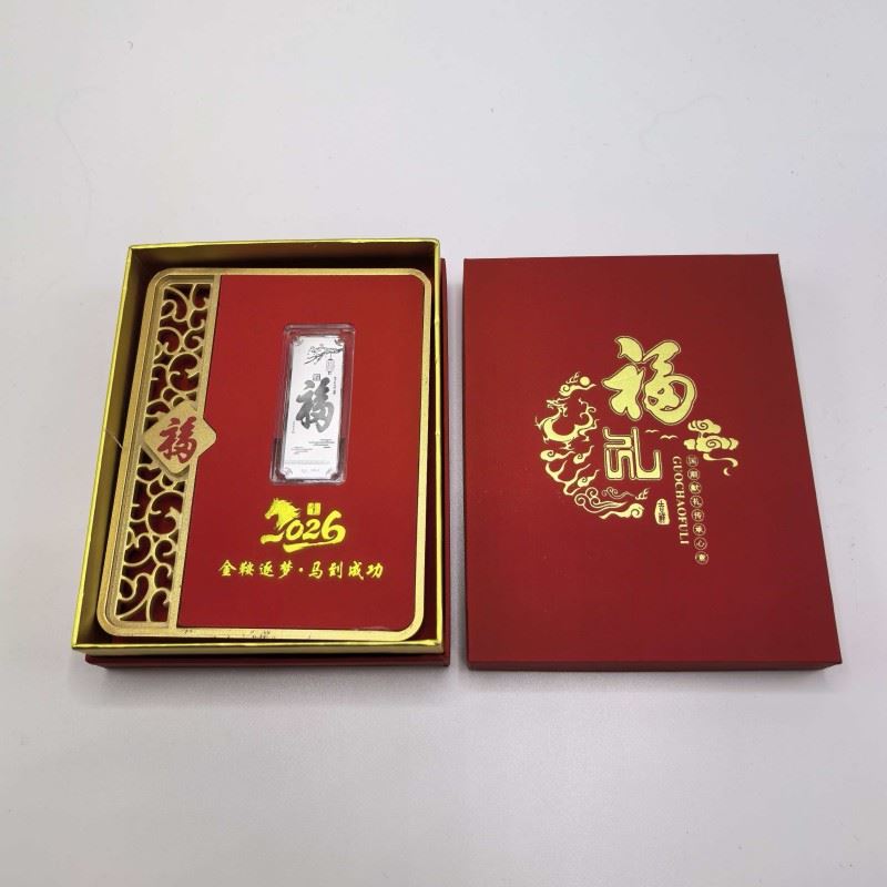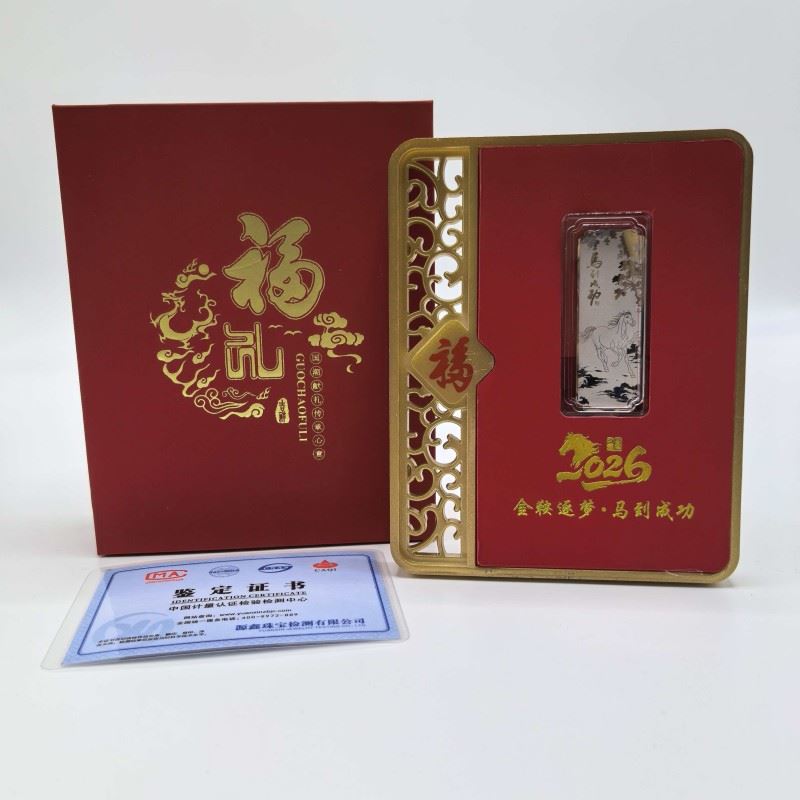 材质:足银999 1g 产品规格:100*127*13mm 包装规格:110*40*138mm 银条规格:100*127*13mm 以999纯银精铸,银条上骏马腾跃山水间,象征「金鞍逐梦」的奋进精神!镶嵌于赤红底台,边框环绕,镂空福纹点缀,搭配倒福牌饰,尽显东方祥瑞之气。 「福」字礼盒配权威鉴定证书,双证保障品质。2026马年专属印记,赠予挚友、长辈或商界伙伴,寓意马到成功、福泽万家,是新春、佳节、庆典的尊贵之选!