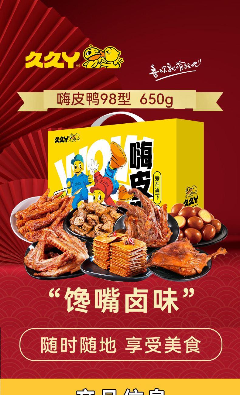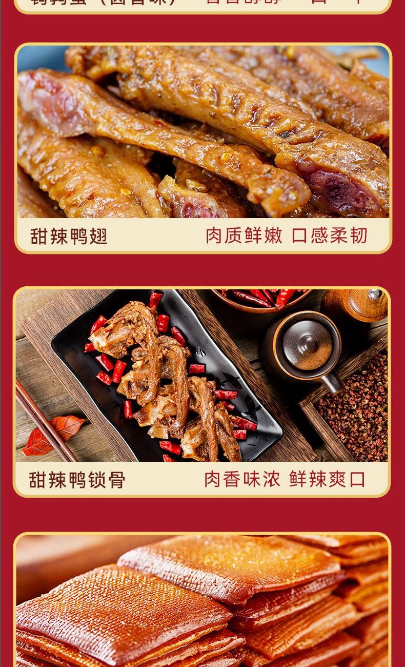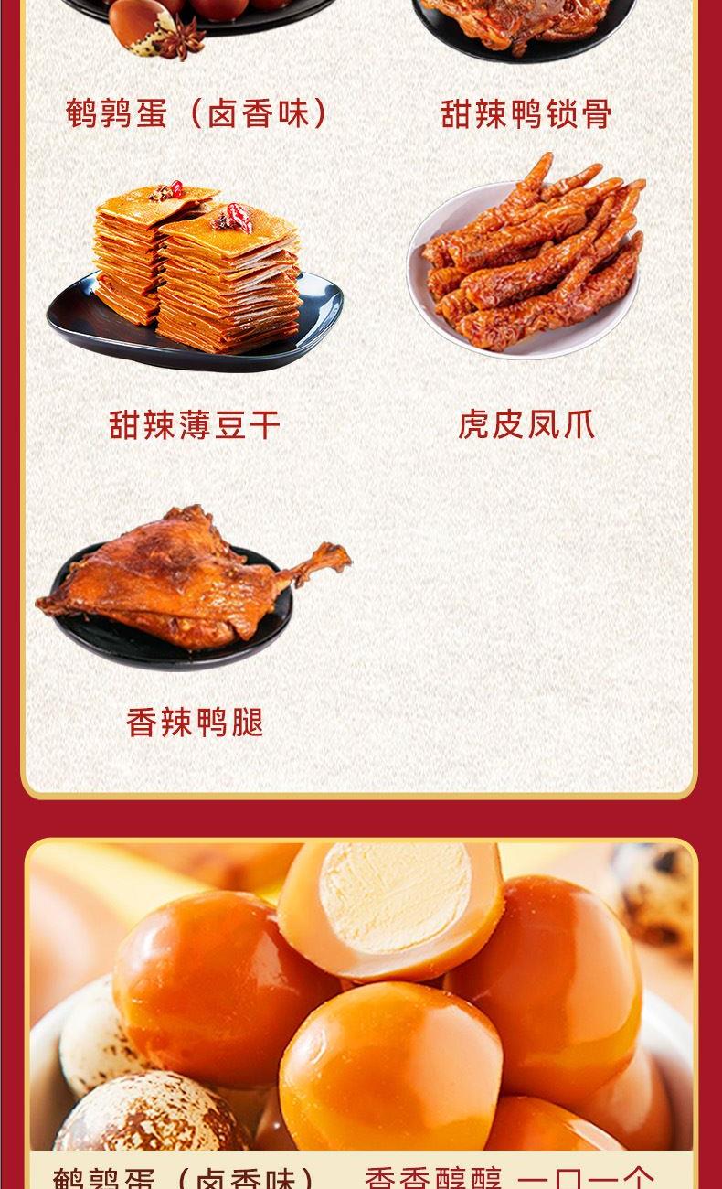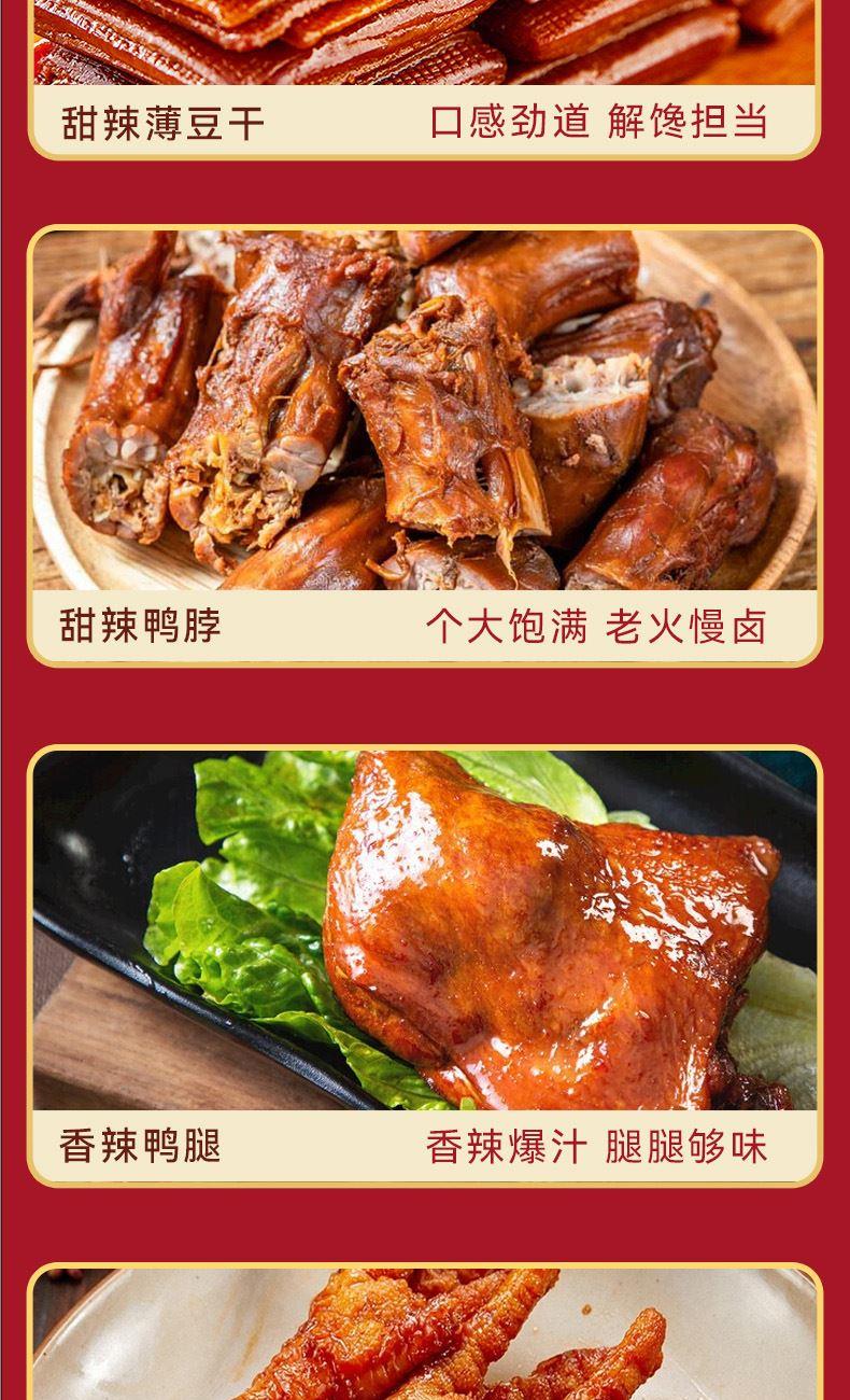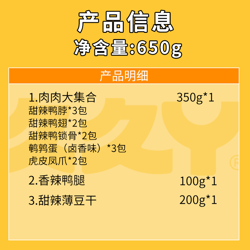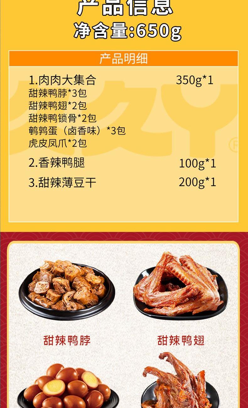 久久丫肉肉大集合350g (甜辣鸭脖*3 甜辣鸭翅*2 甜辣鸭锁骨*2 鹌鹑蛋(卤香)*3 虎皮凤爪*2) 久久丫香辣鸭腿100g 久久丫甜辣薄豆干200g