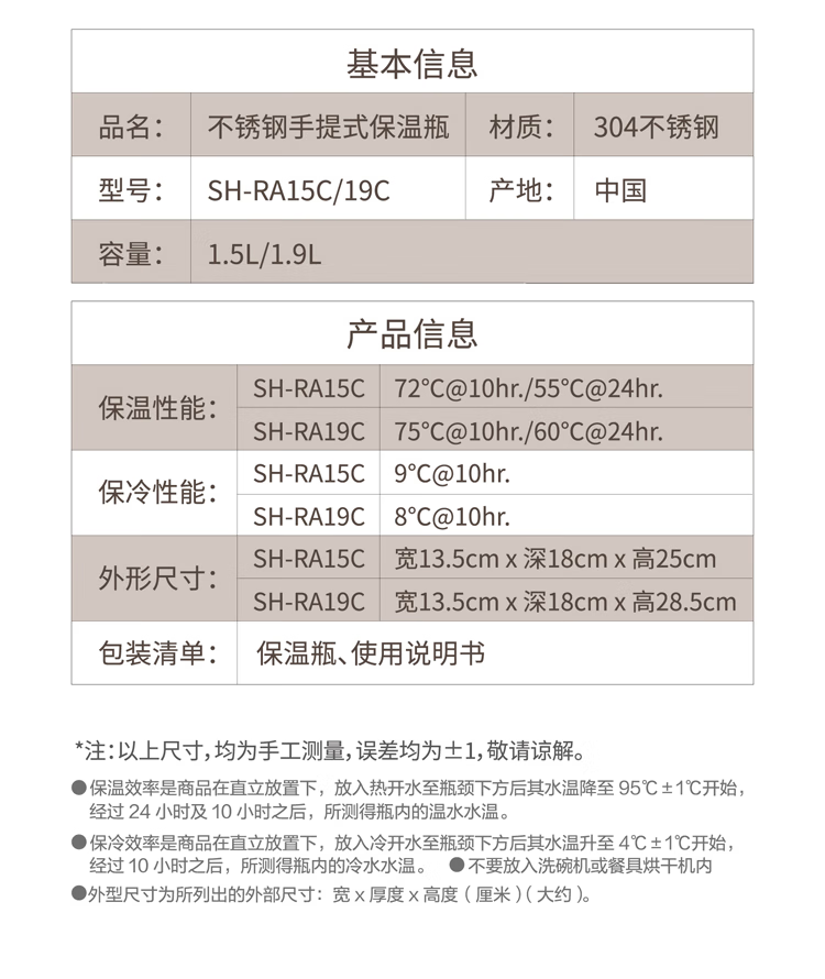 品 牌:象印ZOJIRUSHI 型 号:SH-RA19C 颜 色:TA棕色/HM灰色/NL香槟色/XA不锈钢 容 量:1.9L 类 型:按压式保温壶 材 质:304不锈钢 保 温:6小时约60°C 保 冷:6小时约10°C以下 产 地:中国