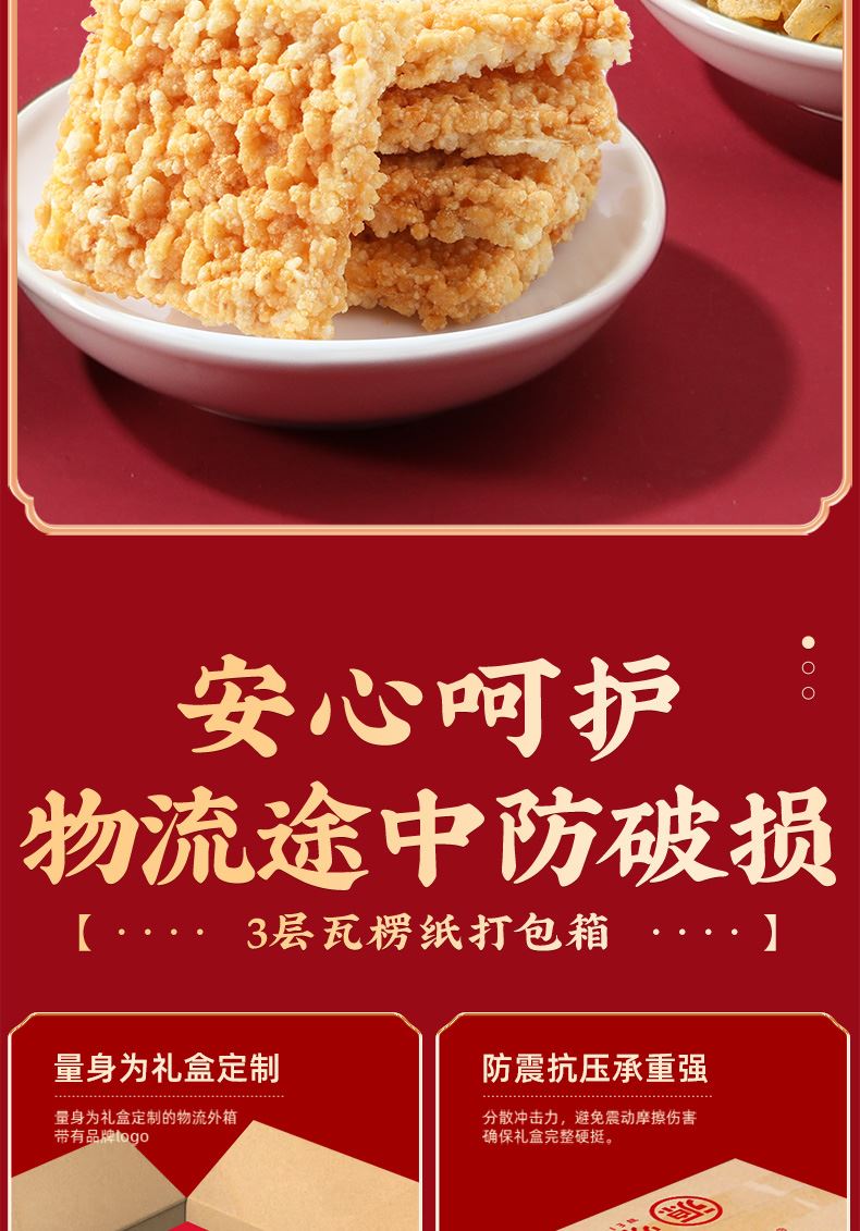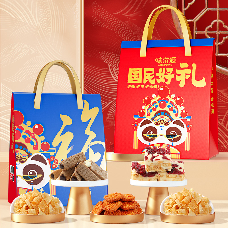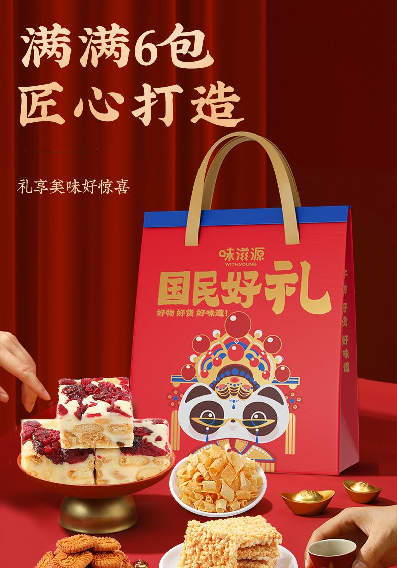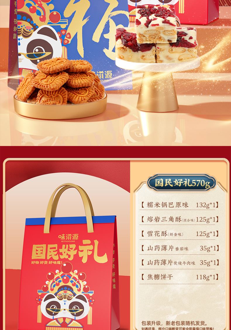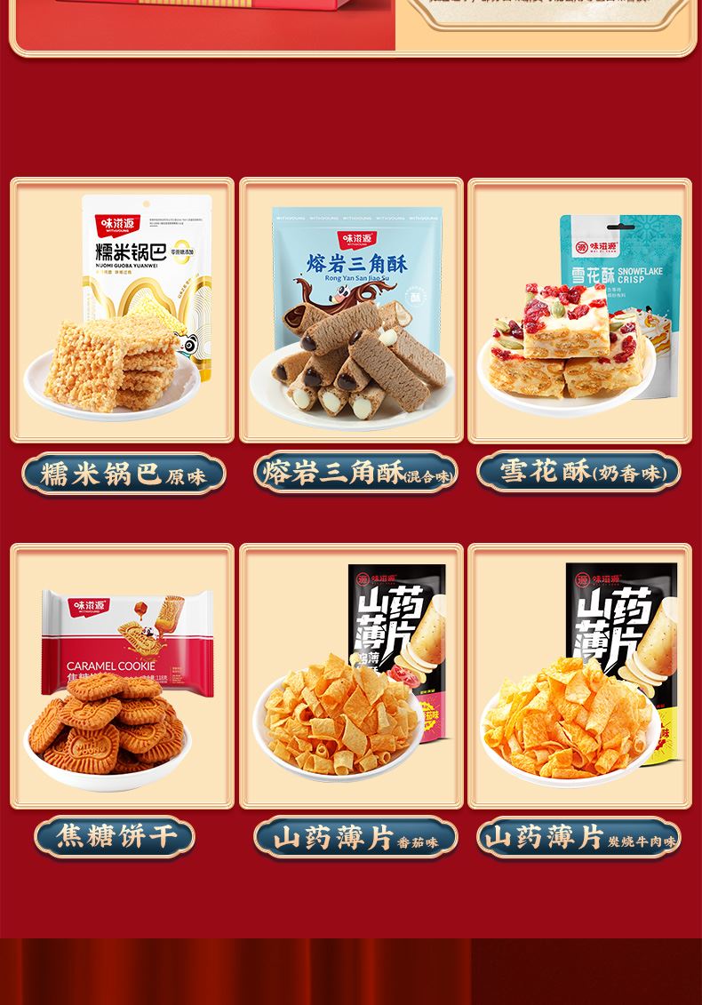 克重:570克 内配: 1.熔岩三角酥125g*1袋 2.雪花酥125g*1袋 3.焦糖饼干118g*1袋 4.原味糯米锅巴132g*1袋 5.山药薄片番茄味35g*1袋 6.山药薄片炭烧牛肉味35g*1袋 礼盒规格:250*100*310mm 保质期:8月