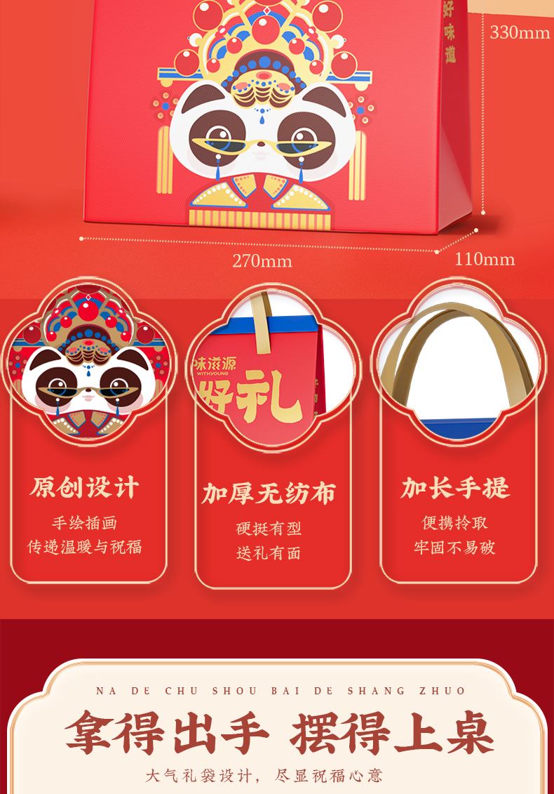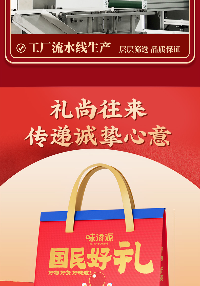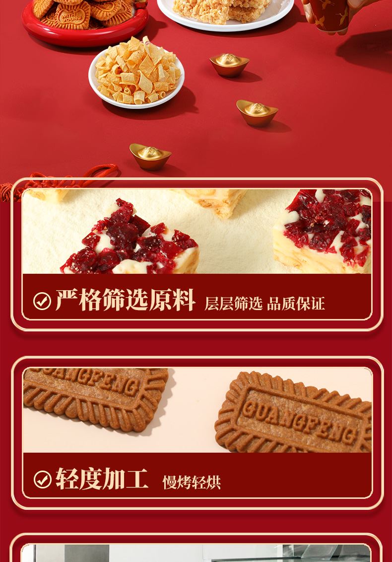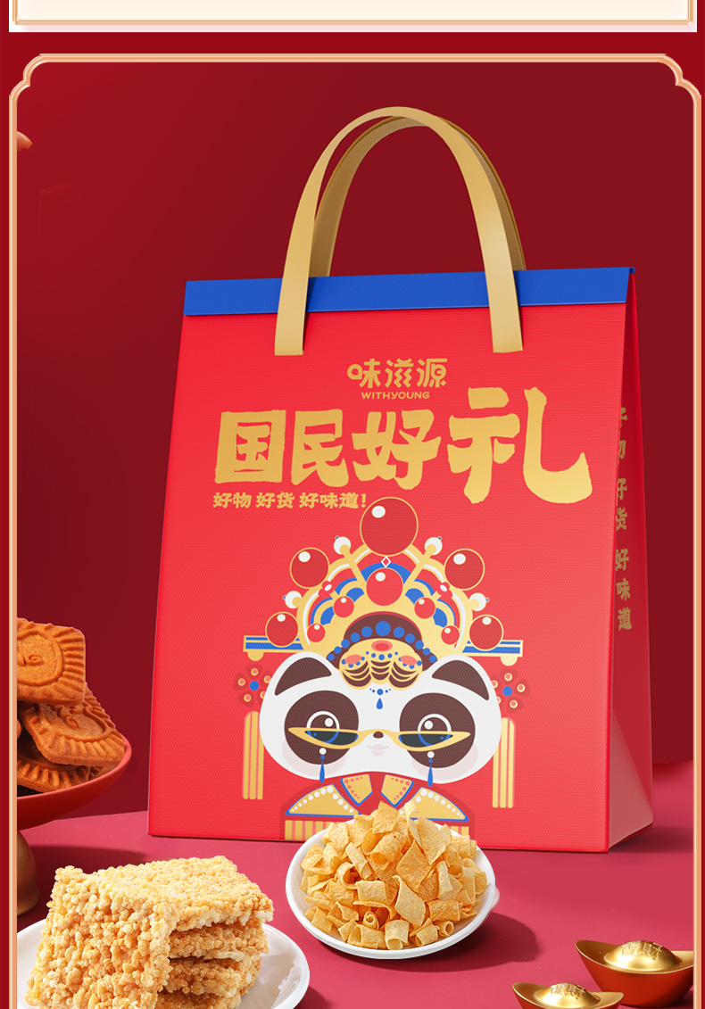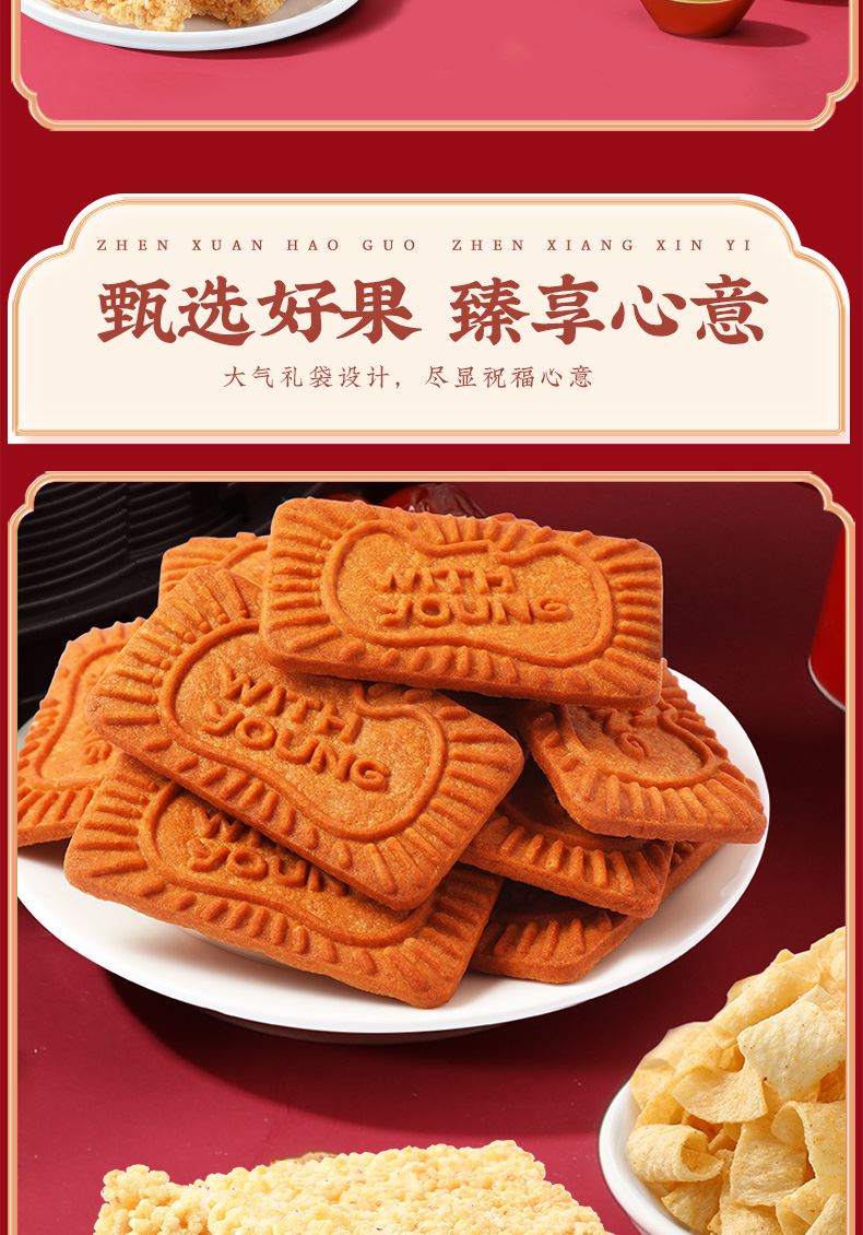 克重:570克 内配: 1.熔岩三角酥125g*1袋 2.雪花酥125g*1袋 3.焦糖饼干118g*1袋 4.原味糯米锅巴132g*1袋 5.山药薄片番茄味35g*1袋 6.山药薄片炭烧牛肉味35g*1袋 礼盒规格:250*100*310mm 保质期:8月