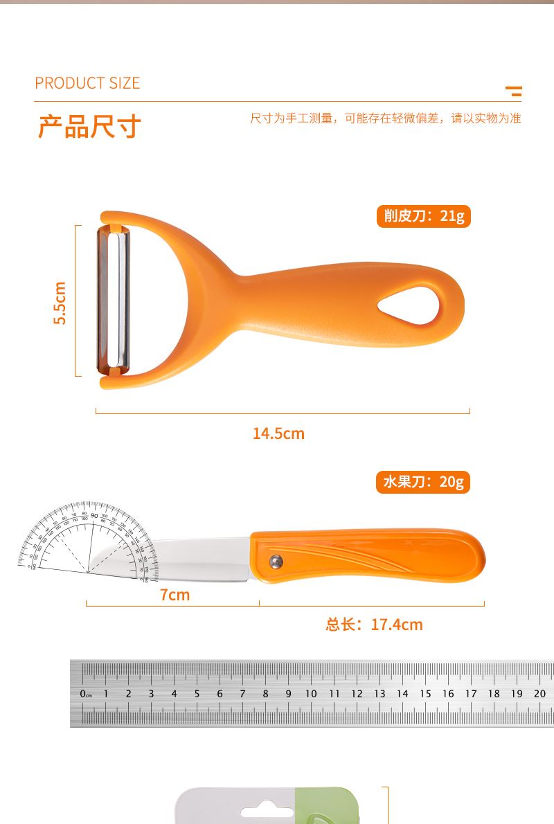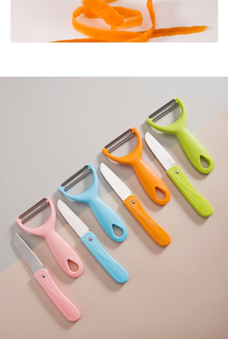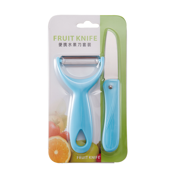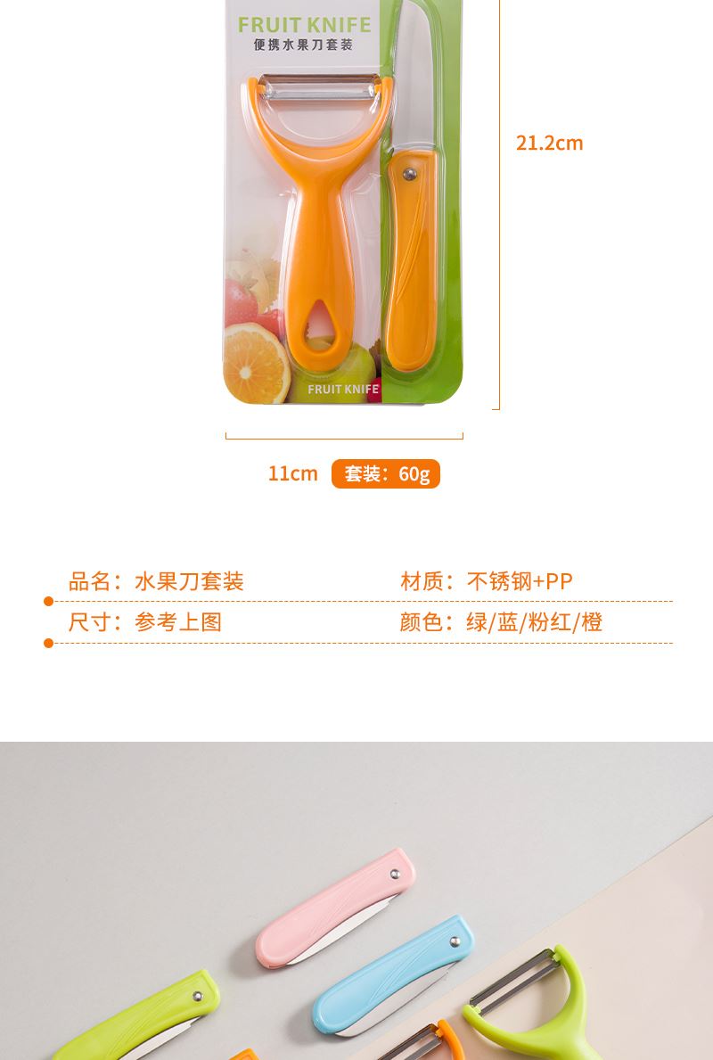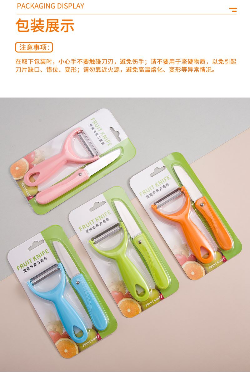 产品组合:水果刀 瓜刨 产品规格: 水果刀:17.5 削皮器:14.5*5.2cmm 材 质:PP 陶瓷 包 装:吸卡 重量/套: 62g