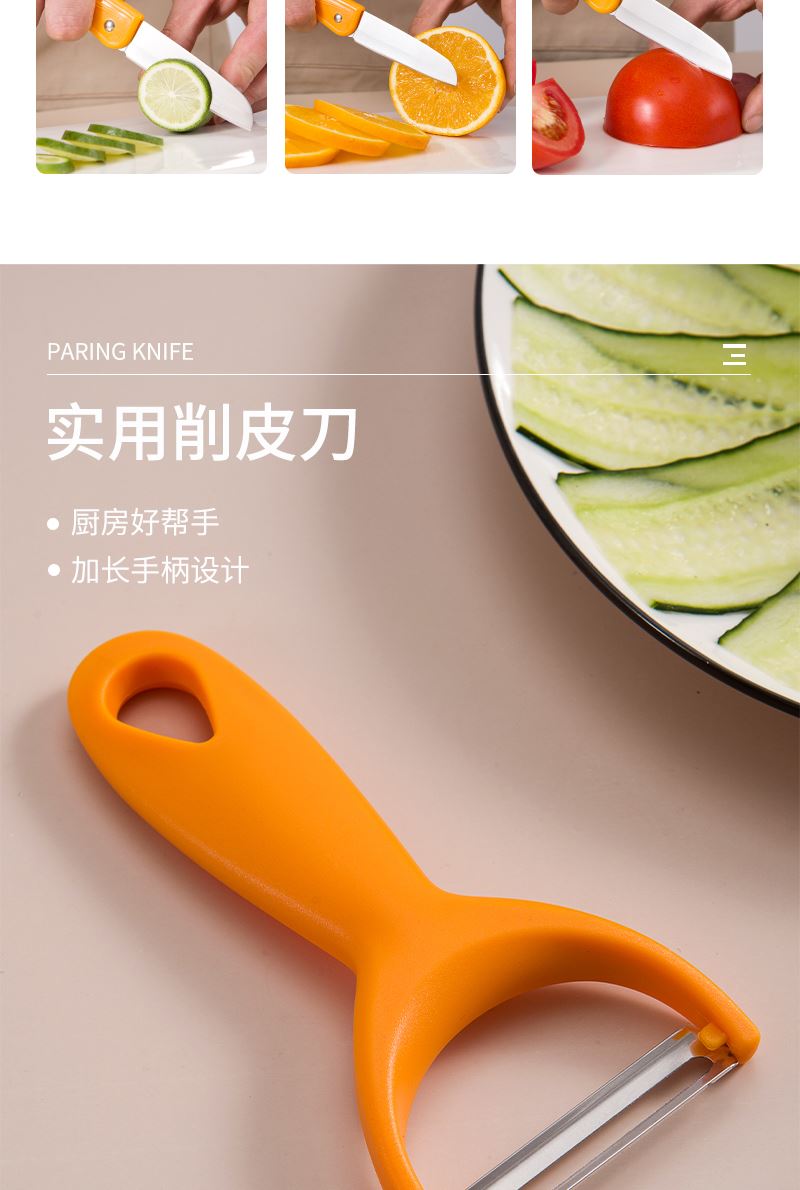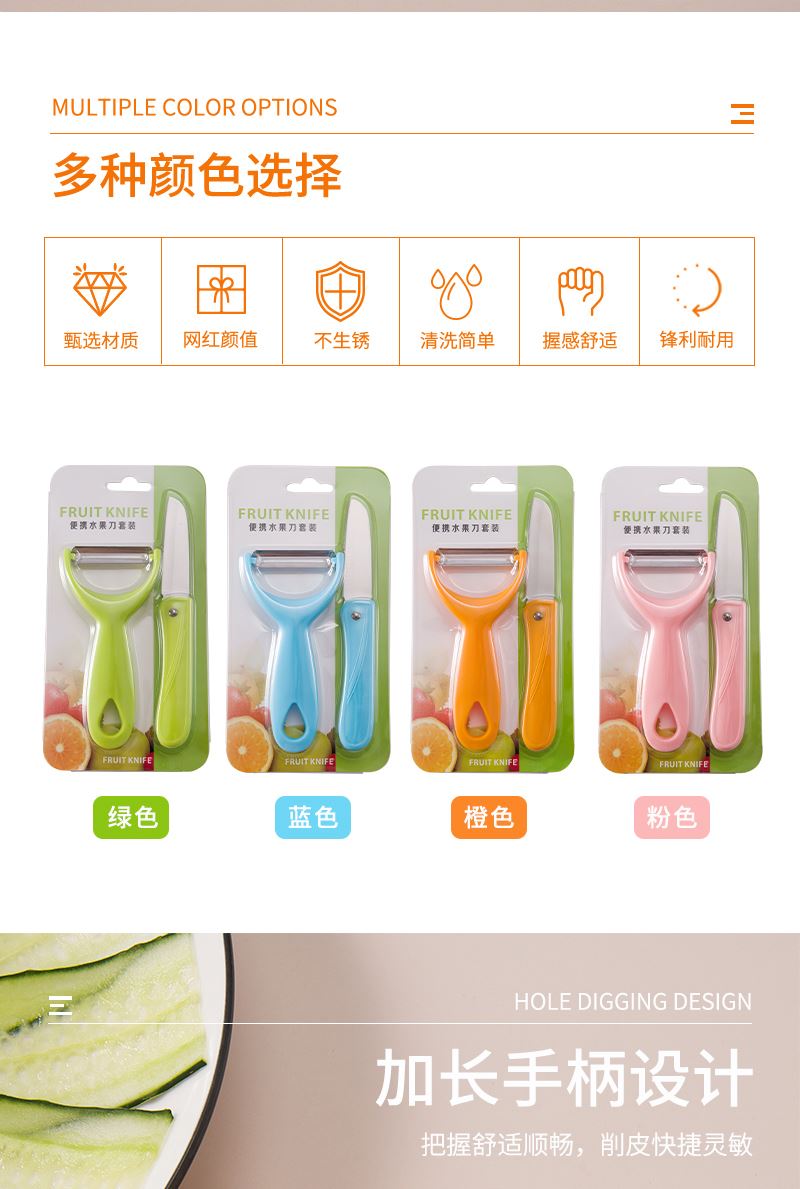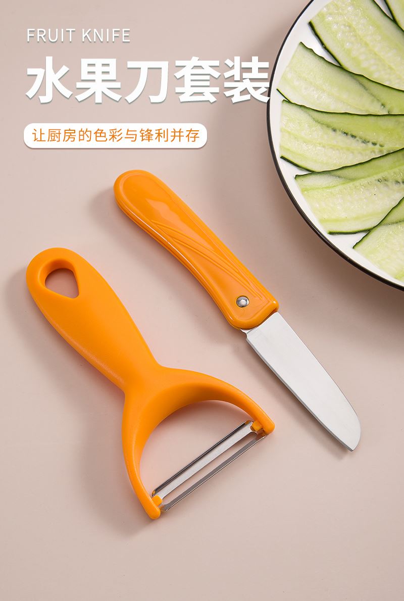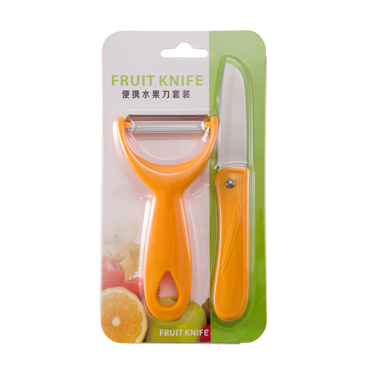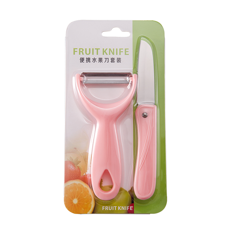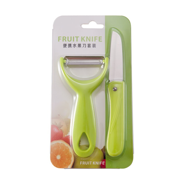 产品组合:水果刀 瓜刨 产品规格: 水果刀:17.5 削皮器:14.5*5.2cmm 材 质:PP 陶瓷 包 装:吸卡 重量/套: 62g