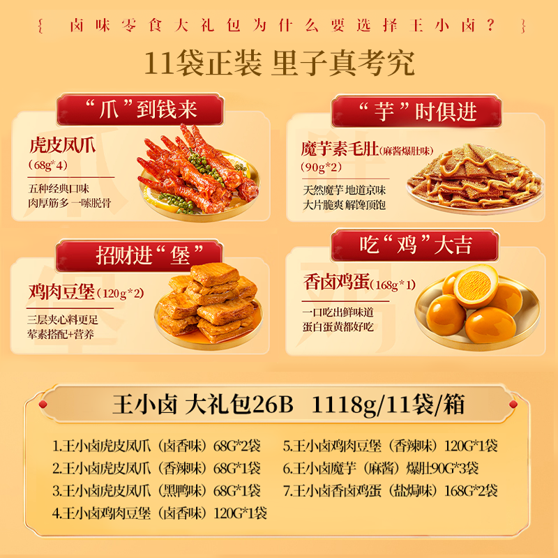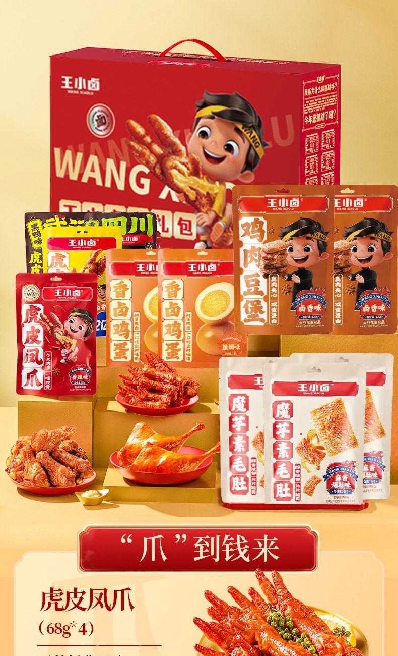 王小卤虎皮凤爪卤香味68g*2袋 王小卤虎皮凤爪香辣味68g*1袋 王小卤虎皮凤爪黑鸭味68g*1袋 王小卤鸡肉豆堡卤香味120g*1袋 王小卤鸡肉豆堡香辣味120g*1袋 王小卤魔芋麻酱爆肚90g*3袋 王小卤香卤鸡蛋(盐焗味)168g*2袋