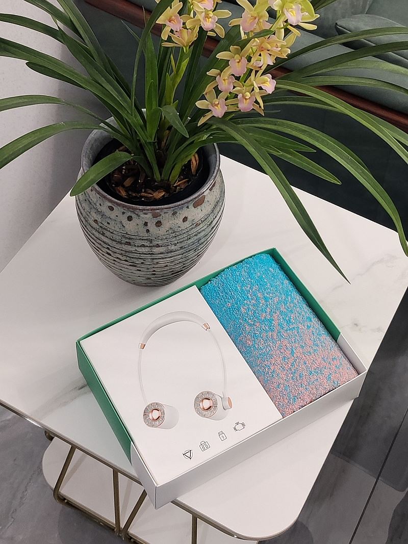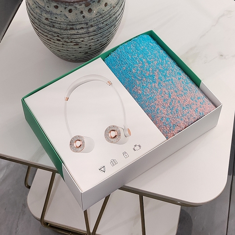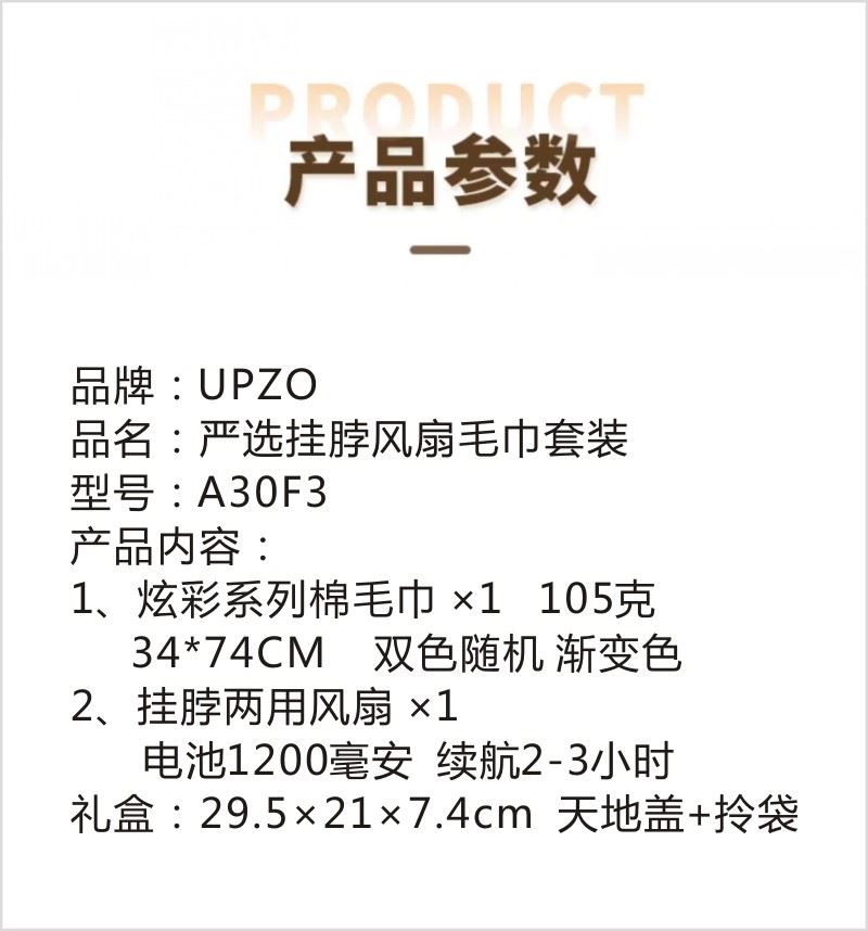 型号:A30F3 产品内容: 1、炫彩系列棉毛巾×1 (双色随机 渐变色) 规格: 34CM*74CM (105g每条) 2、挂脖两用风扇 ×1 电池容量 : 1200毫安 续航2-3小时 礼盒:29.5×21×7.4cm 天地盖+拎袋 挂脖风扇 1200毫安 3档可调 挂脖设计解放双手 炫彩系列毛巾精选精梳棉材质结合色织工艺 优质且靓丽