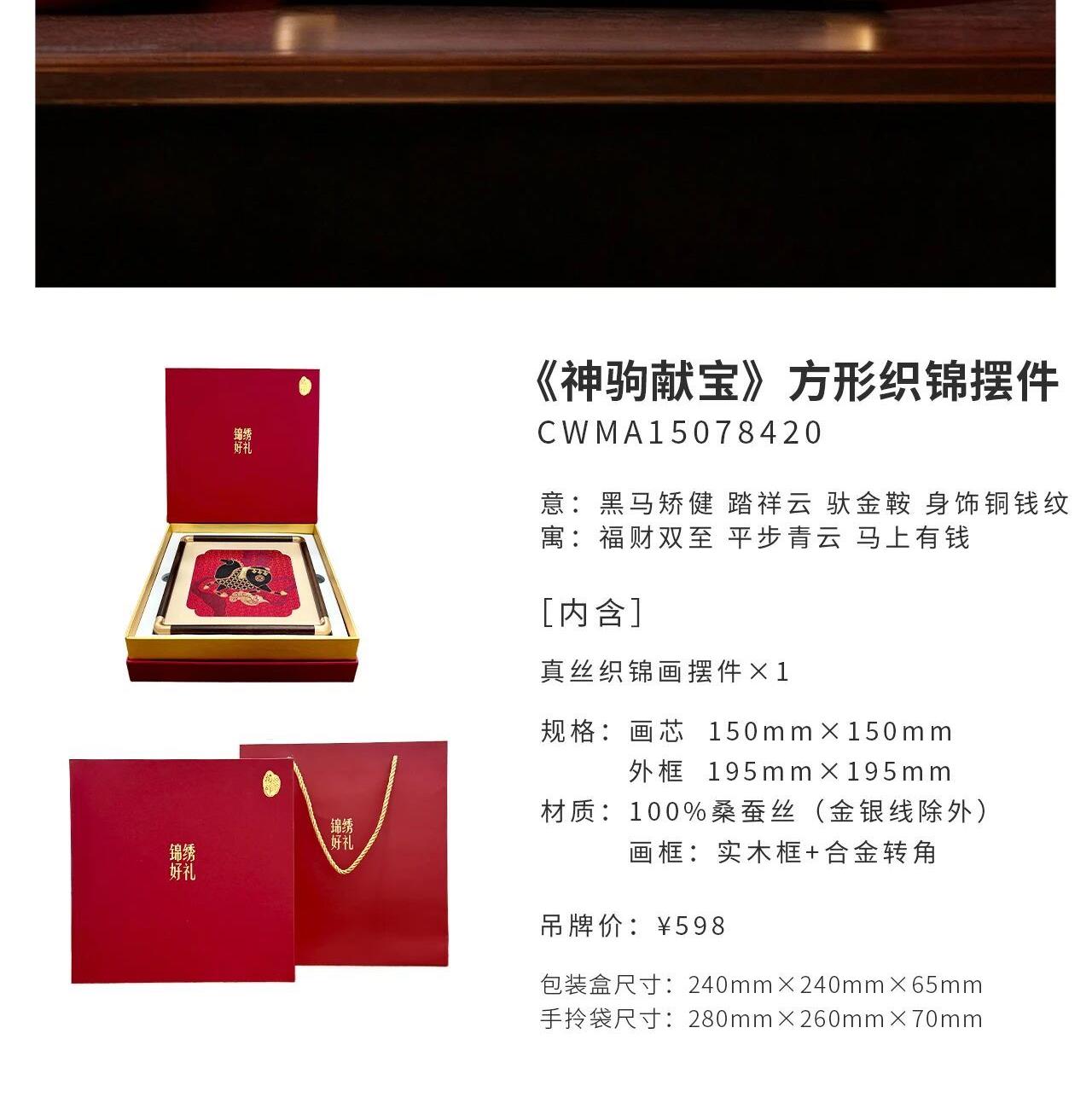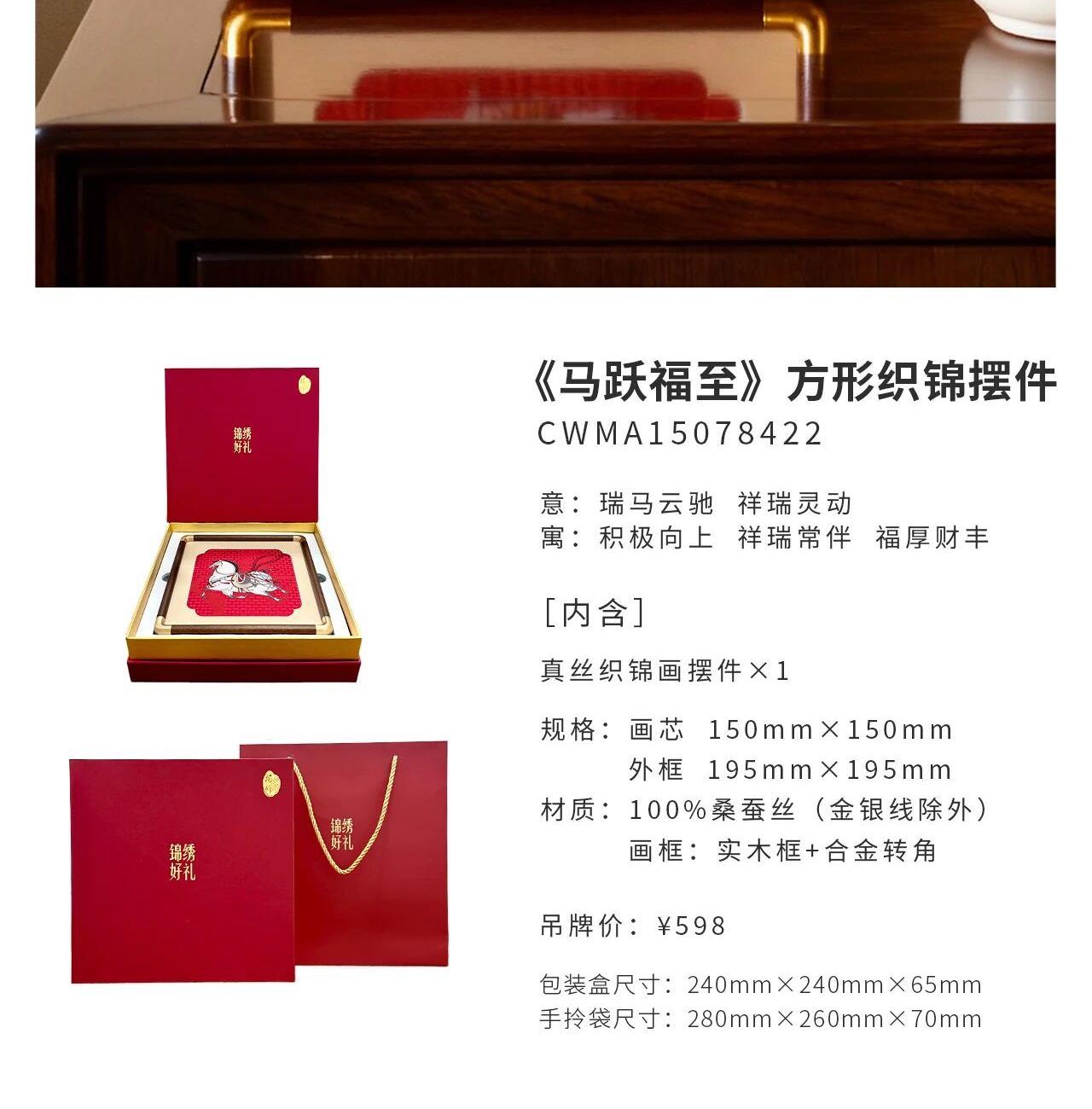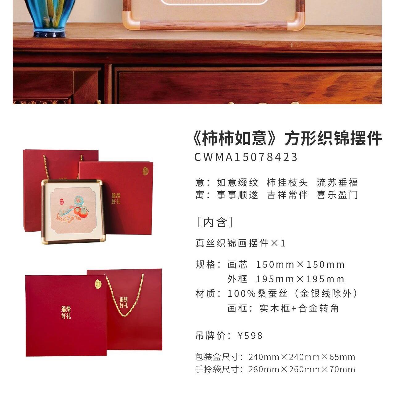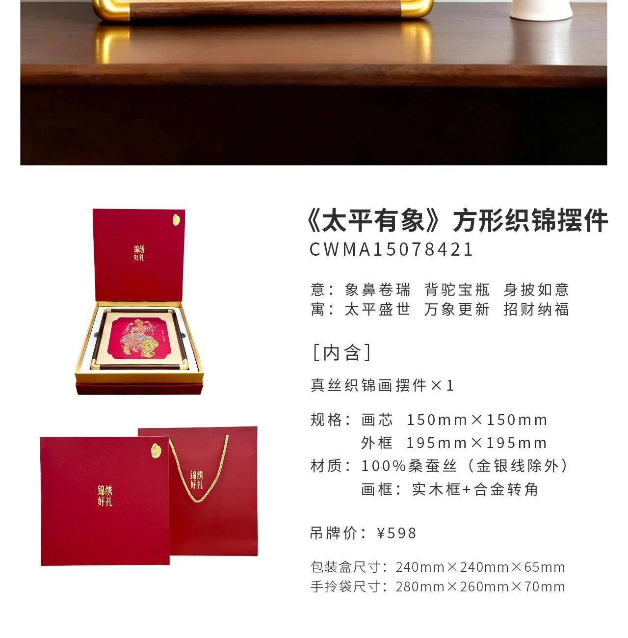 [内含] 真丝织锦画摆件x1 规格:画芯150mm×150mm 外框_195mm×195mm 材质:100桑蚕丝(金银线除外) 画框:实木框+合金转角 包装盒尺寸:240mm×240mm×65mm 手拎袋尺寸:280mm×260mm×70mm