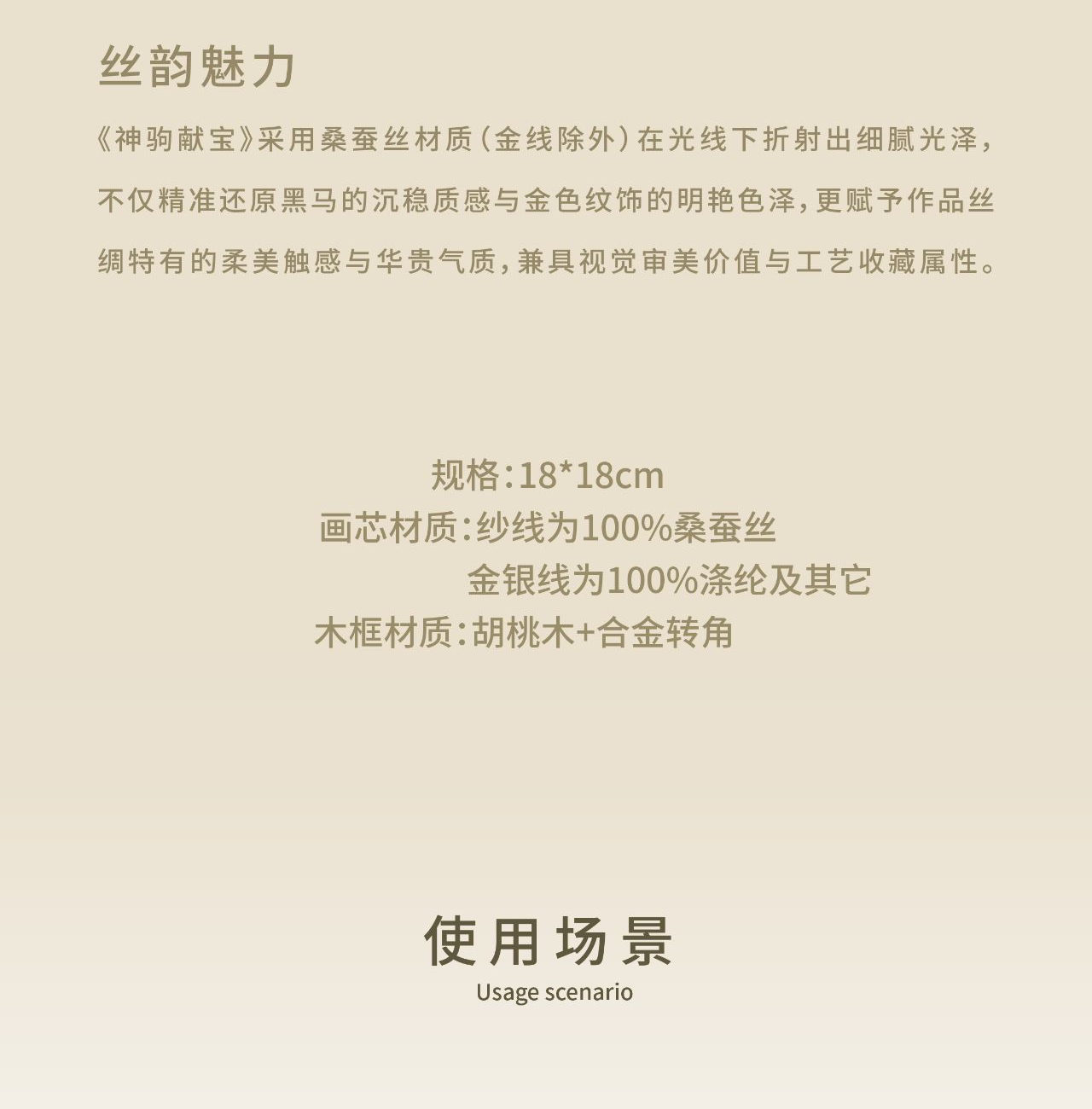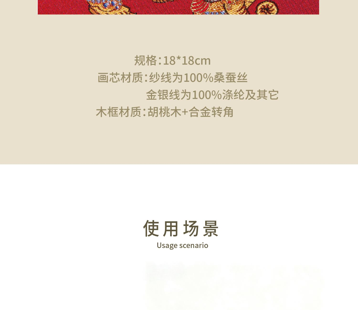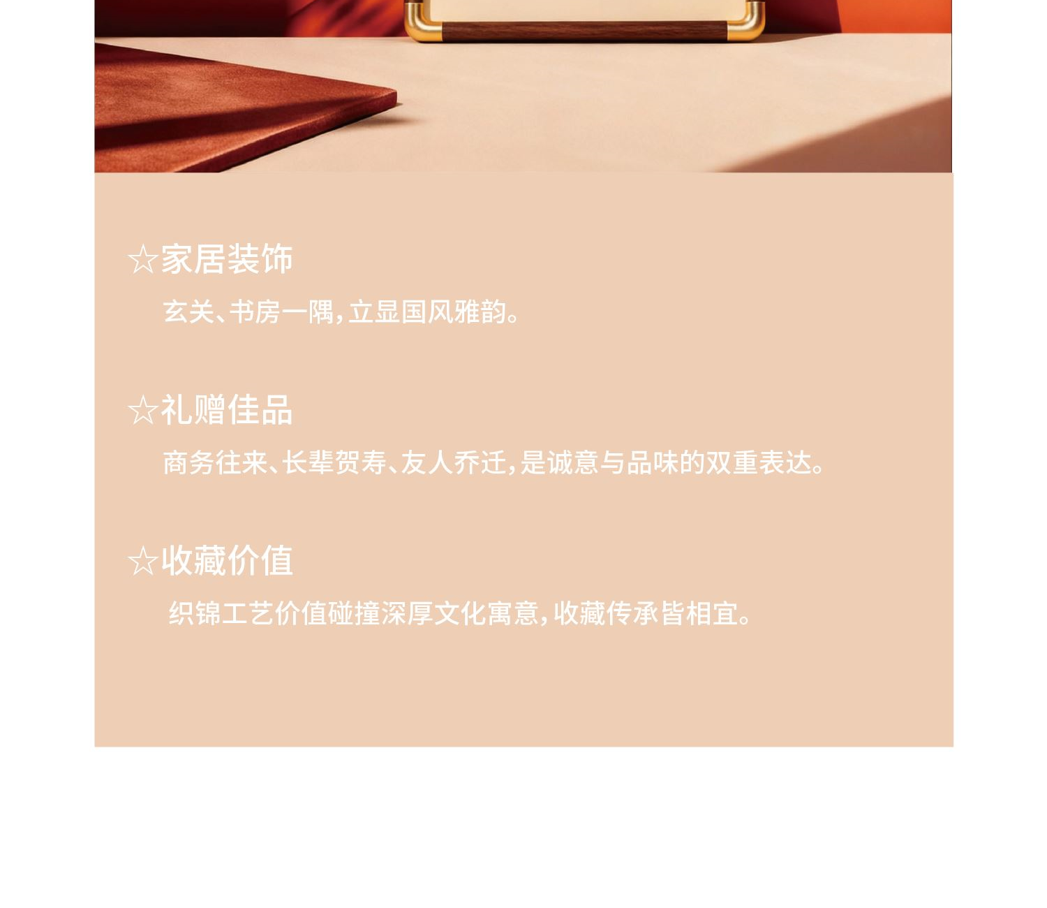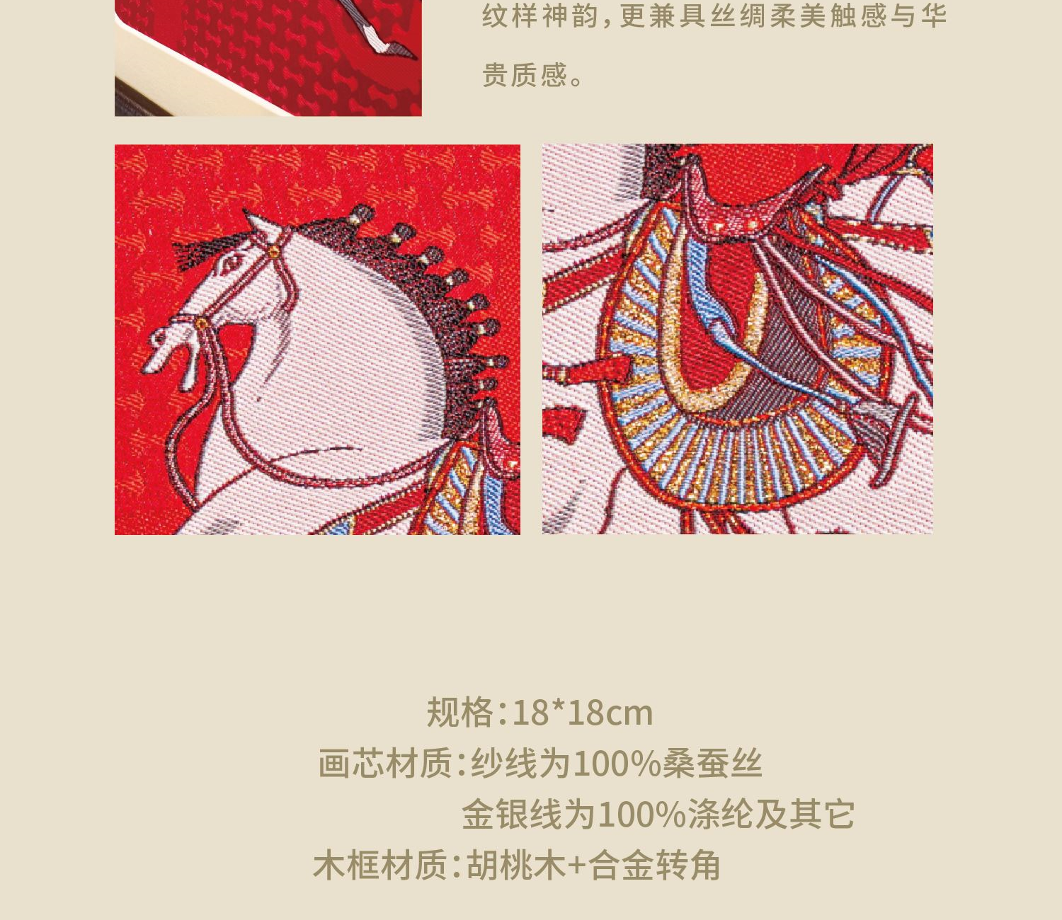 [内含] 真丝织锦画摆件x1 规格:画芯150mm×150mm 外框_195mm×195mm 材质:100桑蚕丝(金银线除外) 画框:实木框+合金转角 包装盒尺寸:240mm×240mm×65mm 手拎袋尺寸:280mm×260mm×70mm