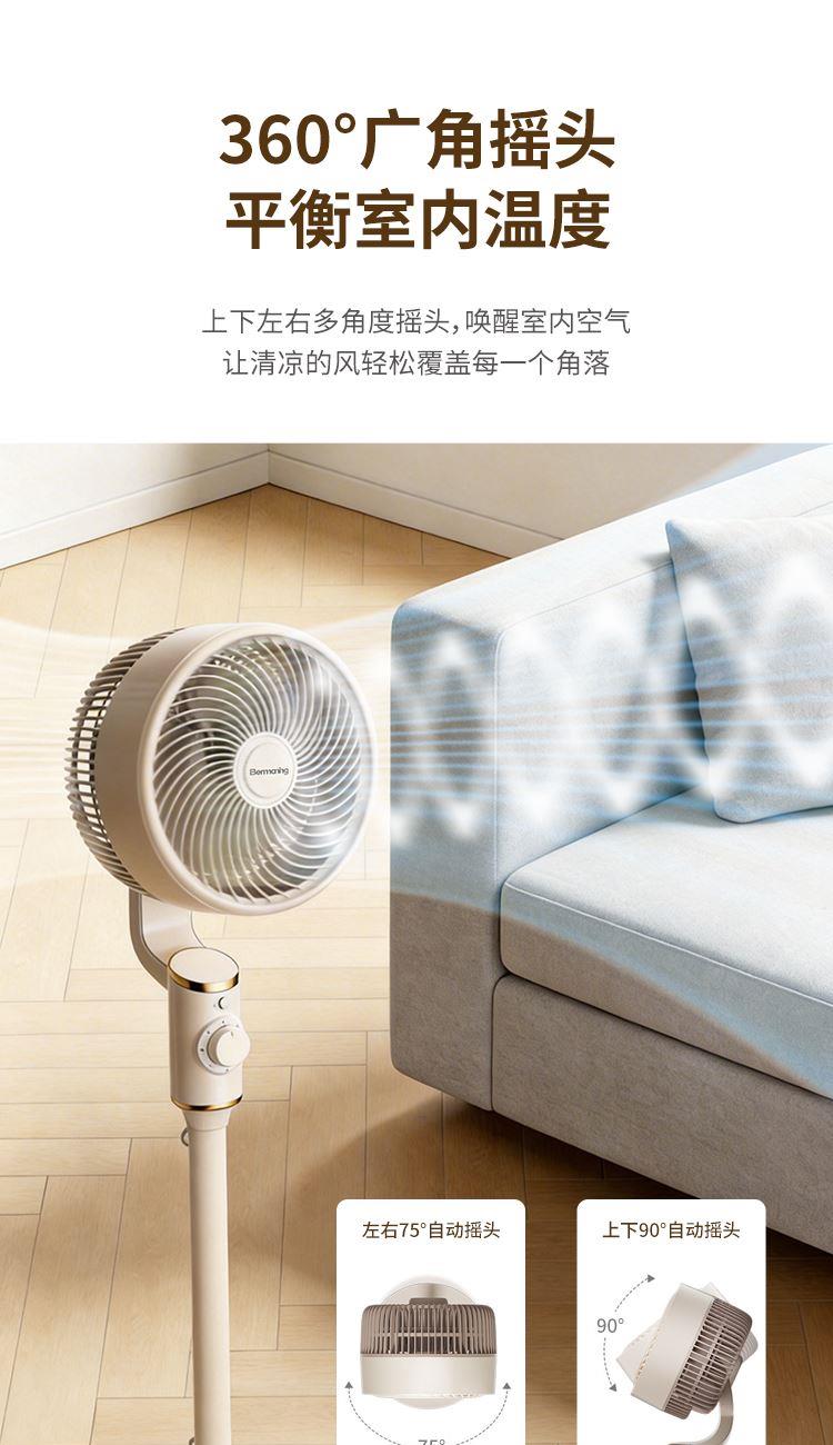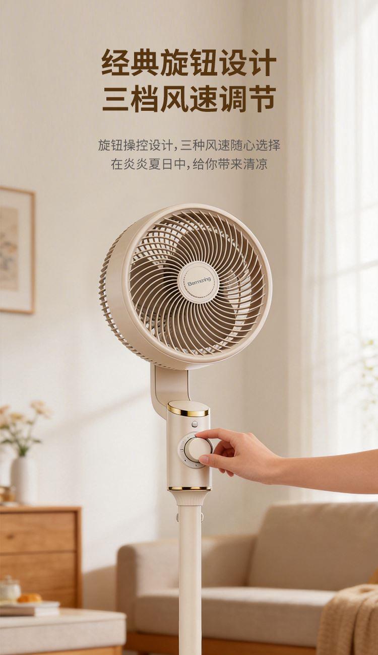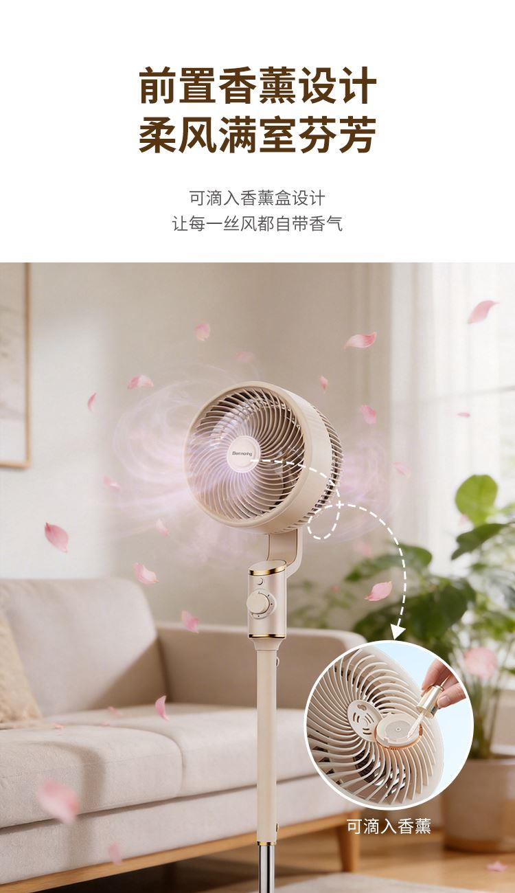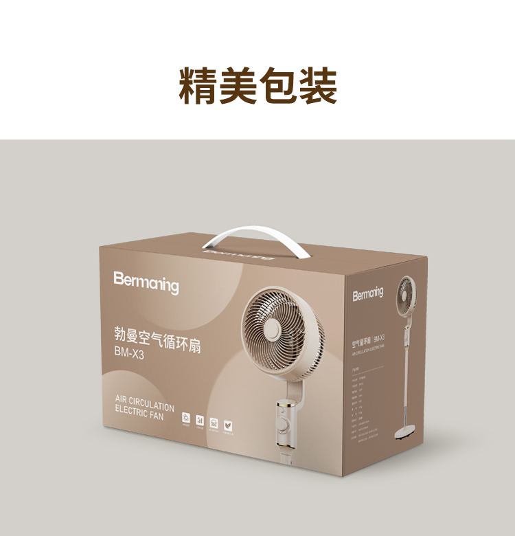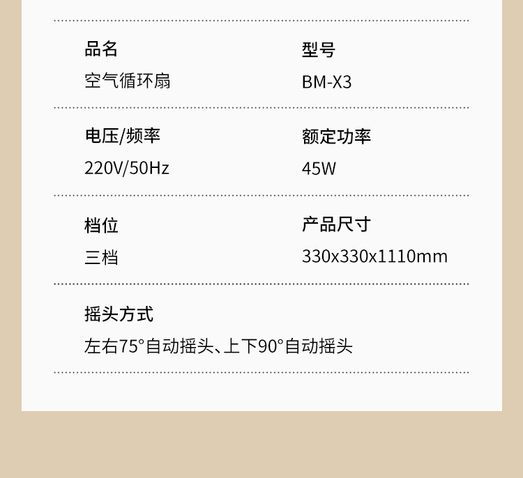 产品型号:BM-X3 额定电压:220V~ 额定频率:50Hz 额定功率:45W 净重:4.2kg 毛重:5.3kg 操作方式:机械款 涡流推射送风系统 超大倾角螺旋3片扇叶,7m/s远距离送风,清凉直达全屋 3档风速一键切换,旋钮操作简单直观 上下左右自动8字摇头,全屋空气无死角流动,清凉覆盖无遗漏 专属内置香薰设计,清风自带怡人香气,让全屋沉浸在清新氛围里 简约机身设计,时尚美观 优质稳固底盘+可升降钢管,整机运行更平稳; 隐形式提手,移动收纳更便捷。