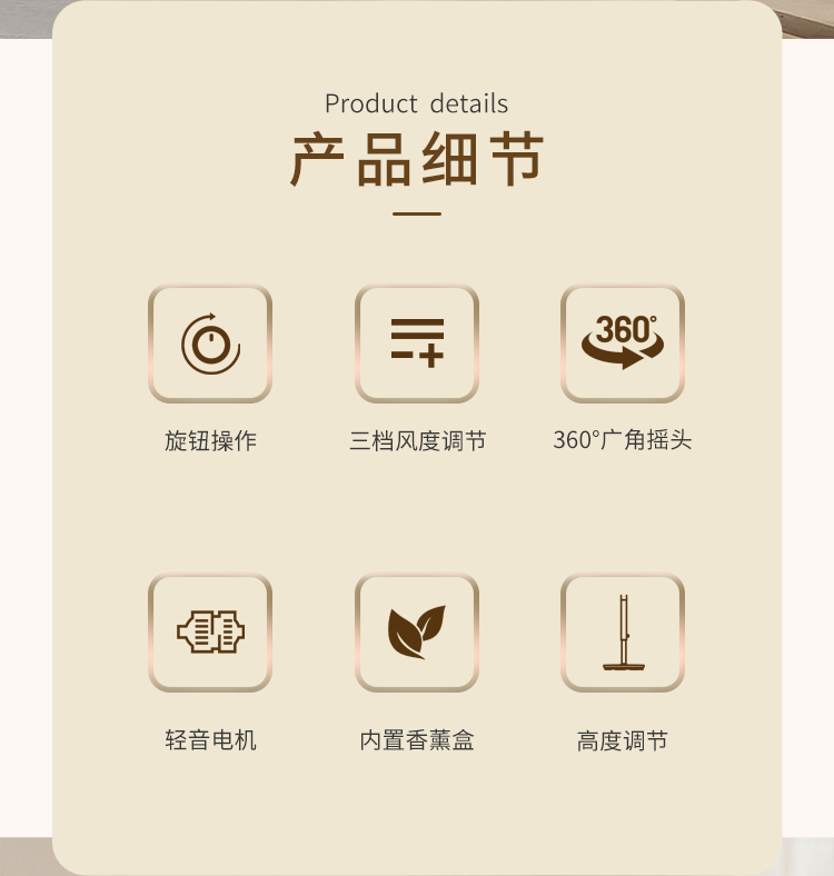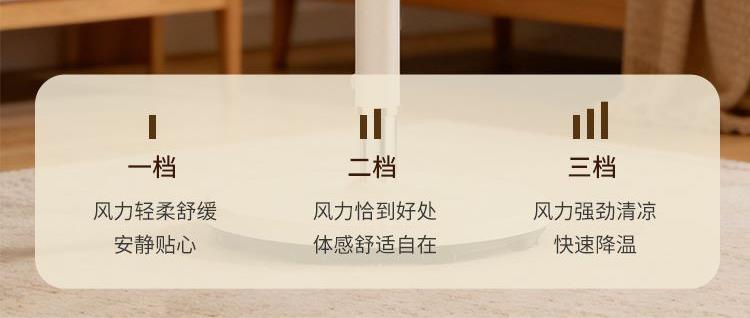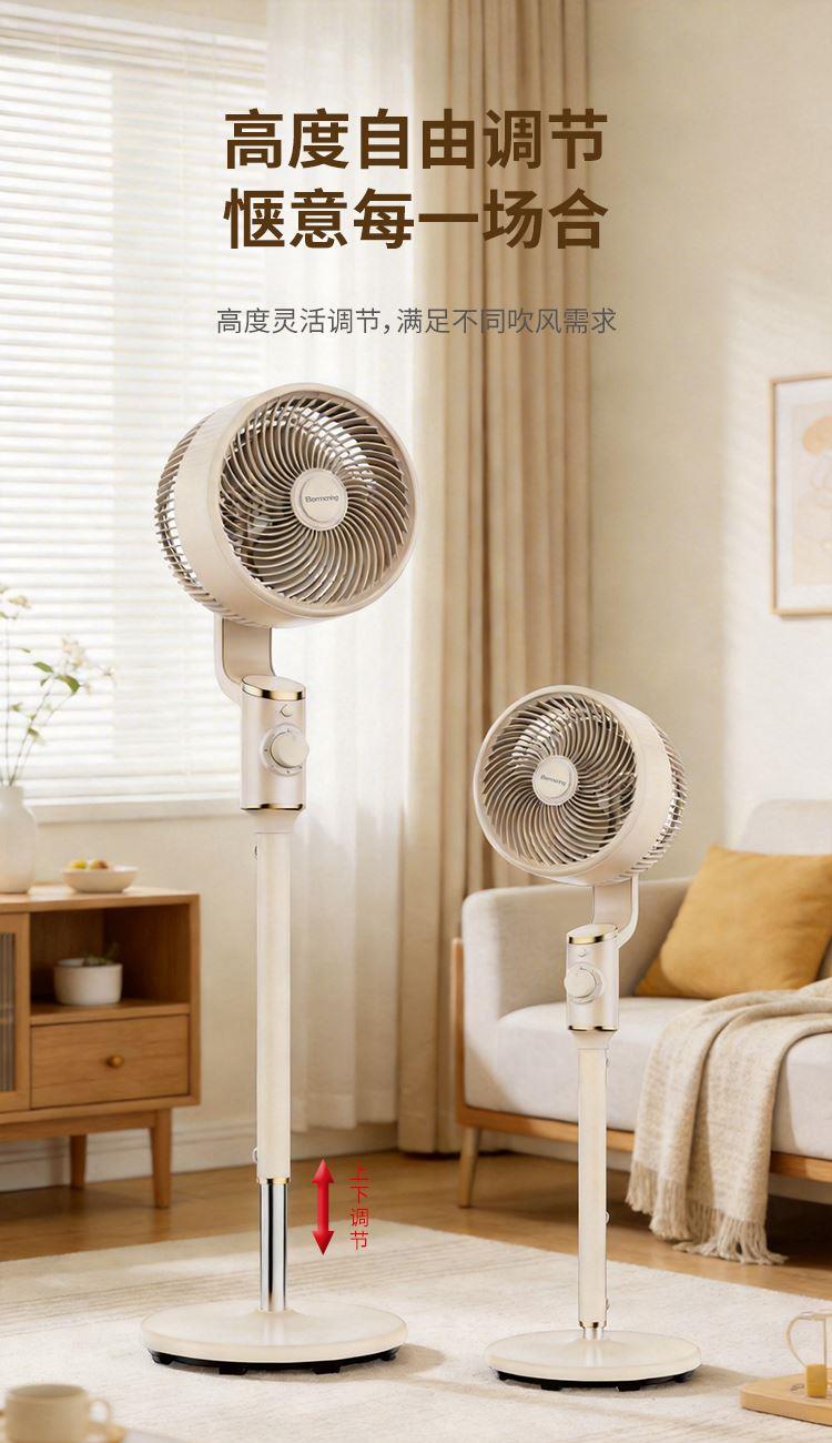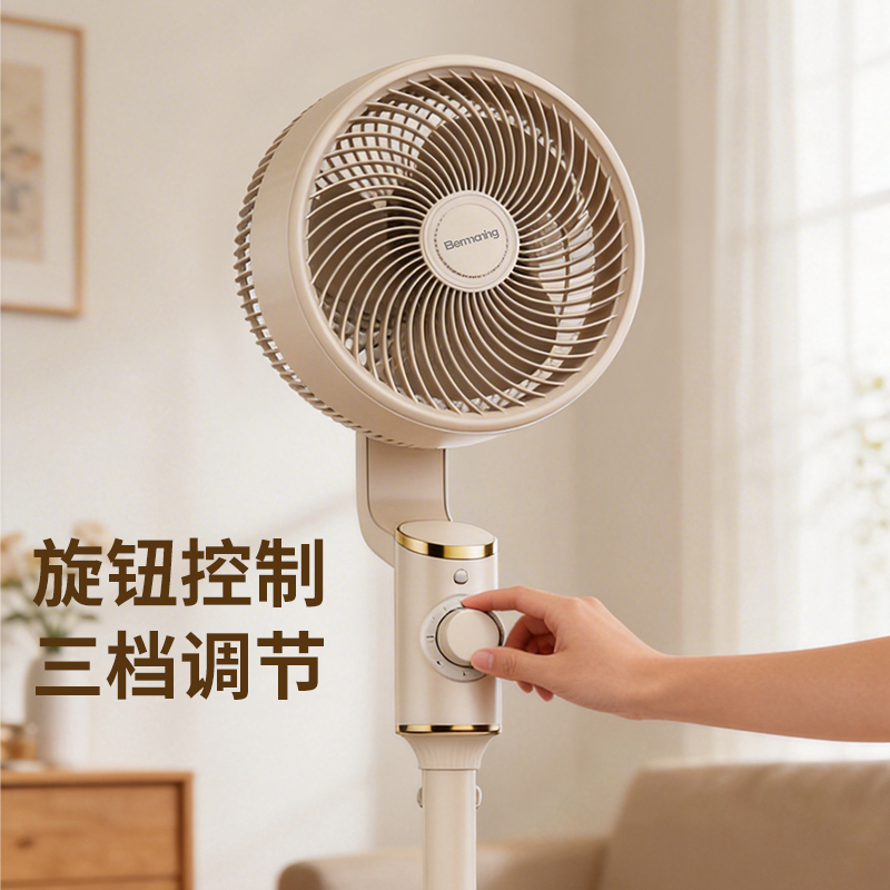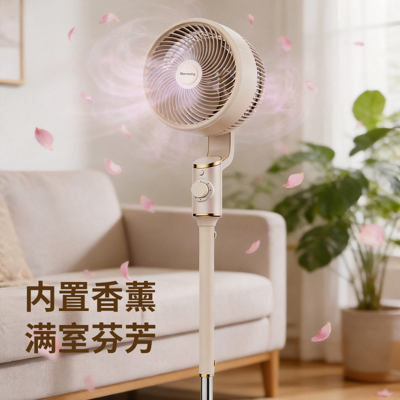 产品型号:BM-X3 额定电压:220V~ 额定频率:50Hz 额定功率:45W 净重:4.2kg 毛重:5.3kg 操作方式:机械款 涡流推射送风系统 超大倾角螺旋3片扇叶,7m/s远距离送风,清凉直达全屋 3档风速一键切换,旋钮操作简单直观 上下左右自动8字摇头,全屋空气无死角流动,清凉覆盖无遗漏 专属内置香薰设计,清风自带怡人香气,让全屋沉浸在清新氛围里 简约机身设计,时尚美观 优质稳固底盘+可升降钢管,整机运行更平稳; 隐形式提手,移动收纳更便捷。