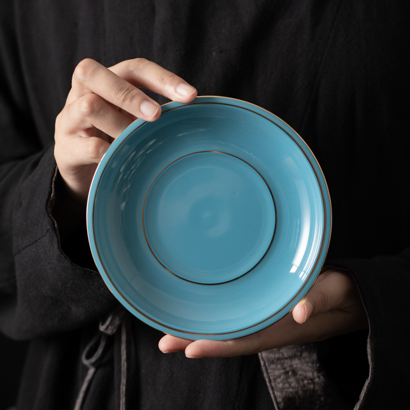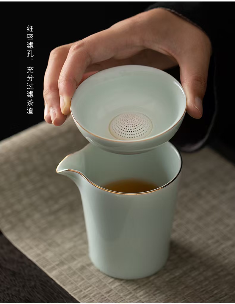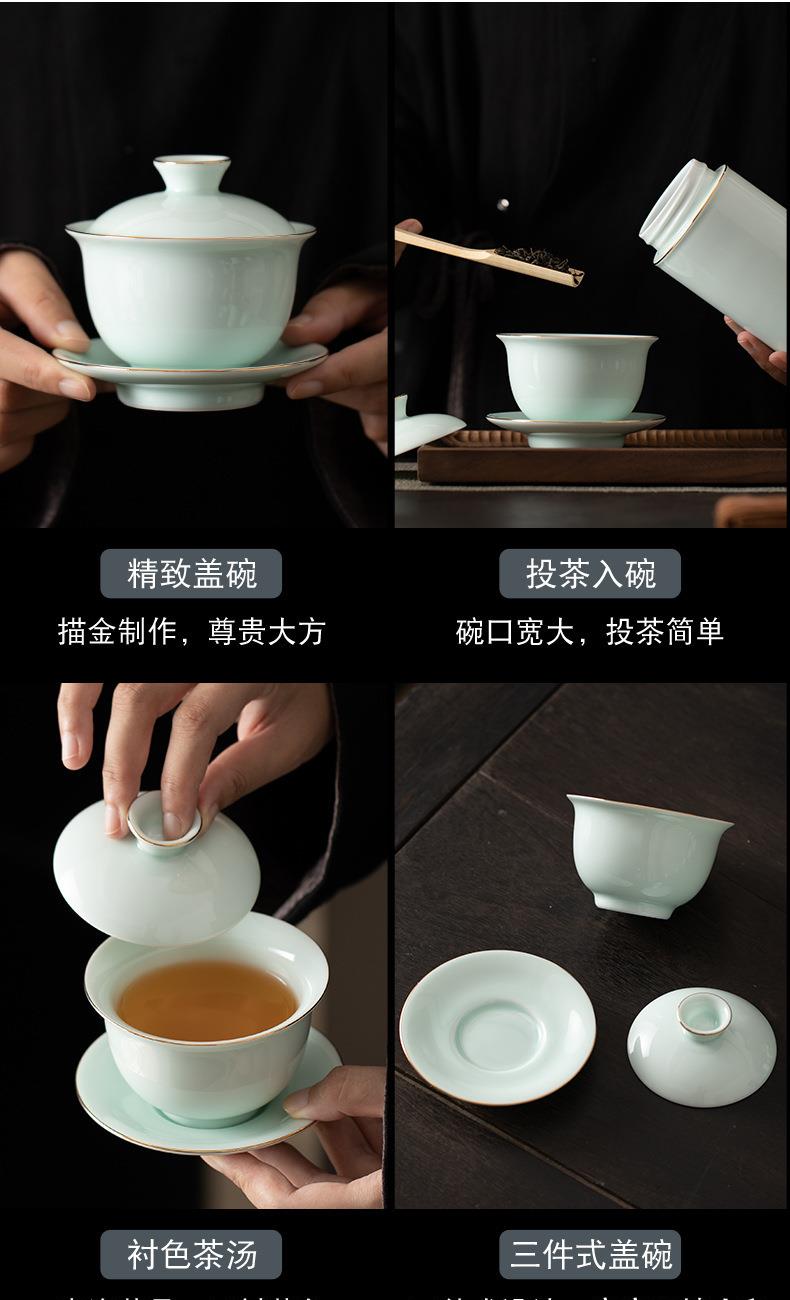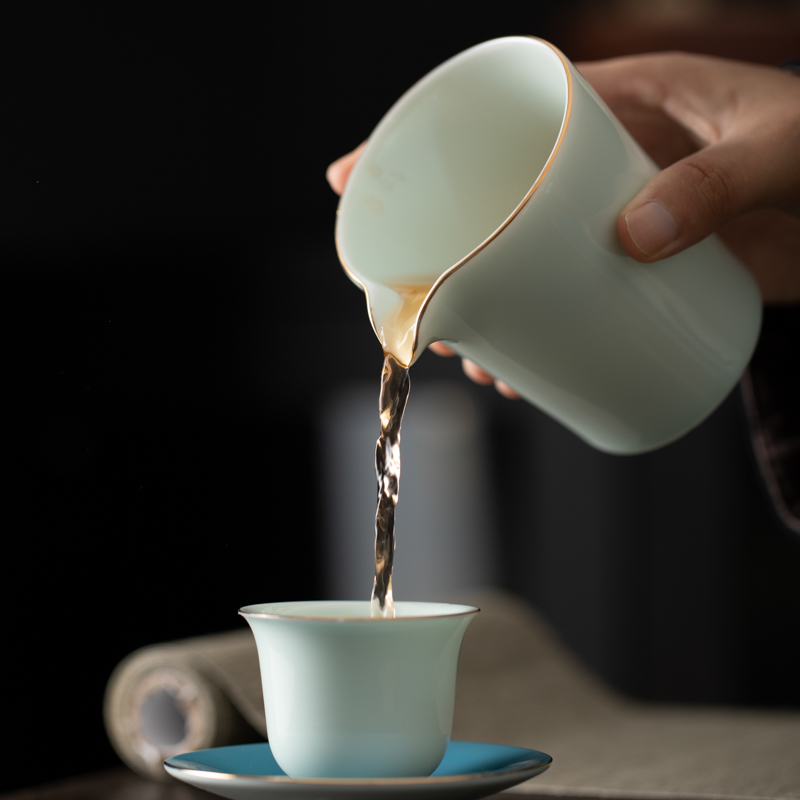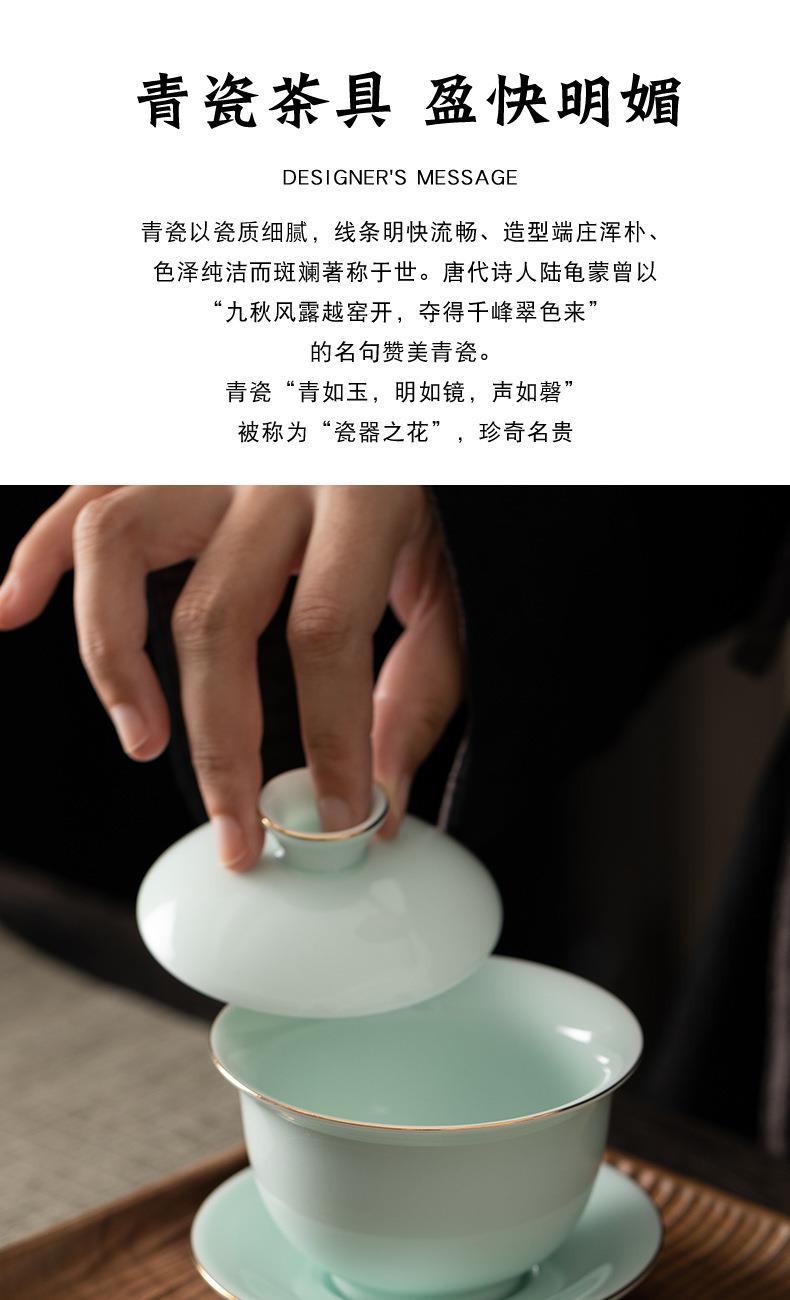 配制:1盖碗6杯 1公道杯1茶托1茶漏 1锦盒 规格: 公道杯:9.2*9.1cm 茶杯:6cm*5cm 盖碗:9.5*9.5cm 材质:青山玉 24K真金 推荐说明:青山玉是青瓷新品,以瓷质细腻,线条明快流畅,色泽纯洁而斑斓著称。青如玉,明如镜,声如磬,描24K真金奢华装饰,被称为瓷器之花。