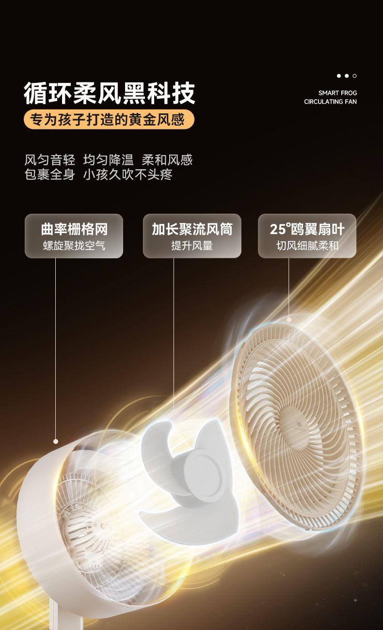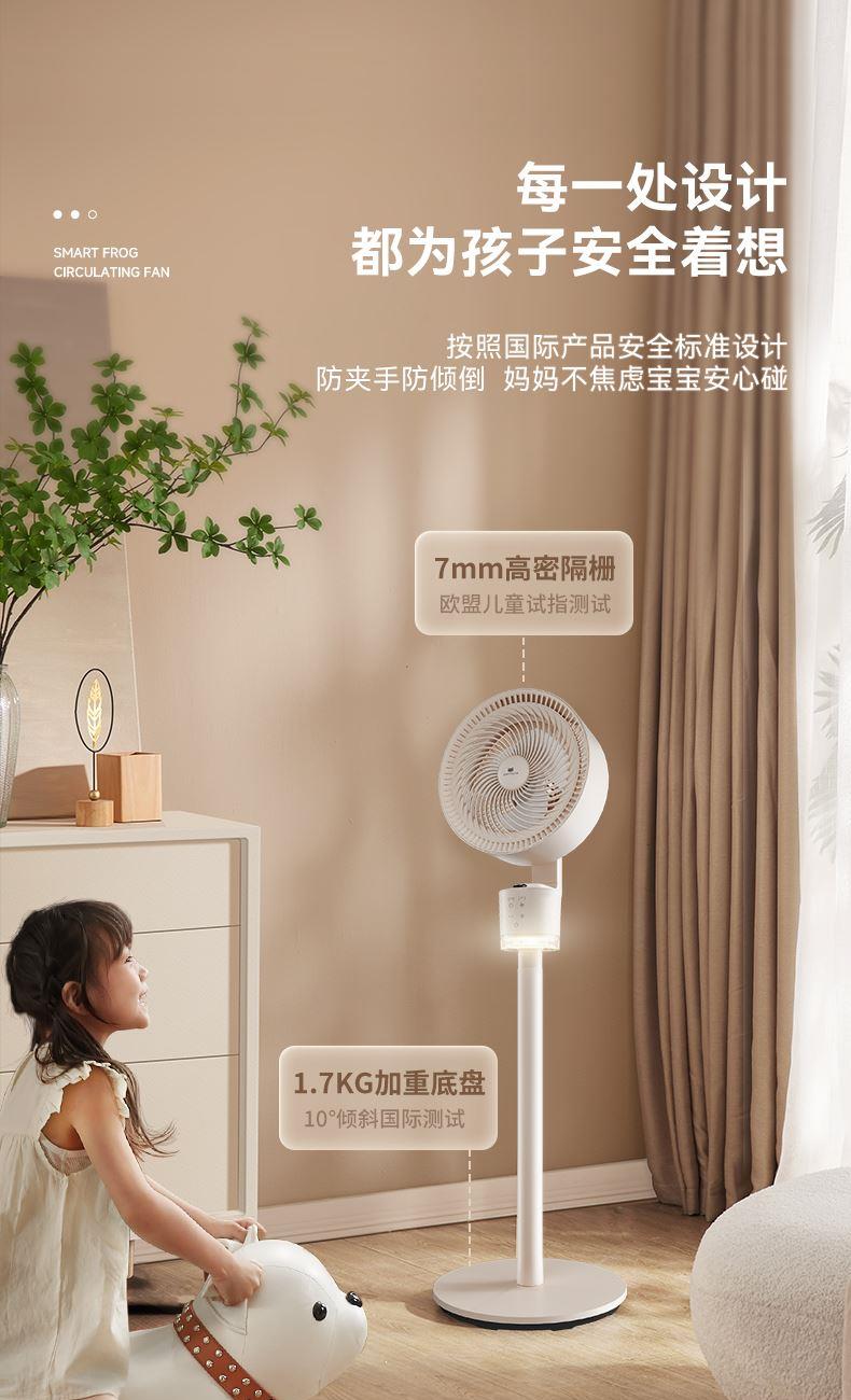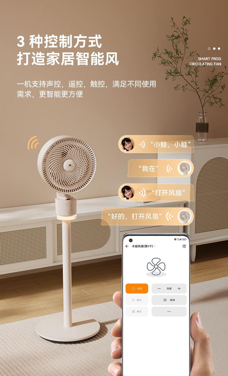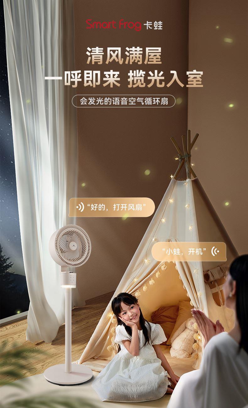 懒人语音控制,不用音响,无需联网,开机即用 高灵敏语音识别,小蛙专属萌趣音色 3种操控方式,一机支持声控、遥控、触控 明暗柔光,两档可调,支持独立使用 柔和风感黑科技,轻音运行,专为家人打造,久吹不头疼 广角送风,加速全屋空气流动,清凉快速送达 符合国际产品安全标准,防夹手防倾倒 台立两用,整机可拆易清洗