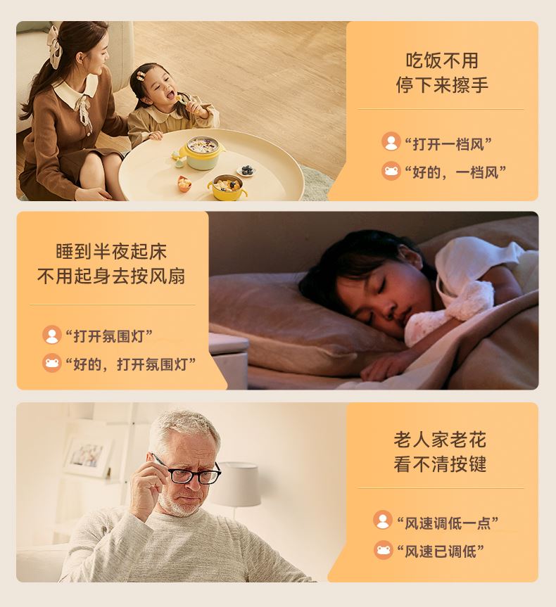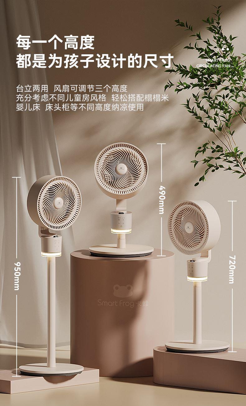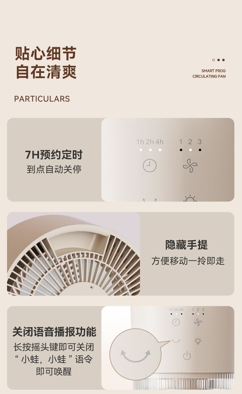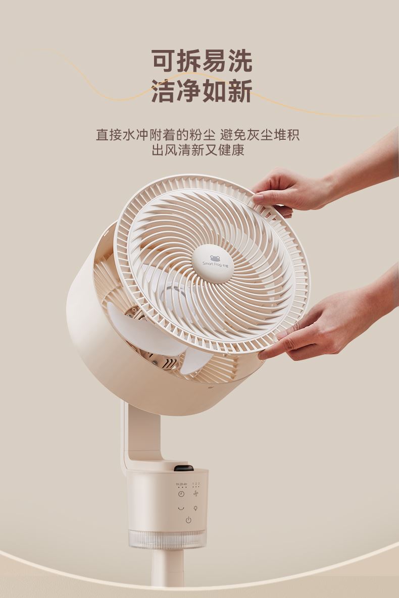 懒人语音控制,不用音响,无需联网,开机即用 高灵敏语音识别,小蛙专属萌趣音色 3种操控方式,一机支持声控、遥控、触控 明暗柔光,两档可调,支持独立使用 柔和风感黑科技,轻音运行,专为家人打造,久吹不头疼 广角送风,加速全屋空气流动,清凉快速送达 符合国际产品安全标准,防夹手防倾倒 台立两用,整机可拆易清洗