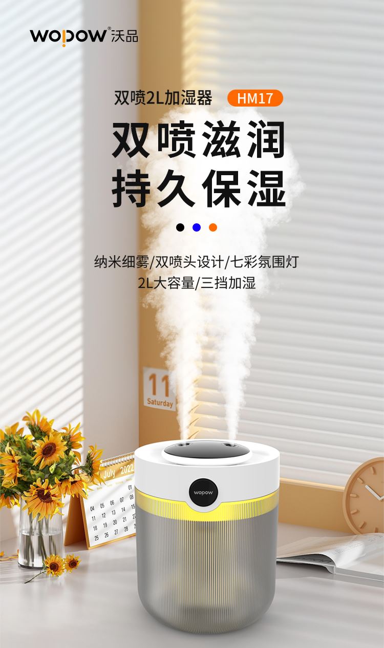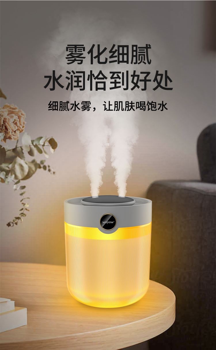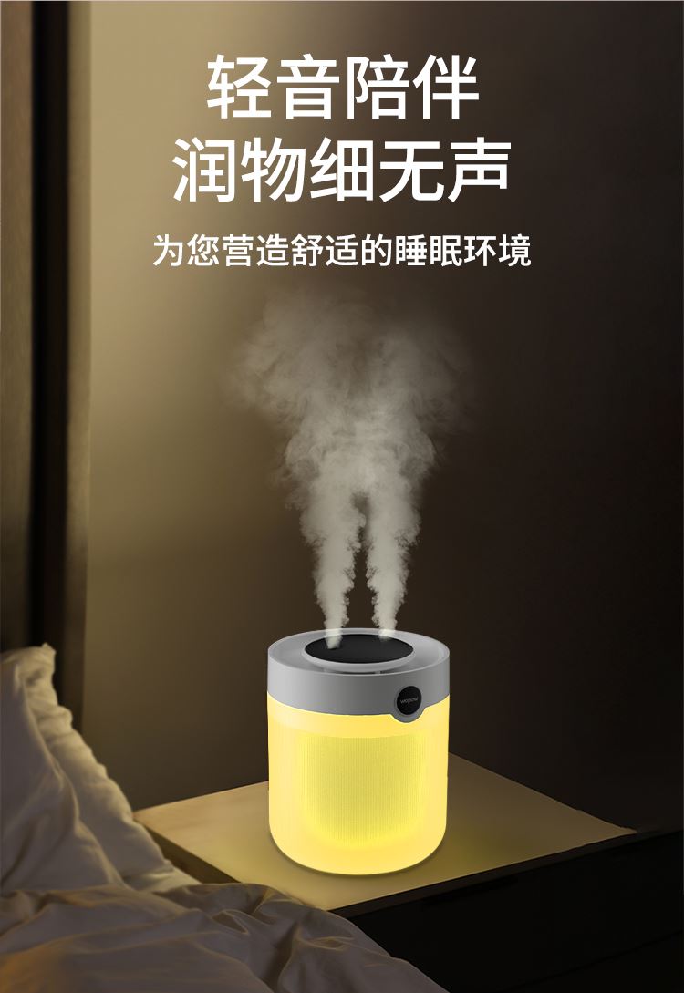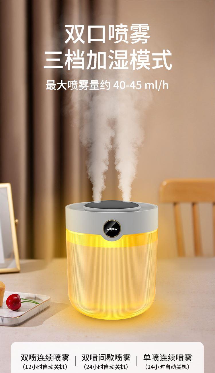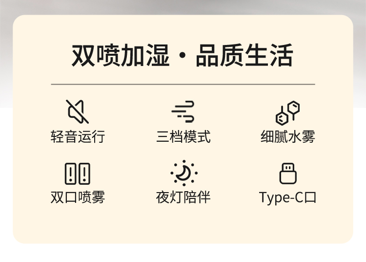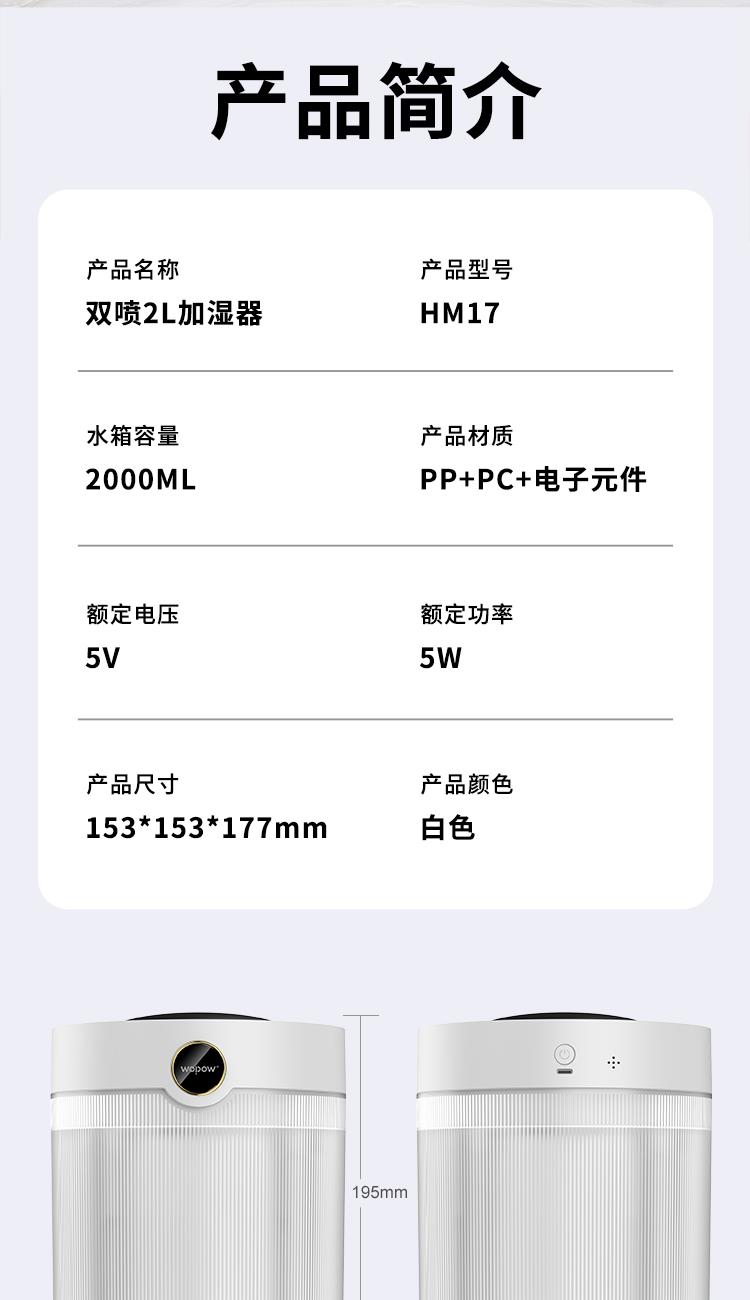 容量:2L 产品尺寸:153*153*177mm 包装尺寸:165*165*202.5mm 产品重量:165g 喷雾时间:单喷:50小时,双喷:25小时 双喷雾连续喷雾12小时自动关机,单喷雾连续喷雾24小时自动关机 喷雾量:约40-45ML/H 颜色:白 材质:PP/PC/电子元件 七彩氛围灯光,双喷头 静音加湿,纳米细雾 轻音运行,一键操作 TYPE-C输入,2L大容量 三档加湿,便携上加水,四季通用