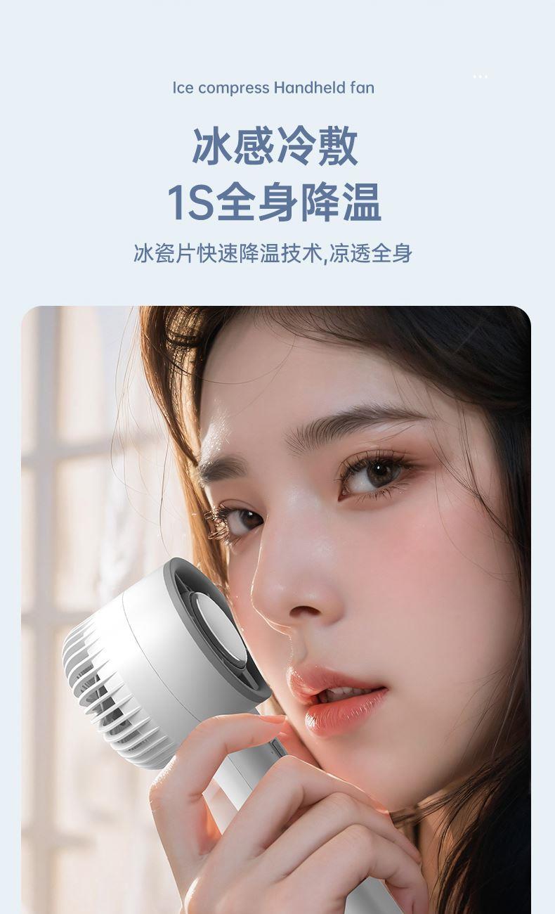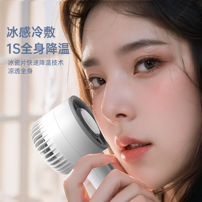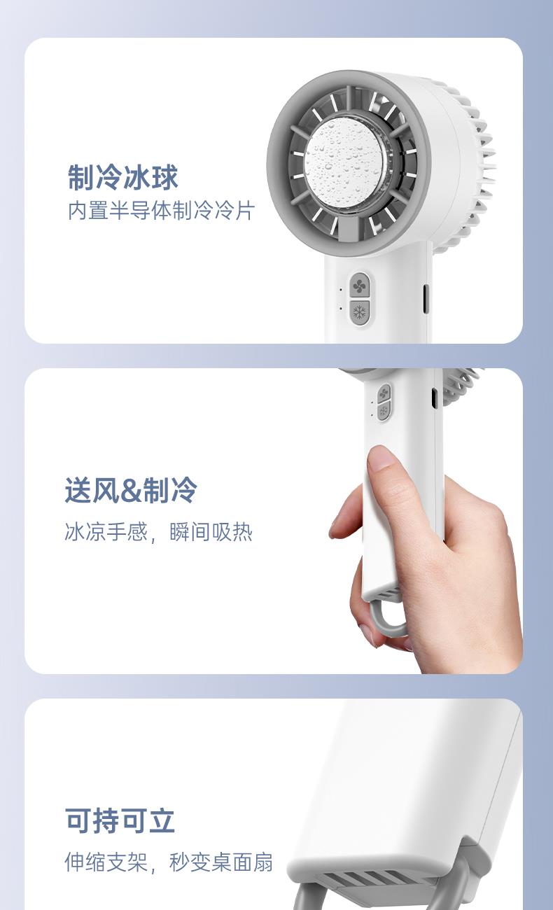 电池容量:1500mAh 产品尺寸:6*6*15.5cm 产品尺寸:6*6*15.8cm/200g 外箱尺寸:51*33.5*52.5cm/90台/18kg 产品颜色:灰色、白色、蓝色 产品标配:彩盒、主机、说明书、数据线 3档大风力,超导冰瓷制冷,极速降温 带登山扣,可手持、可桌面、可挂吊 1500mAh大电池,长续航