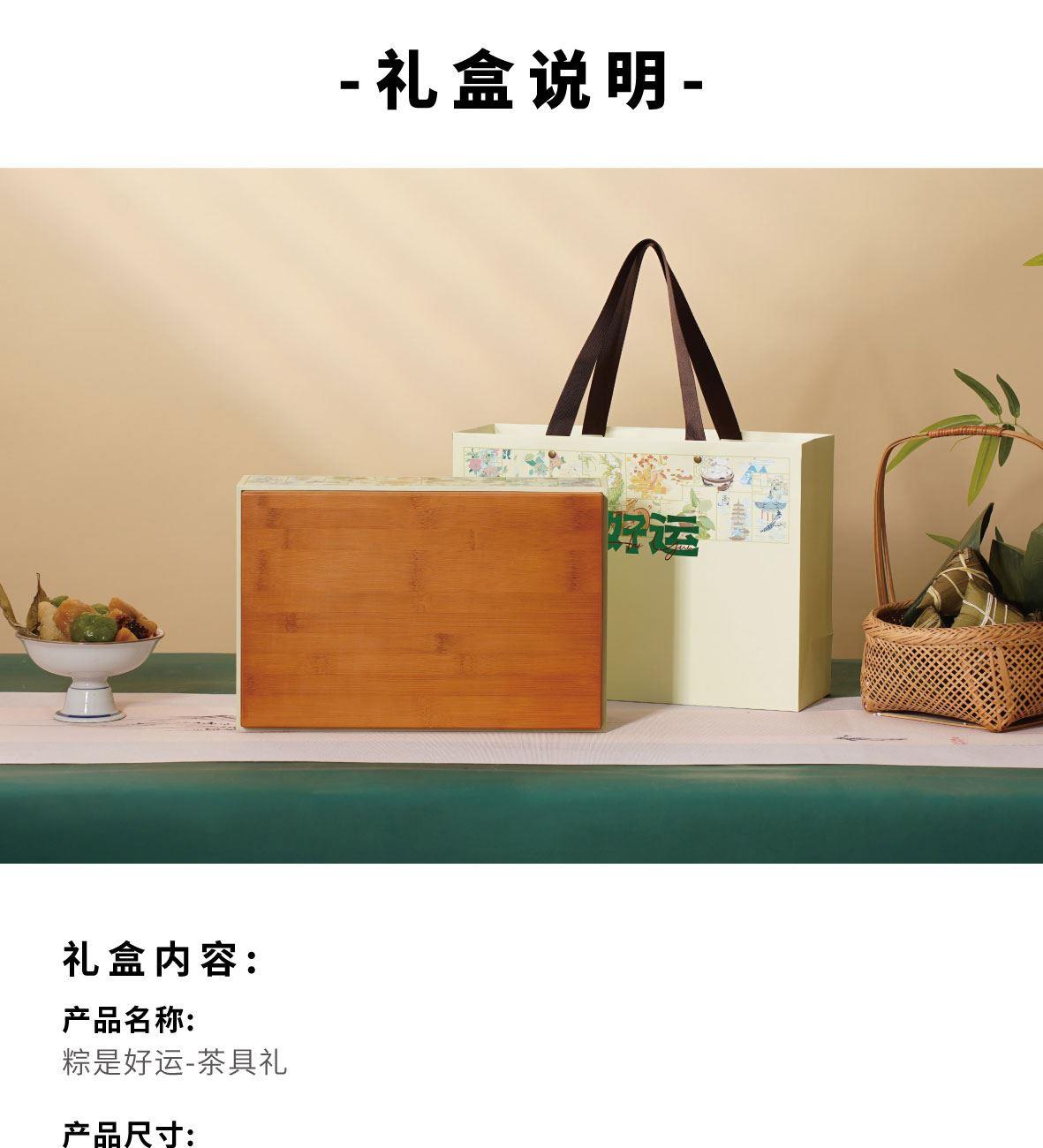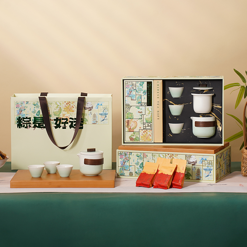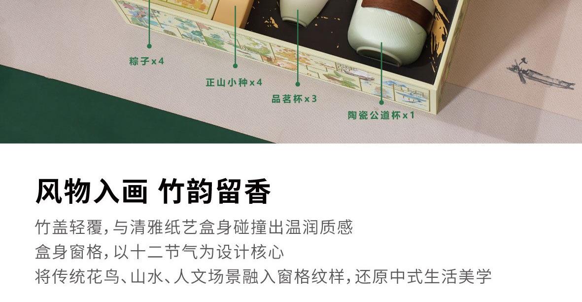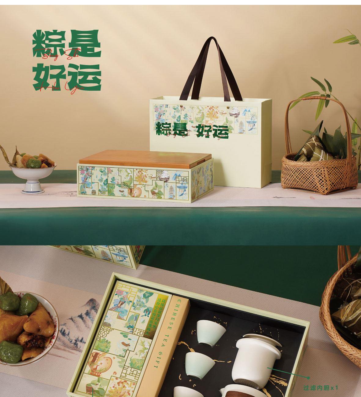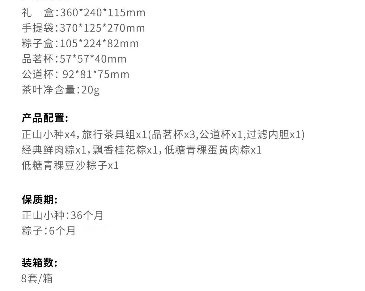 产品尺寸: 礼 盒:360*240*115mm 手提袋:370*125*270mm 粽子盒:105*224*82mm 品茗杯:57*57*40mm 公道杯:92*81*75mm 茶叶净含量:20g 产品配置: 正山小种x4,旅行茶具组x1(品茗杯x3,公道杯x1,过滤内胆x1) 经典鲜肉粽x1,飘香桂花粽x1,低糖青稞蛋黄肉粽x1 低糖青稞豆沙粽子x1 保质期: 正山小种:36个月 粽子:6个月