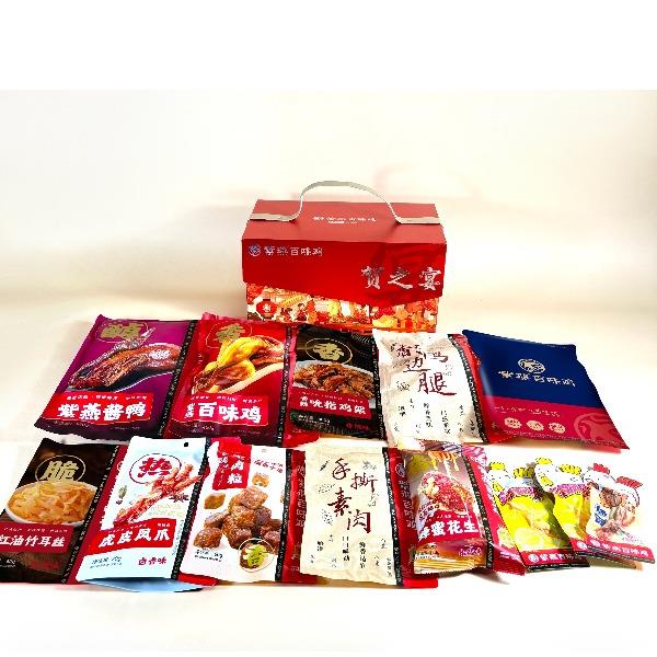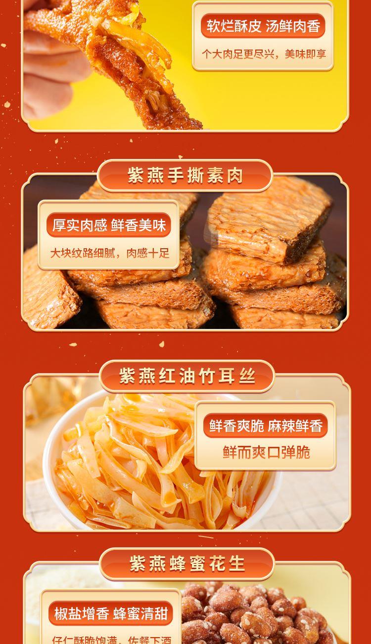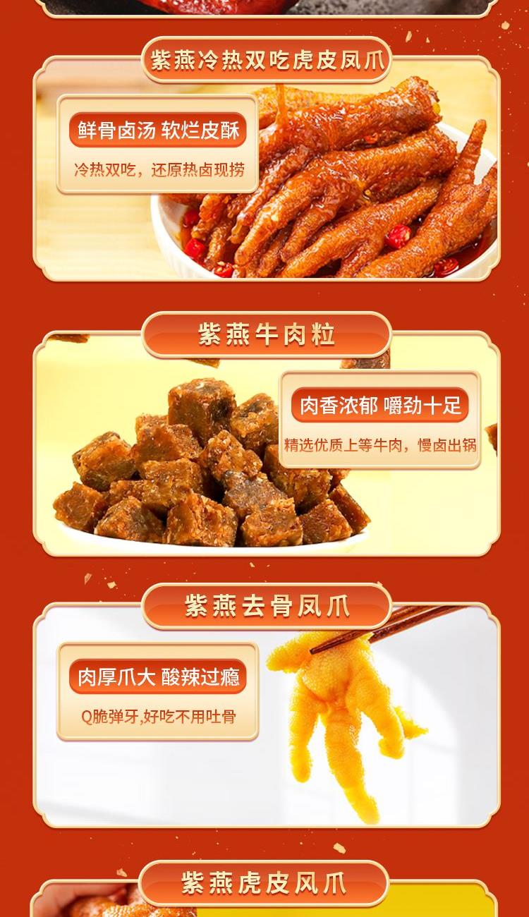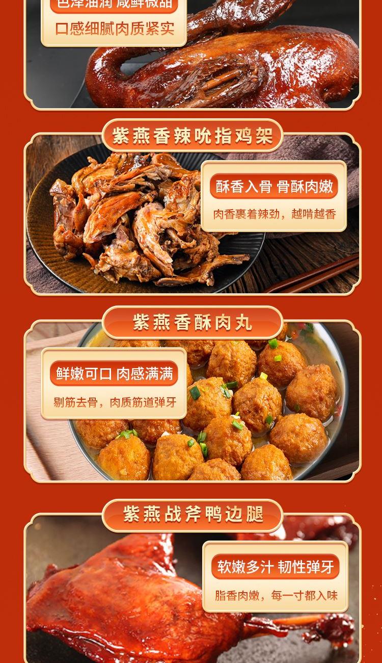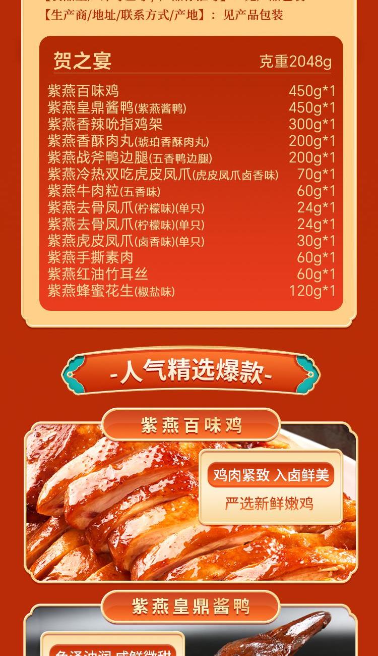 内容物配置: 紫燕百味鸡450g*1 紫燕皇鼎酱鸭(紫燕酱鸭)450g*1 紫燕香辣吮指鸡架300g*1 紫燕香酥肉丸(琥珀香酥肉丸)200g*1 紫燕战斧鸭边腿(五香鸭边腿)200g*1 紫燕冷热双吃虎皮凤爪(虎皮凤爪卤香味)70g*1 紫燕牛肉粒(五香味)60g*1 紫燕去骨凤爪(柠檬味)(单只)24g*1 紫燕去骨凤爪(柠檬味)(单只)24g*1 紫燕虎皮凤爪(卤香味)(单只)30g*1 紫燕手撕素肉60g*1 紫燕红油竹耳丝60g*1 紫燕蜂蜜花生(椒盐味)120g*1 贺之宴礼盒+组装+外盒