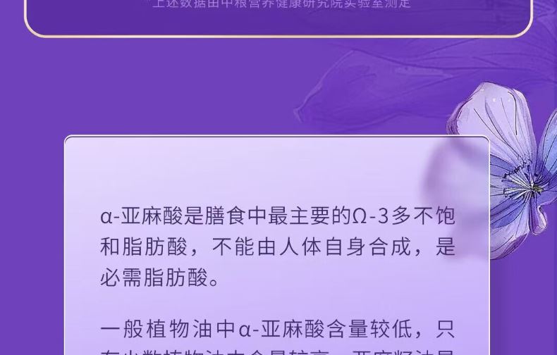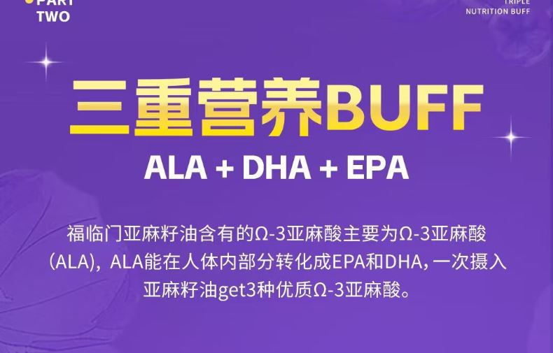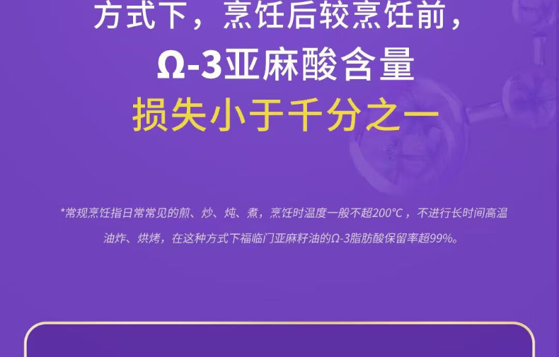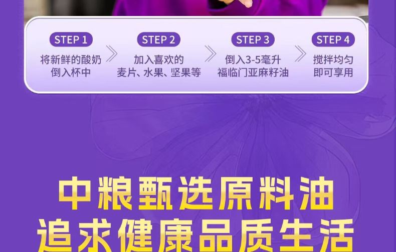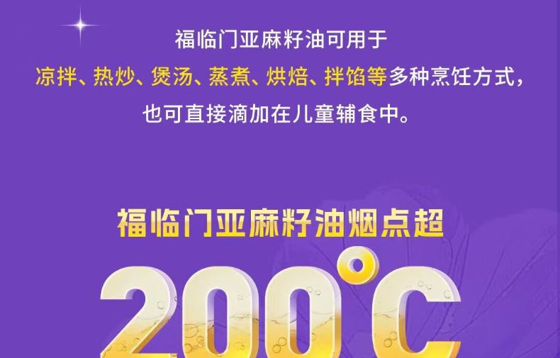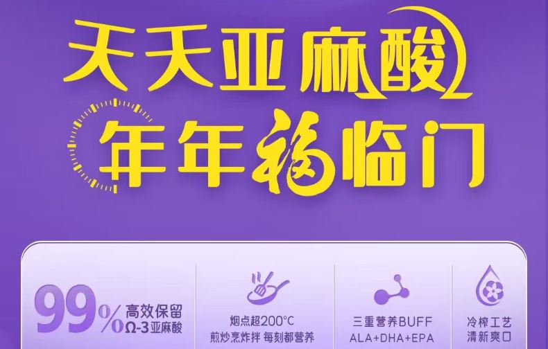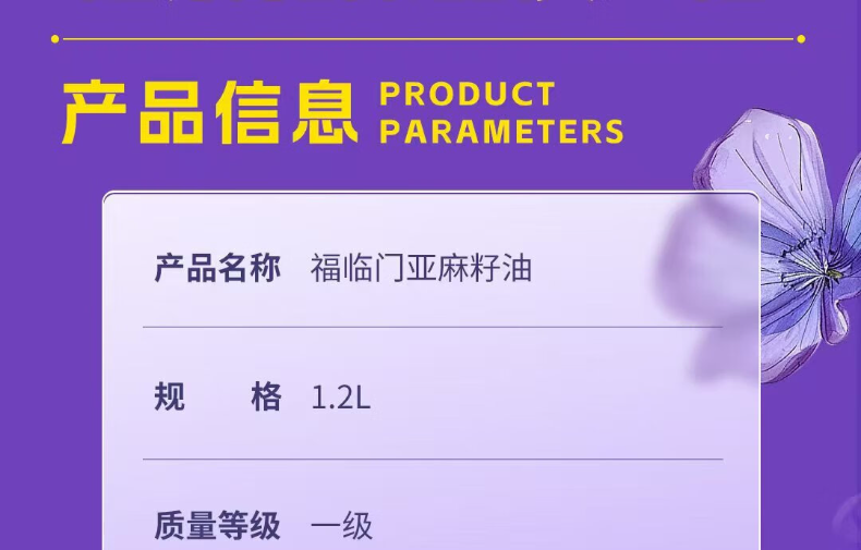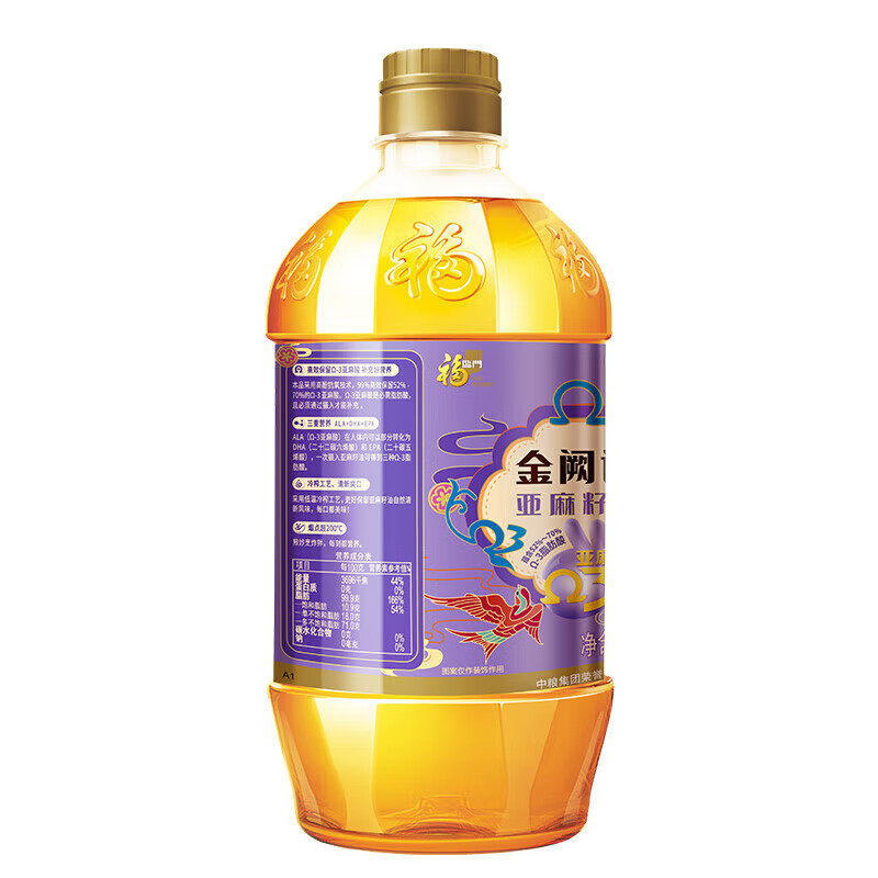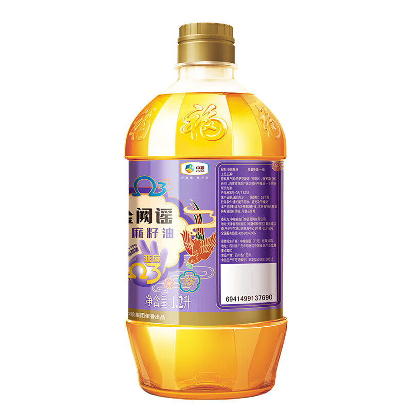 净含量:2.4L 配置组合:福临门金阙谣亚麻籽油1.2L*2瓶 条形码:6941499137690 开票税率:9% 产品卖点: 央企品质 + 高 Ω-3 营养:中粮全产业链管控,优选核心产区亚麻籽,α- 亚麻酸含量超 50%,守护心脑健康,营养更安心。 低温冷榨锁鲜 + 适配广:一级工艺保留天然清香与维生素 E,烟点超 200℃,煎炒烹炸、凉拌皆可,油烟少不呛鼻。 1.2L*2 礼盒 + 体面馈赠:双瓶装满足家用与分享,礼盒设计精致,节庆送礼有面,传递健康与福运。