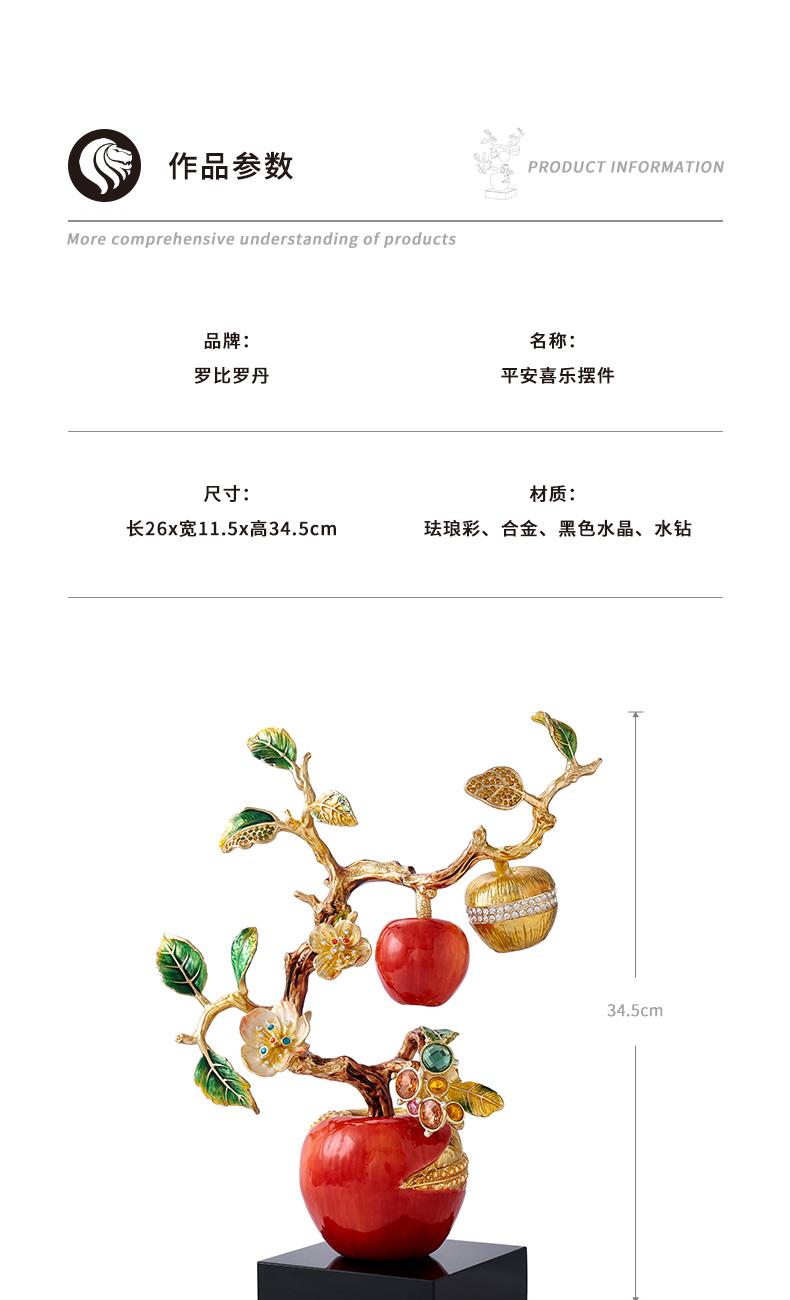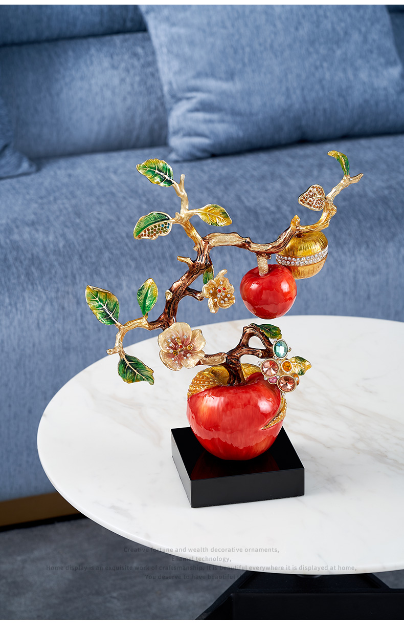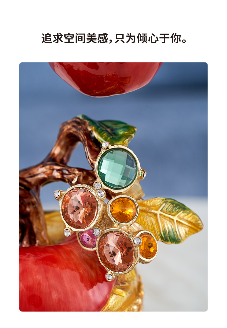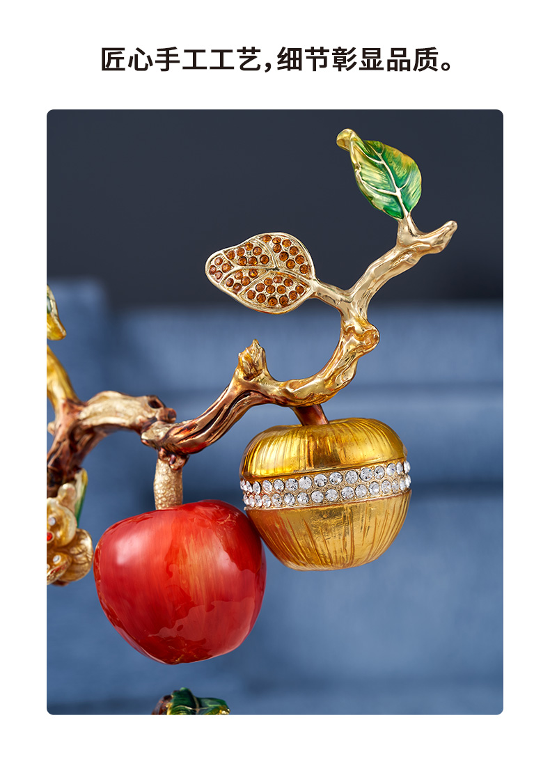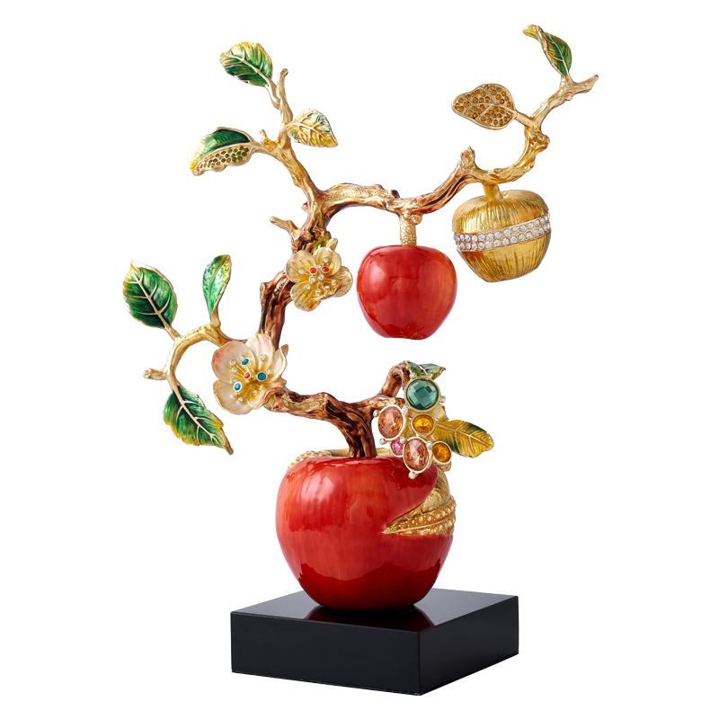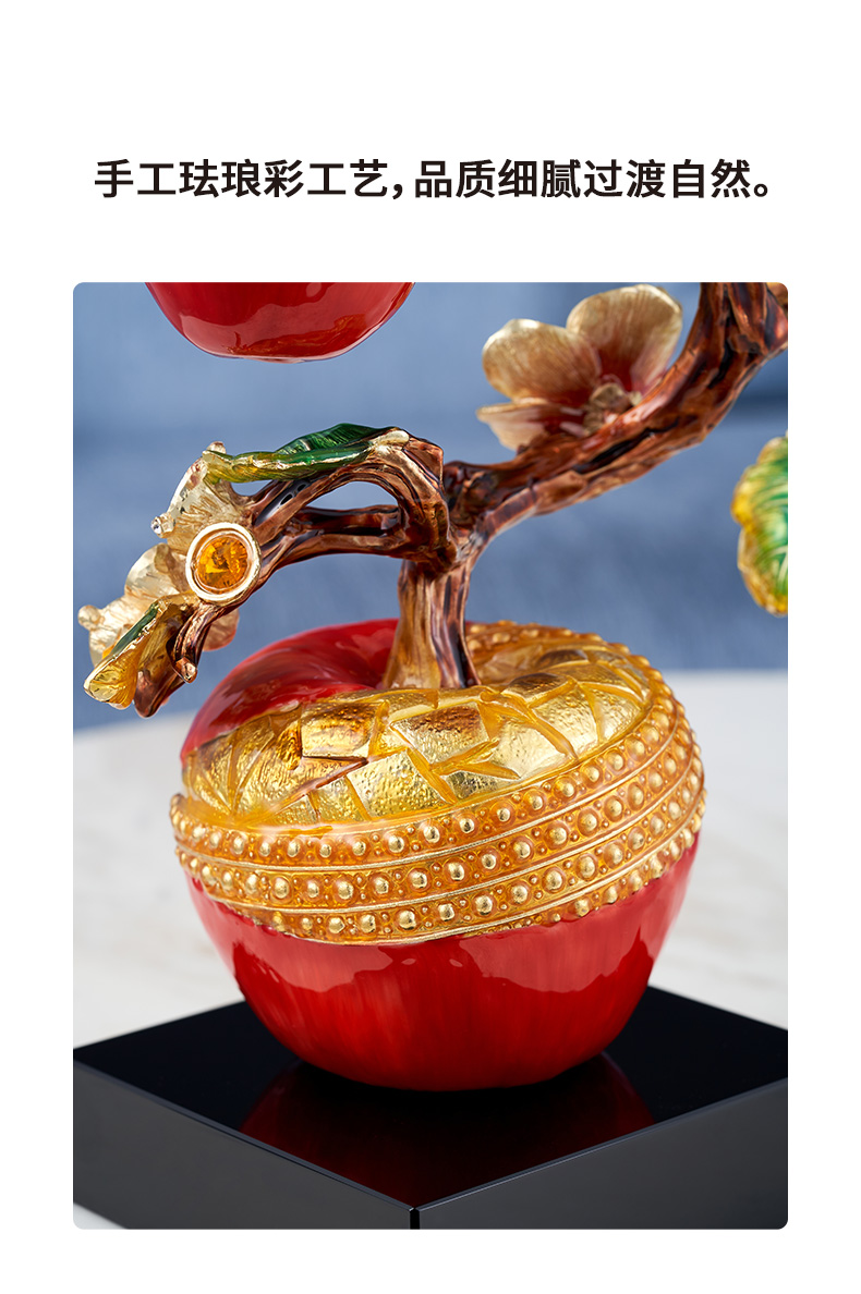 规格:26x11.6x34.5cm 包装:40x31x15cm 摆件灵感源自苹果树,造型典雅奇趣,用色美艳饱满,绿与红的撞色搭配,视觉冲击力更强,辅以金苹果、金花、金叶子,给人以宫廷般金碧辉煌的视觉美感。红彤彤的苹果装饰于果树上,以珐琅彩工艺升华万物之美,还原苹果栩栩如生的色泽,寓意鸿运当头。