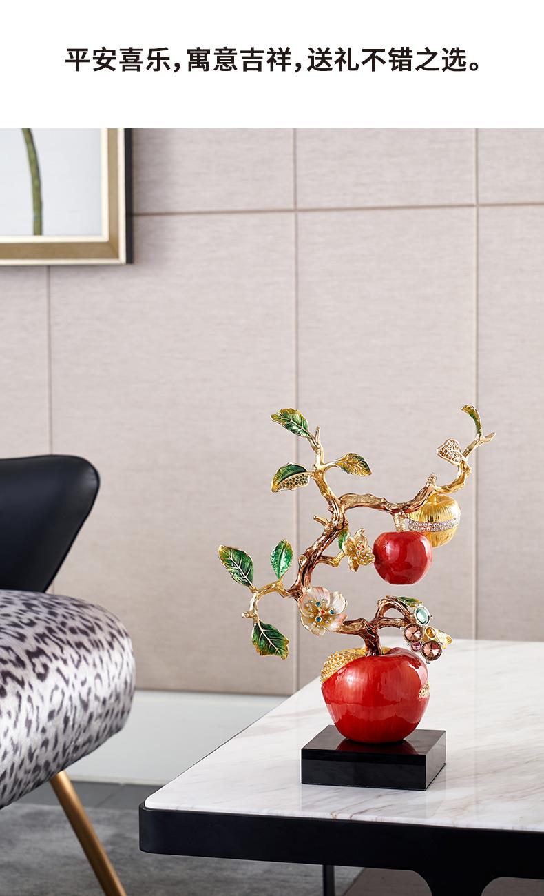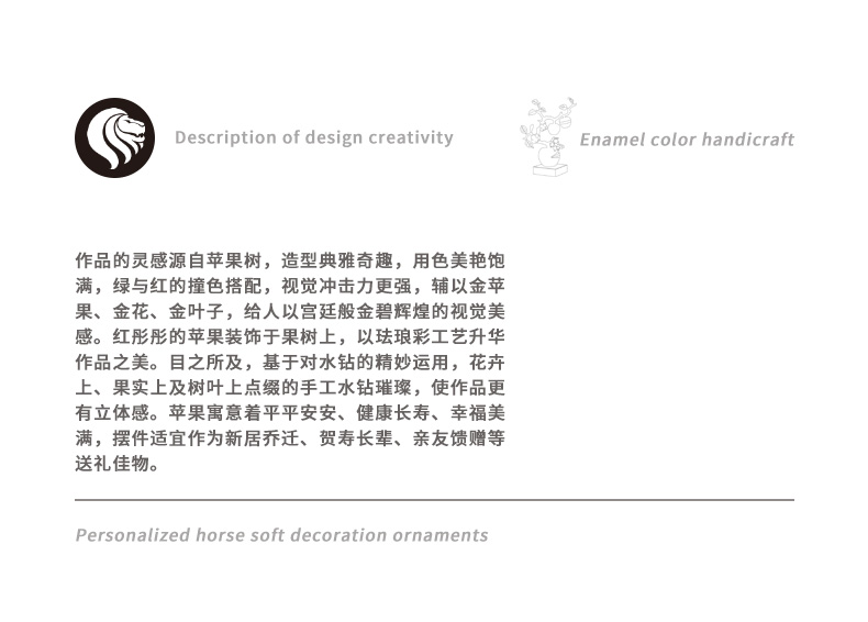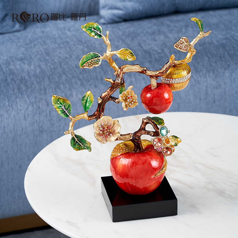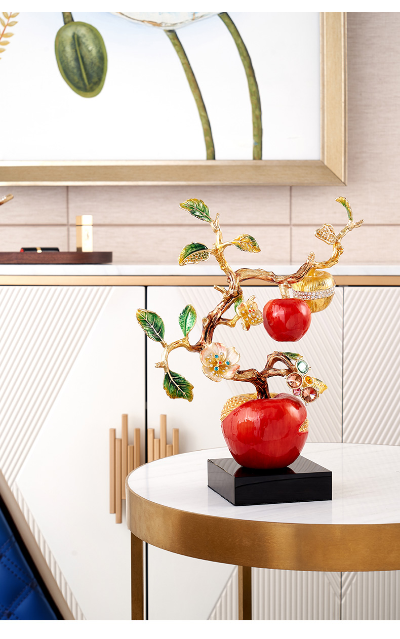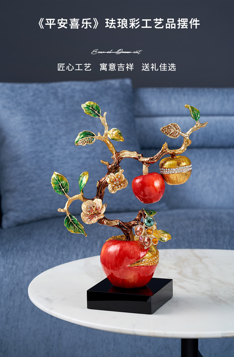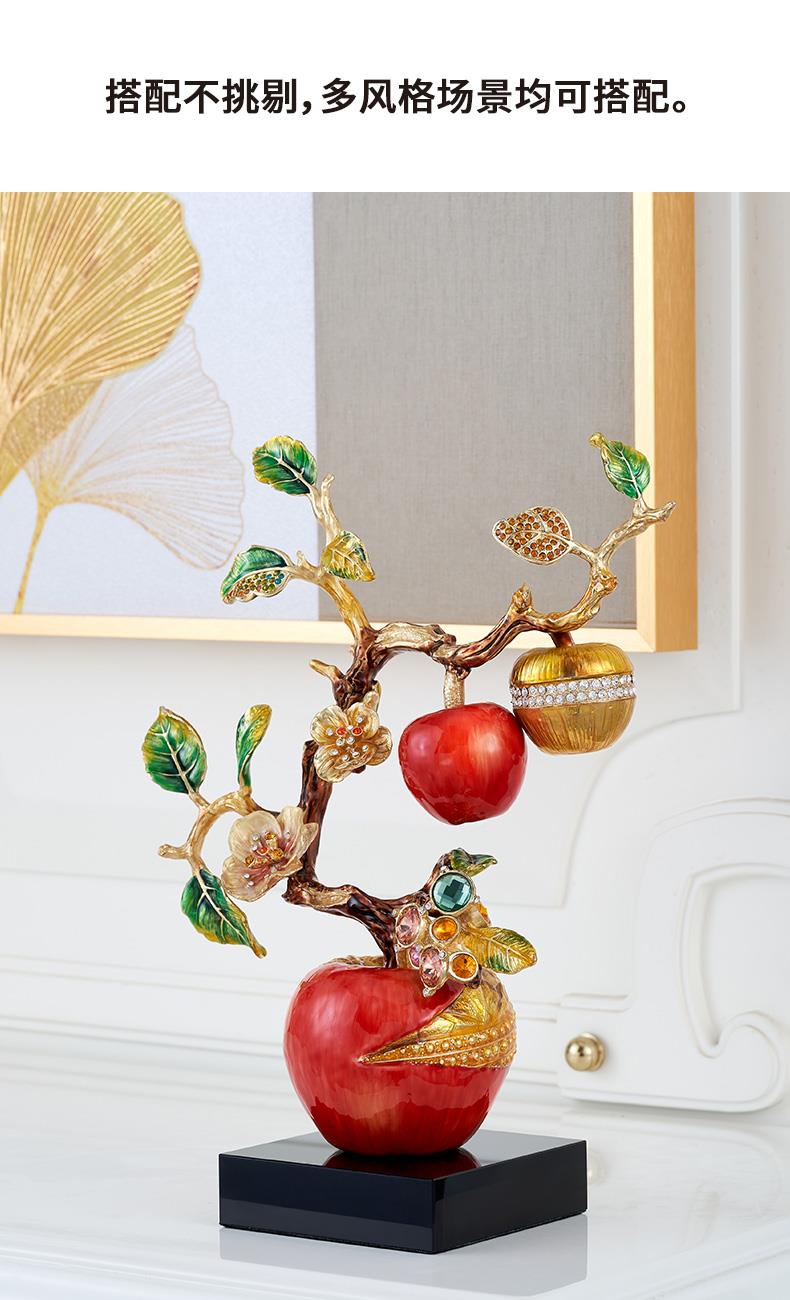 规格:26x11.6x34.5cm 包装:40x31x15cm 摆件灵感源自苹果树,造型典雅奇趣,用色美艳饱满,绿与红的撞色搭配,视觉冲击力更强,辅以金苹果、金花、金叶子,给人以宫廷般金碧辉煌的视觉美感。红彤彤的苹果装饰于果树上,以珐琅彩工艺升华万物之美,还原苹果栩栩如生的色泽,寓意鸿运当头。