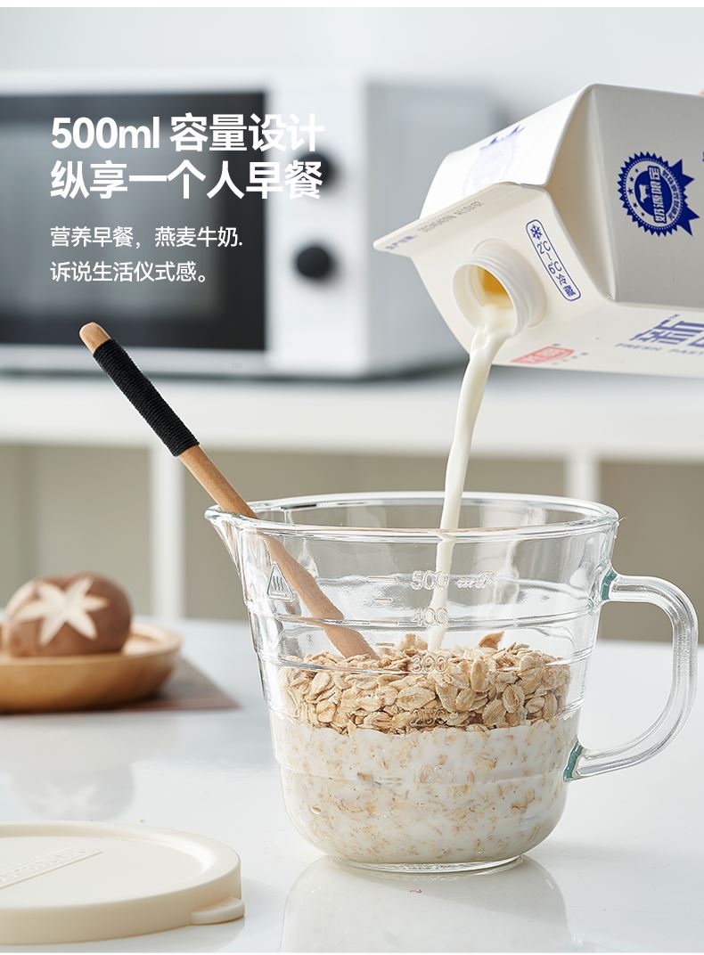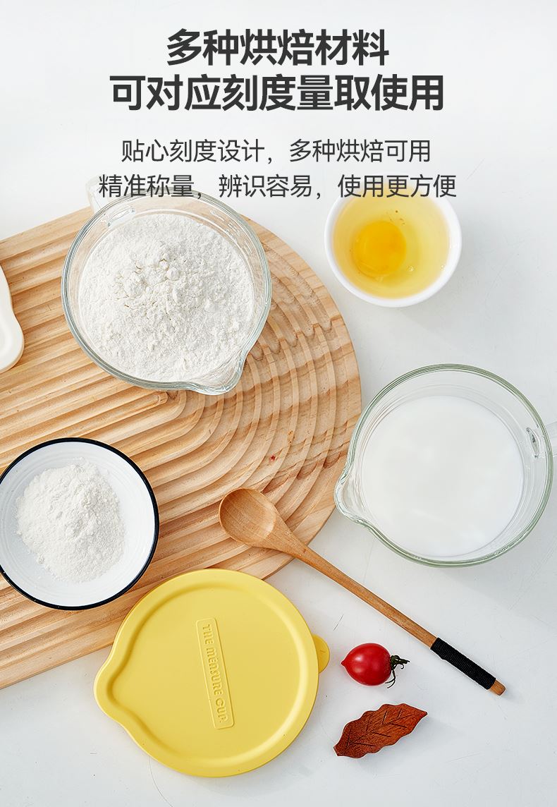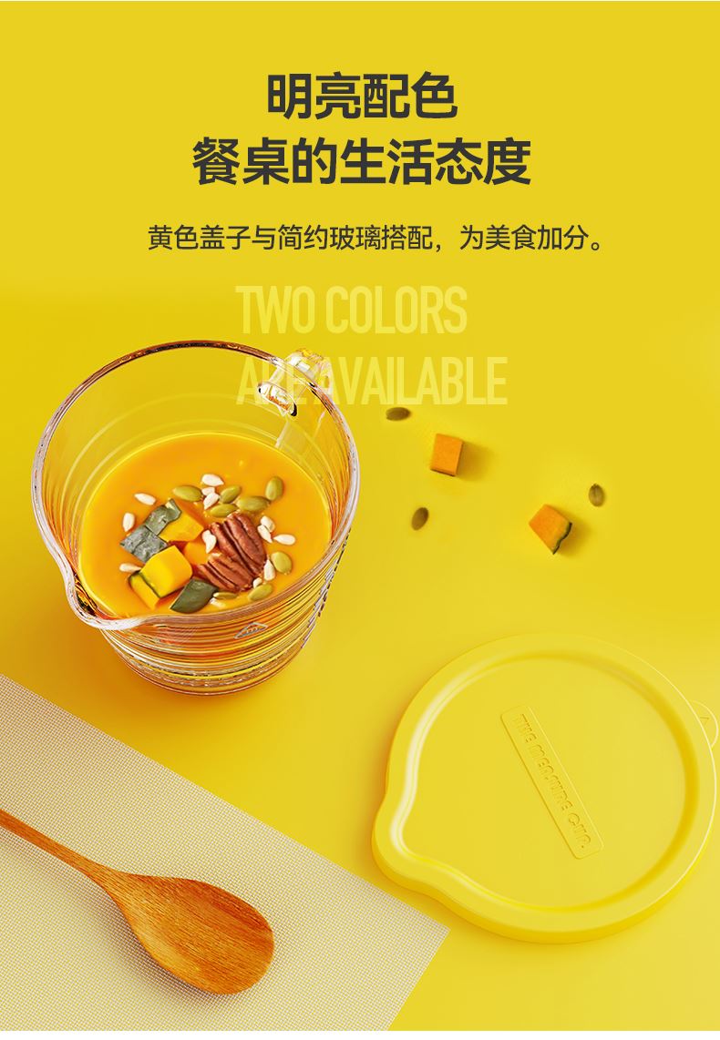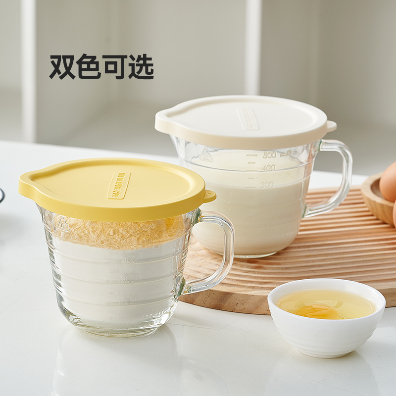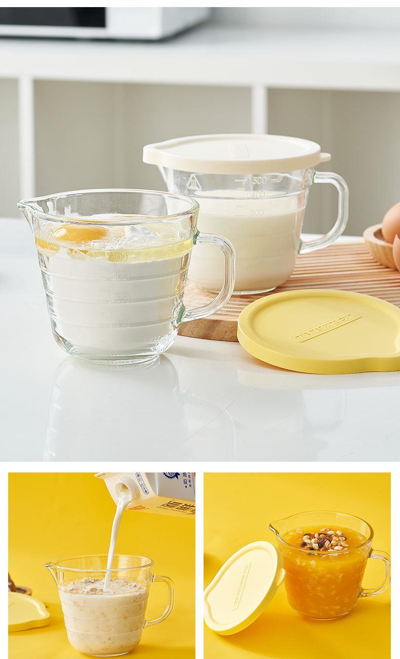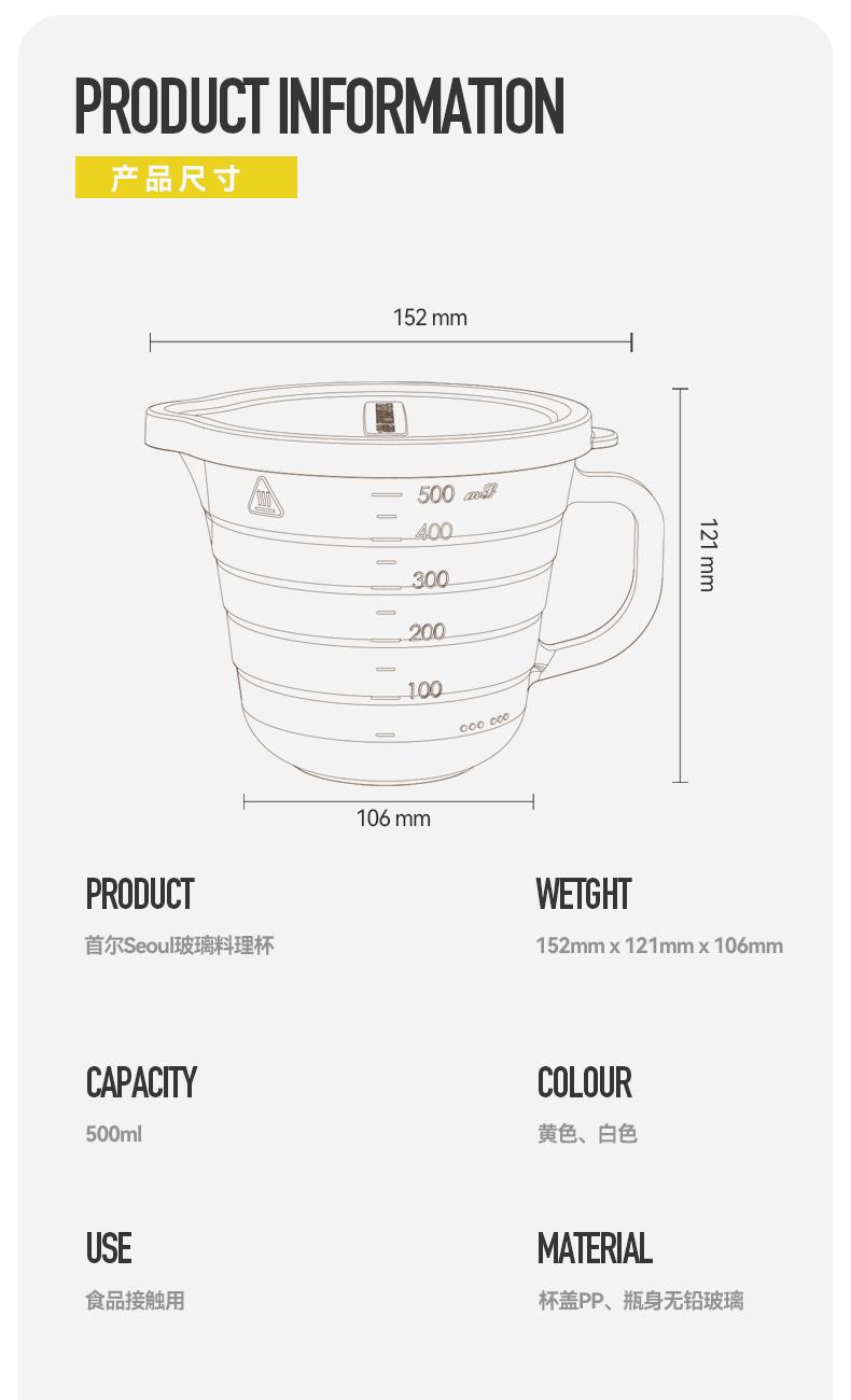 一杯多用轻松料理首尔Seoul玻璃料理杯 黄色盖子与简约玻璃搭配,为美食加分 多种烘焙材料可对应刻度量取使用 贴心刻度设计,多种烘焙可用称量,辨识容易,使用更方便 多种用途,也可以简单的微波炉料理杯使用,家庭必备品。 500ml容量设计,纵享一个人早餐 营养早餐,燕麦牛奶.诉说生活仪式感。 倾斜嘴设计,倾倒液体时流畅方便,更加个性化,使用会更贴心 清晰刻度微波可用,对应各种烹饪需求不再手忙脚乱使用更贴心宽手柄设计 量杯手柄很宽,握感舒适,使用不易脱落: