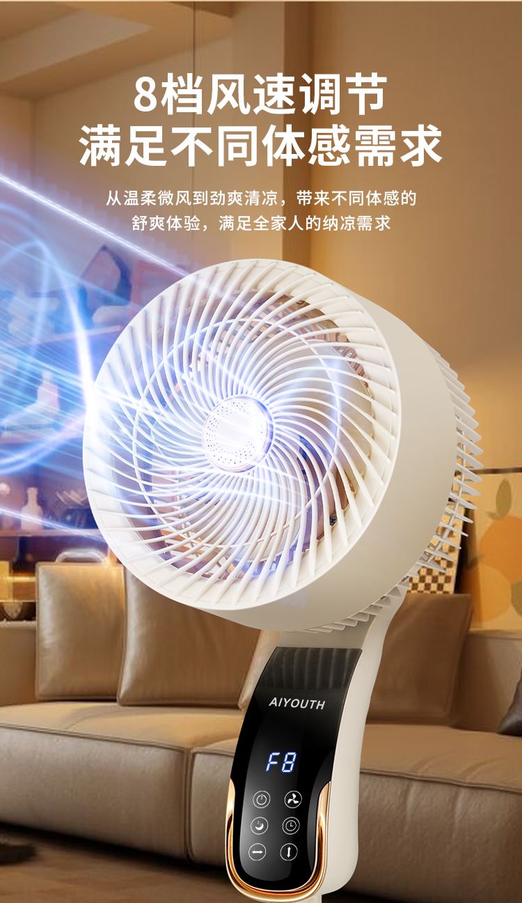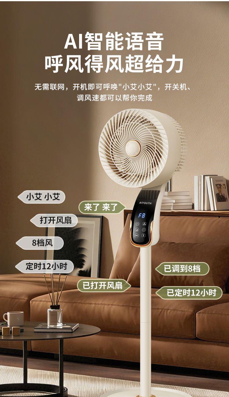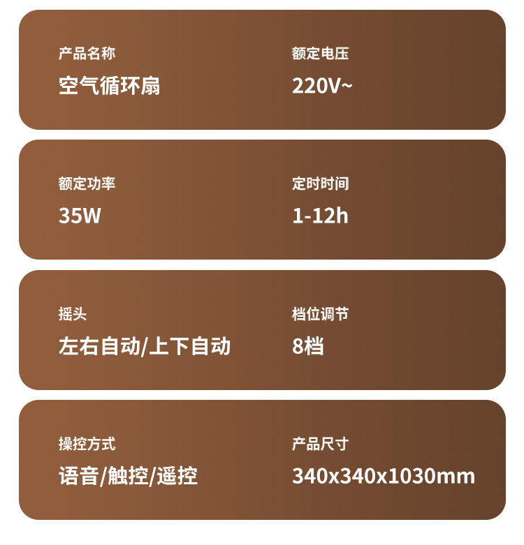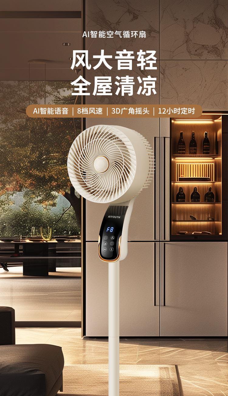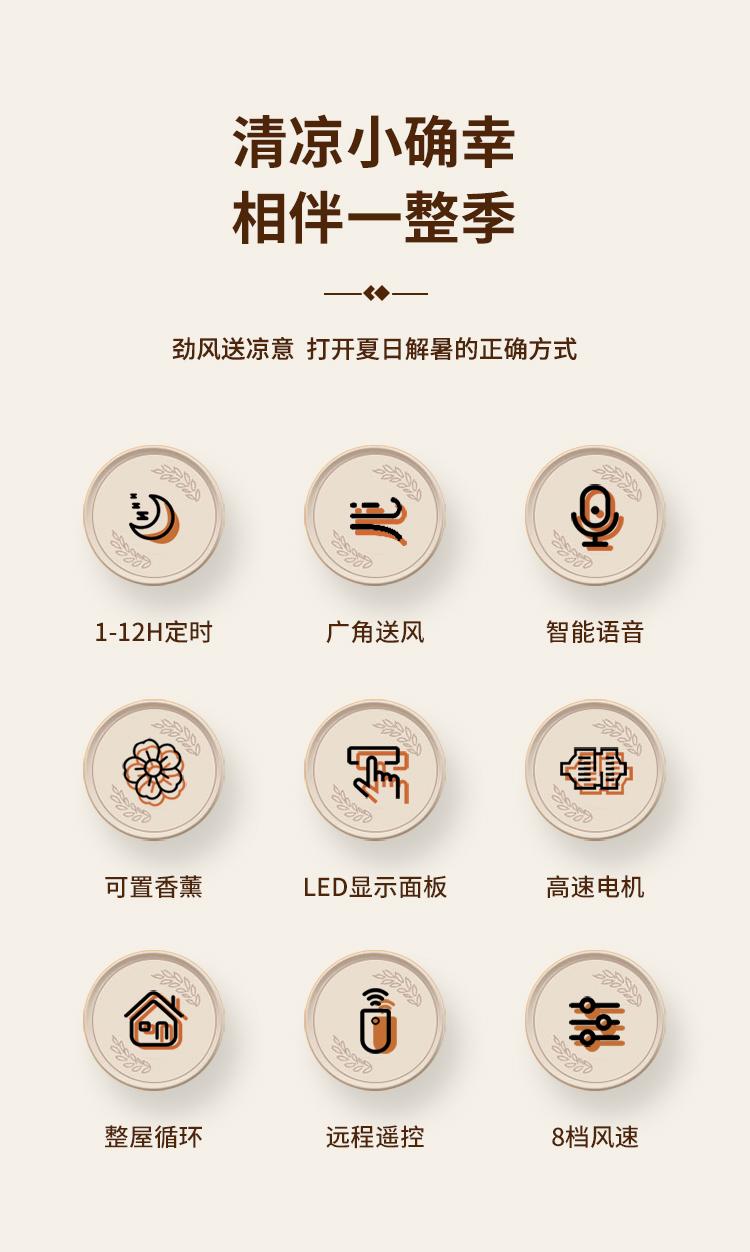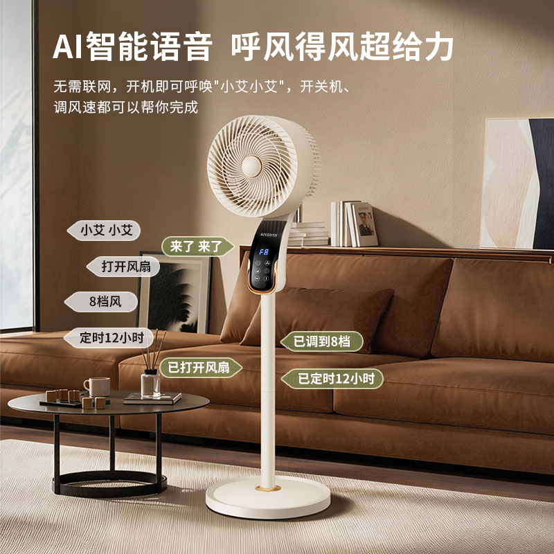 额定电压:220V∽ 额定频率:50Hz 额定功率:35W 产品毛重:3.63kg/台 产品颜色:卡其色 包装尺寸:490*265*350mm 产品档位:8档风速 包装清单:底座、机头、伸缩杆*2、遥控、说明书 主要材质:PP 1.LED触控面板,直观操控,灵敏响应 2.8档风速可调,柔风至强风,适配多场景需求 3.智能语音交互,解放双手,老人小孩轻松使用 4.三重操控系统:语音、遥控、LED触屏,随心选择 5.内置香薰功能,送风同时清新空气,升级使用体验 6.台地两用设计,三档高度调节,桌面/落地自由切换