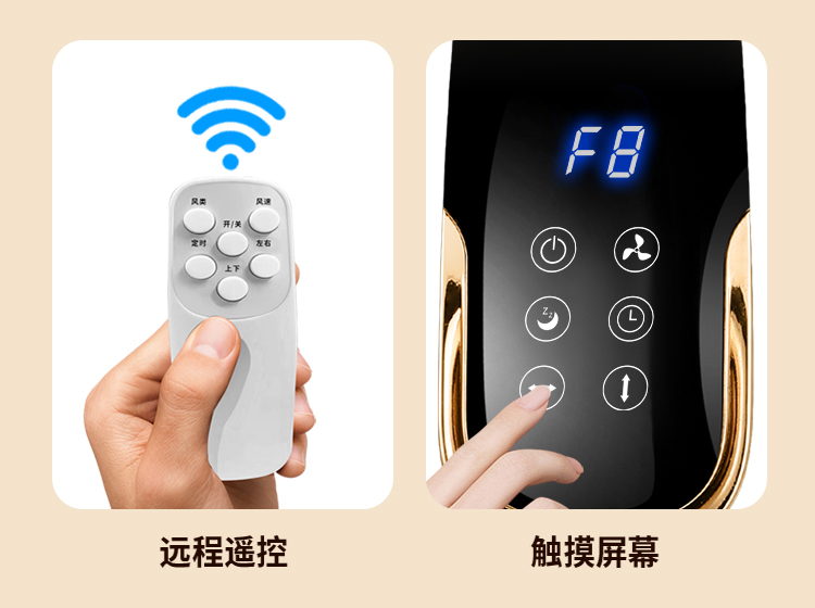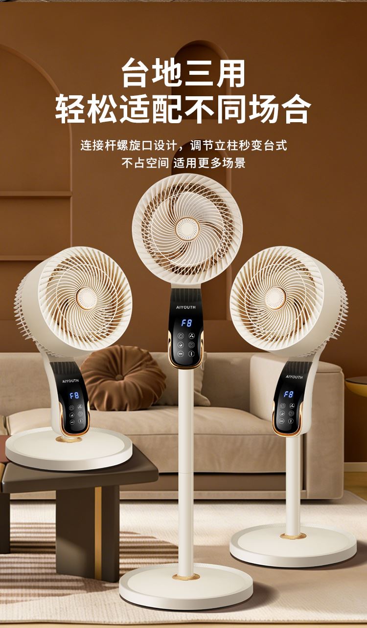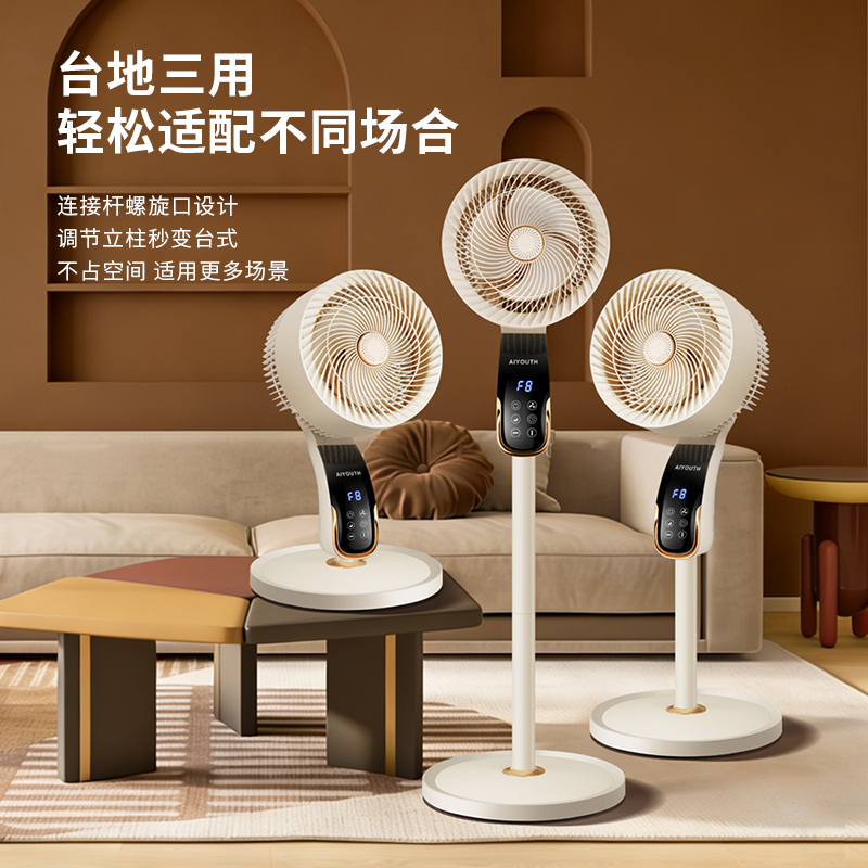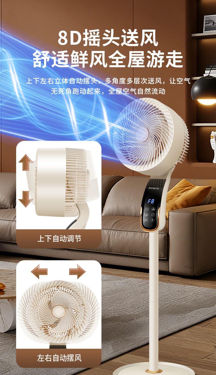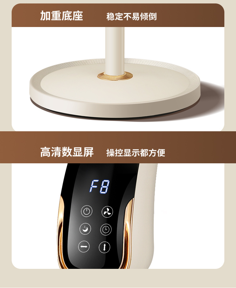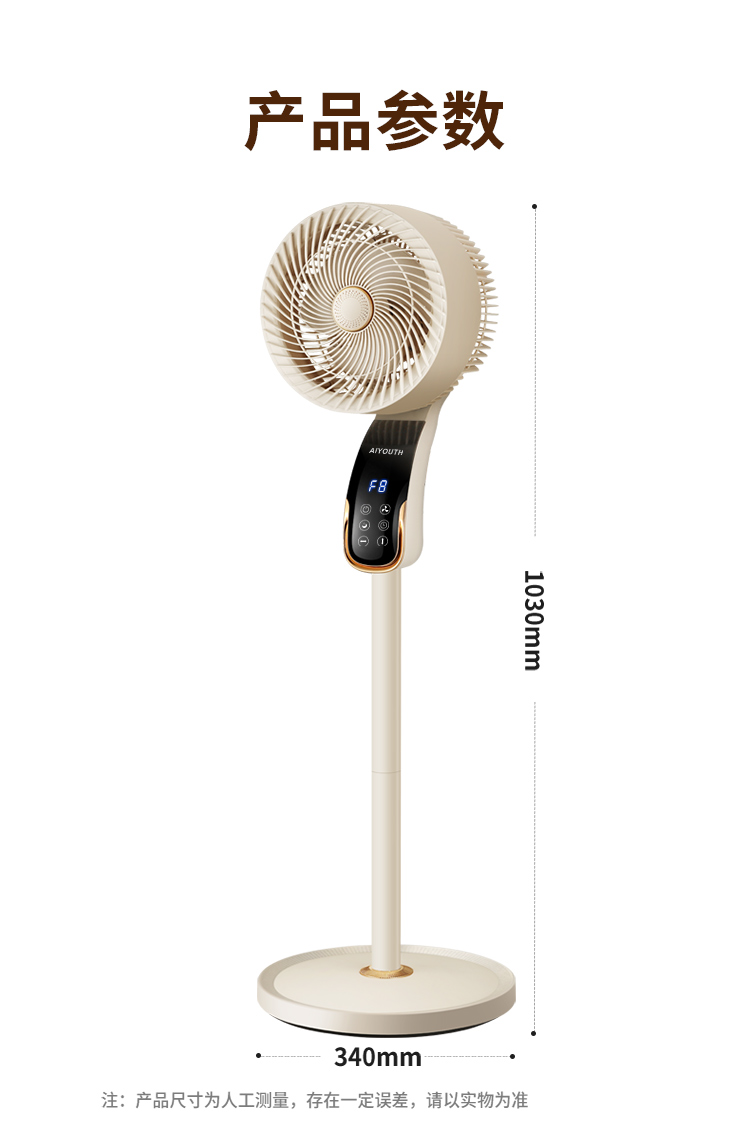 额定电压:220V∽ 额定频率:50Hz 额定功率:35W 产品毛重:3.63kg/台 产品颜色:卡其色 包装尺寸:490*265*350mm 产品档位:8档风速 包装清单:底座、机头、伸缩杆*2、遥控、说明书 主要材质:PP 1.LED触控面板,直观操控,灵敏响应 2.8档风速可调,柔风至强风,适配多场景需求 3.智能语音交互,解放双手,老人小孩轻松使用 4.三重操控系统:语音、遥控、LED触屏,随心选择 5.内置香薰功能,送风同时清新空气,升级使用体验 6.台地两用设计,三档高度调节,桌面/落地自由切换