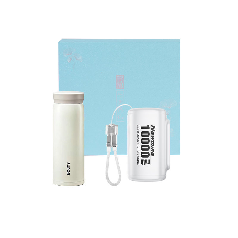 产品型号:26072 产品组合:苏泊尔保温杯280ml+纽曼22.5W快充迷你移动电源 保温杯:280ml 移动电源:10000AN 22.5W快充 材质:不锈钢316L、PC 包装:精装礼盒
